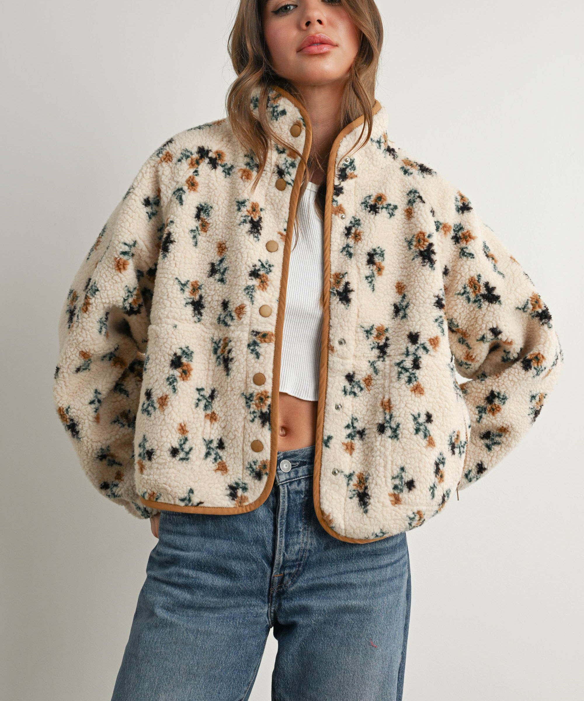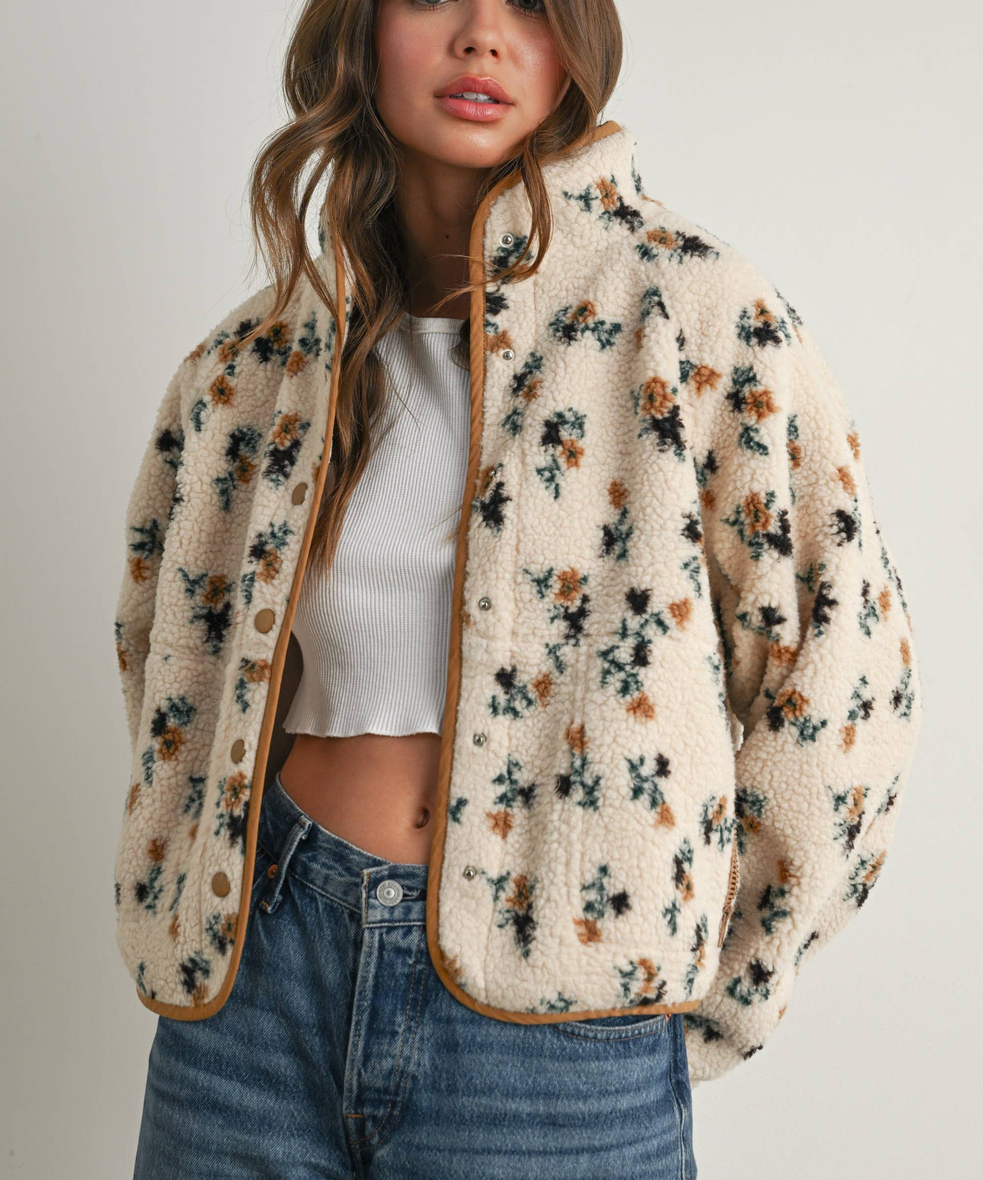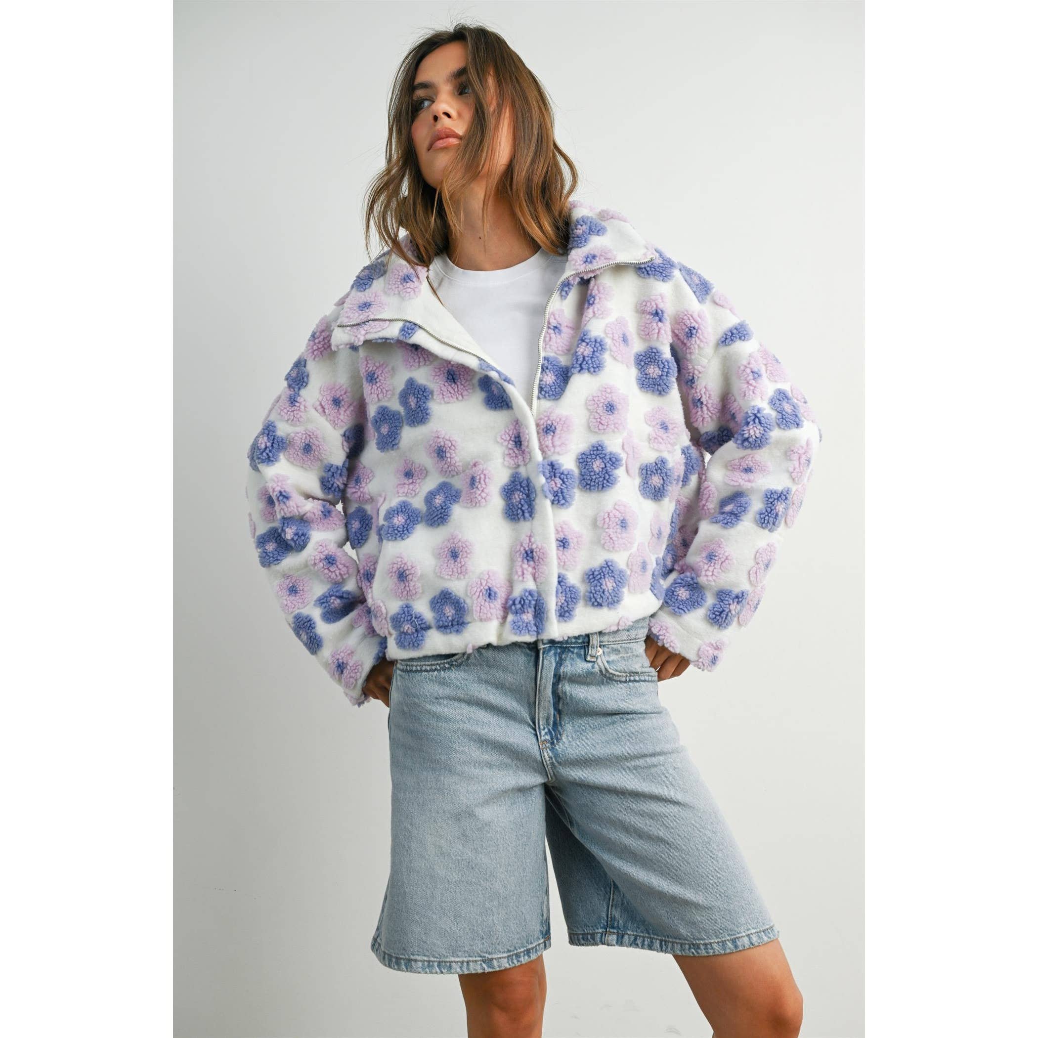 Collared Floral Zip-Front Sherpa Jacket
