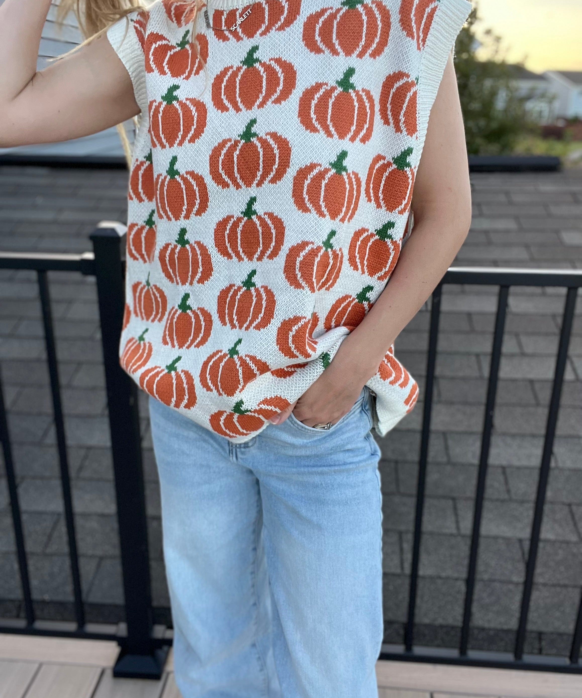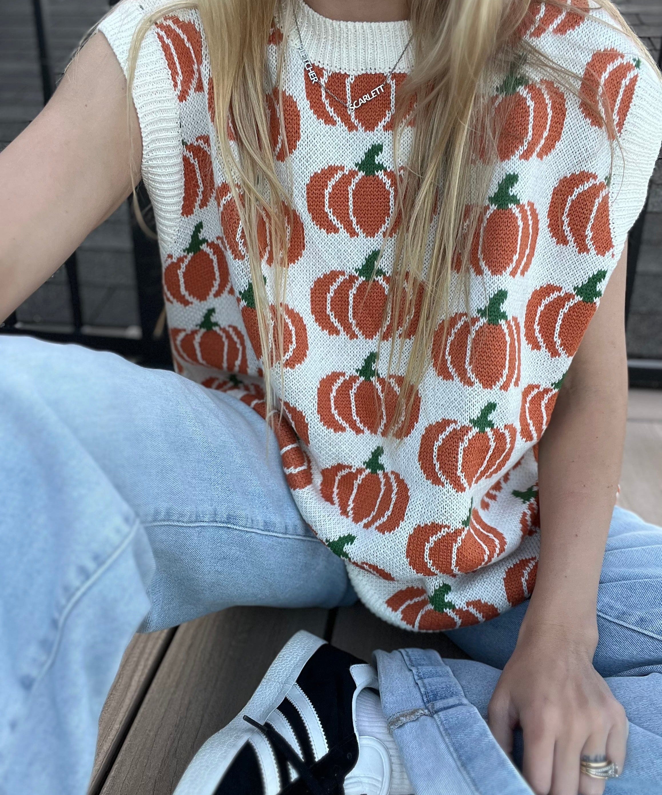 Pumpkin Print Sleevless Sweater Knit Top