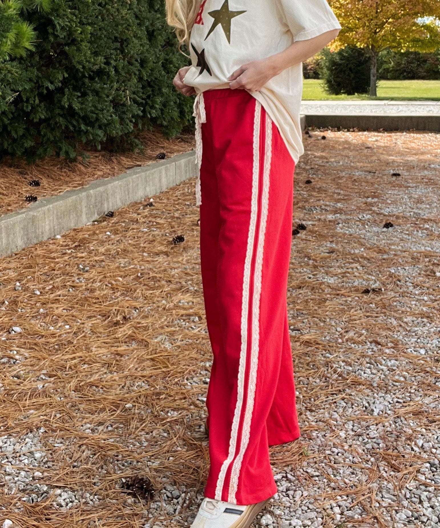 LACE STRIPED ELASTIC WAIST TERRY SWEATPANTS