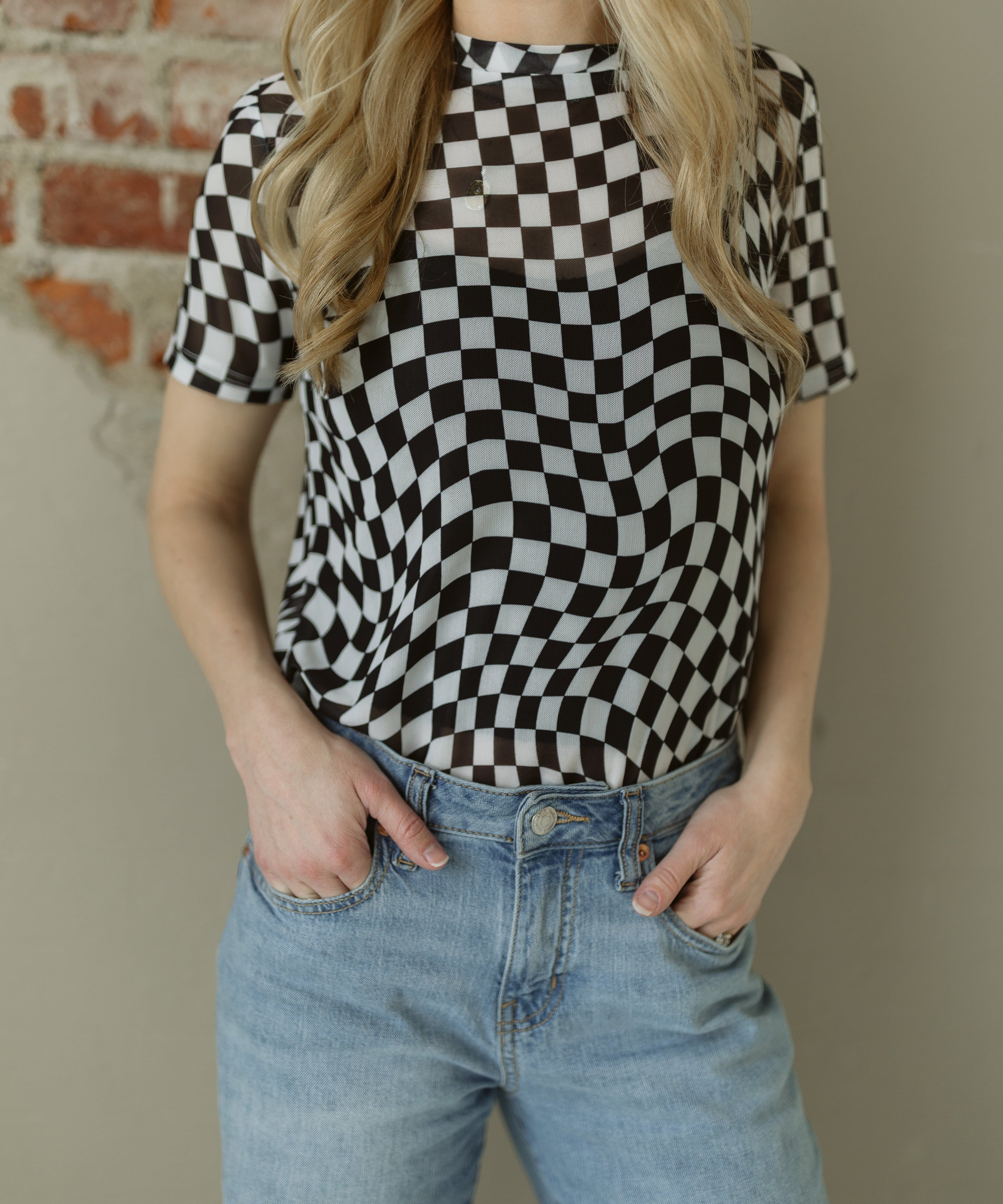 Checkered Print Mock Neck Mesh T Shirt