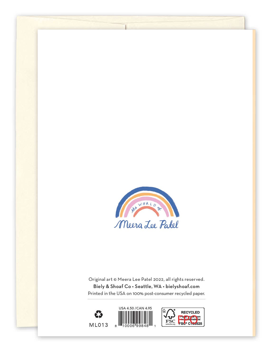 Card is blank inside. • Size: A6, 4.6" x 6.4" • Treatment: Gold foil • Illustrated by Meera Lee Patel • Full-color inside • Envelope color: White • Printed in the USA on high-quality recycled post-consumer waste paper • Pre-priced • By default cards come without cello packaging. Please message us for cello options. About The Artist: Meera Lee Patel is a self-taught writer and artist who believes that anything is possible. She is the author of My Friend Fear: Finding Magic in the Unknown, a beautiful meditation on fear and how it can help guide us to become who we really are. She is also the author of two journals for self-exploration, Start Where You Are and Made Out of Stars.