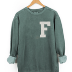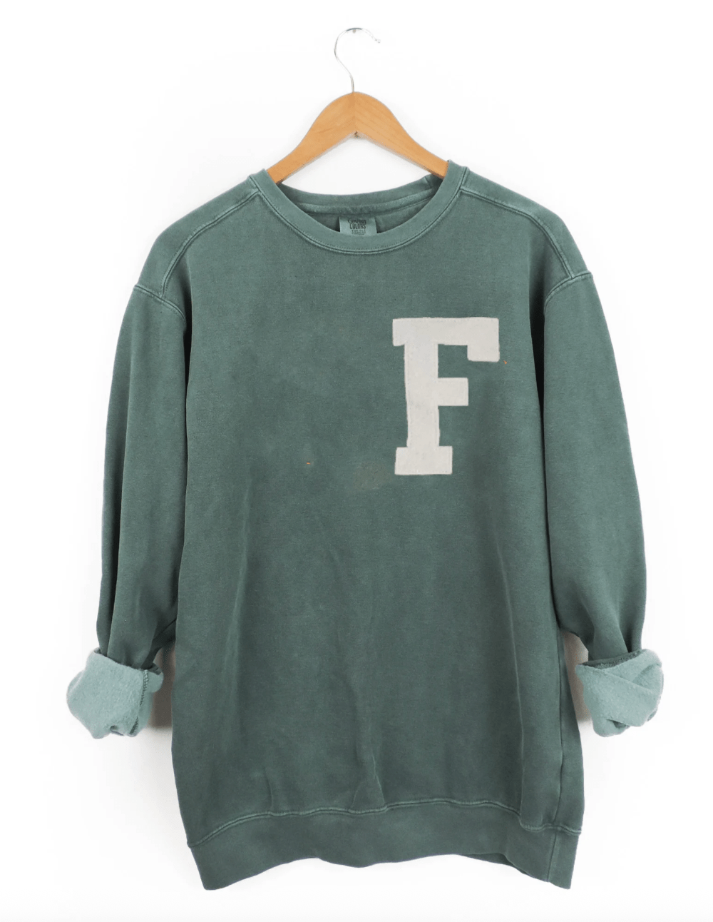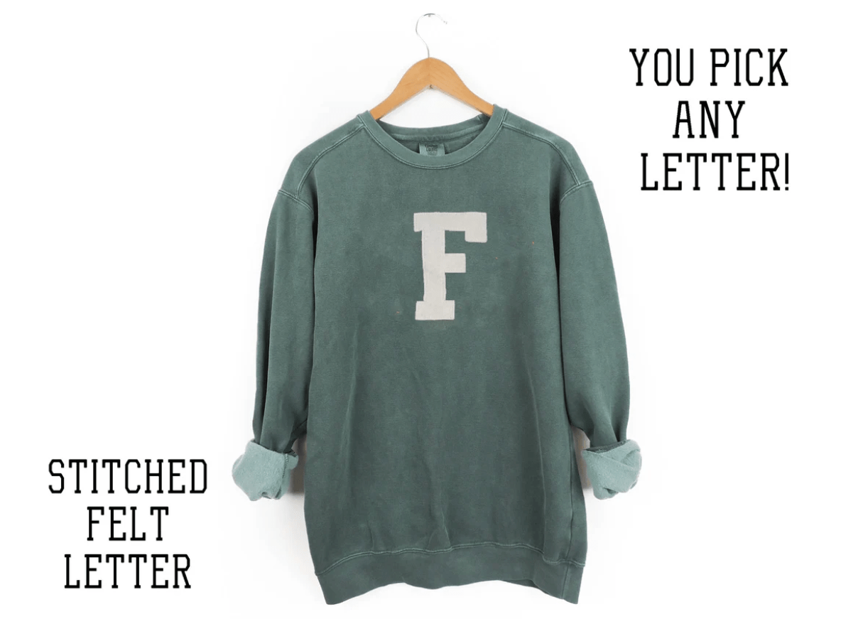 This varsity letter initial crewneck can feature any letter or number you would like. The letters are cut out of felt and stitched on with a sewing machine.