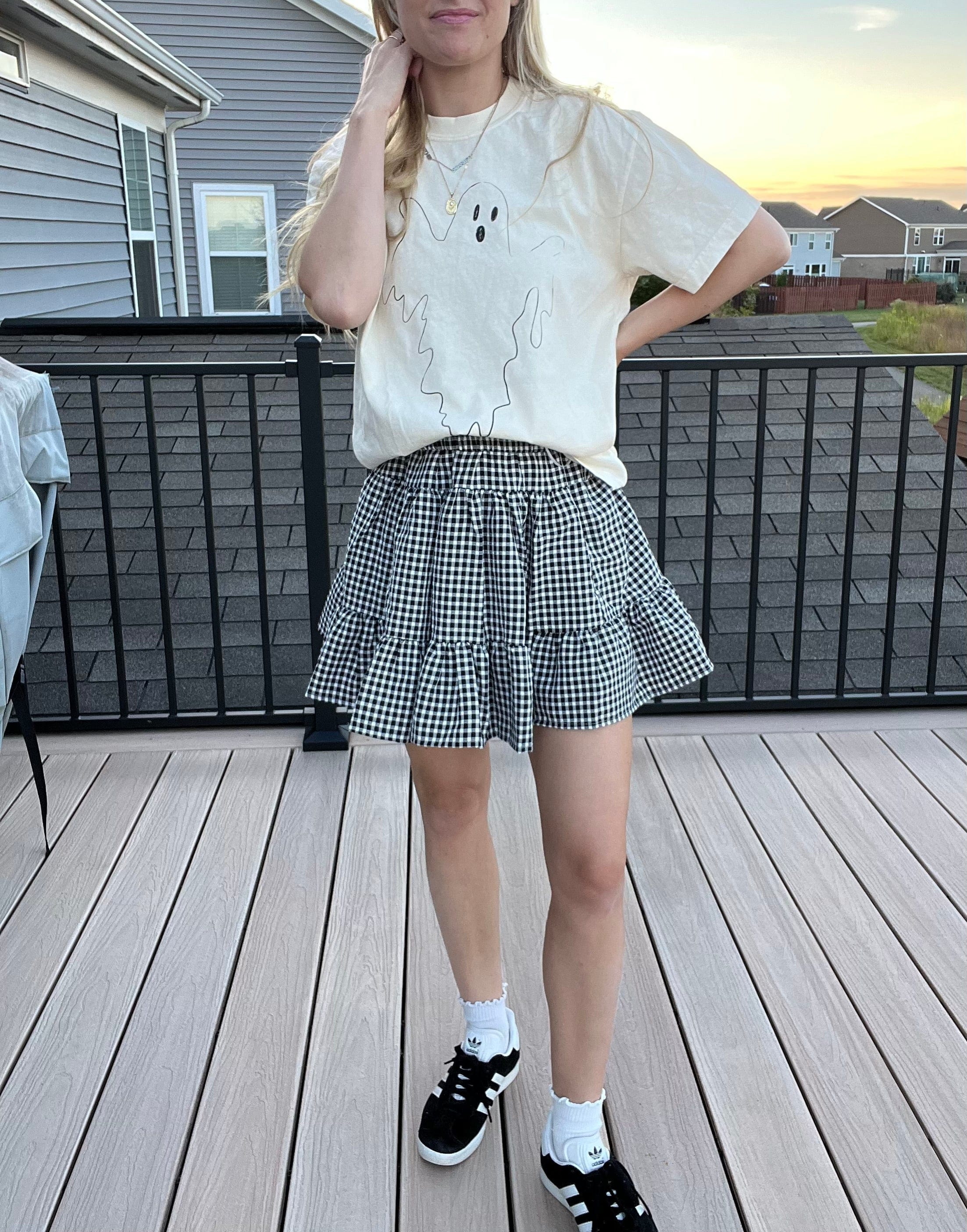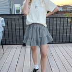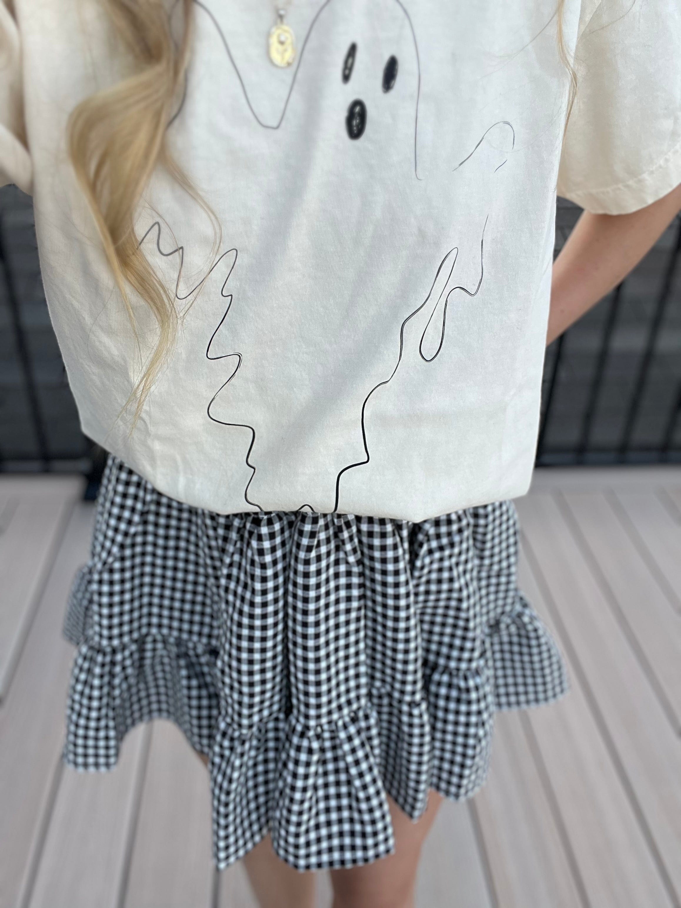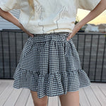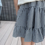 A playful yet classic mini skirt featuring a timeless black and white gingham print. Designed with a comfortable elastic waistband, it offers an easy, flattering fit that pairs effortlessly with tucked-in tees or sweaters. The tiered ruffle hem adds a feminine touch and gives the skirt a flirty, flowy silhouette—perfect for everyday wear or styled up for seasonal festivals. Lightweight and versatile, this piece brings a mix of casual charm and chic detail to any wardrobe.