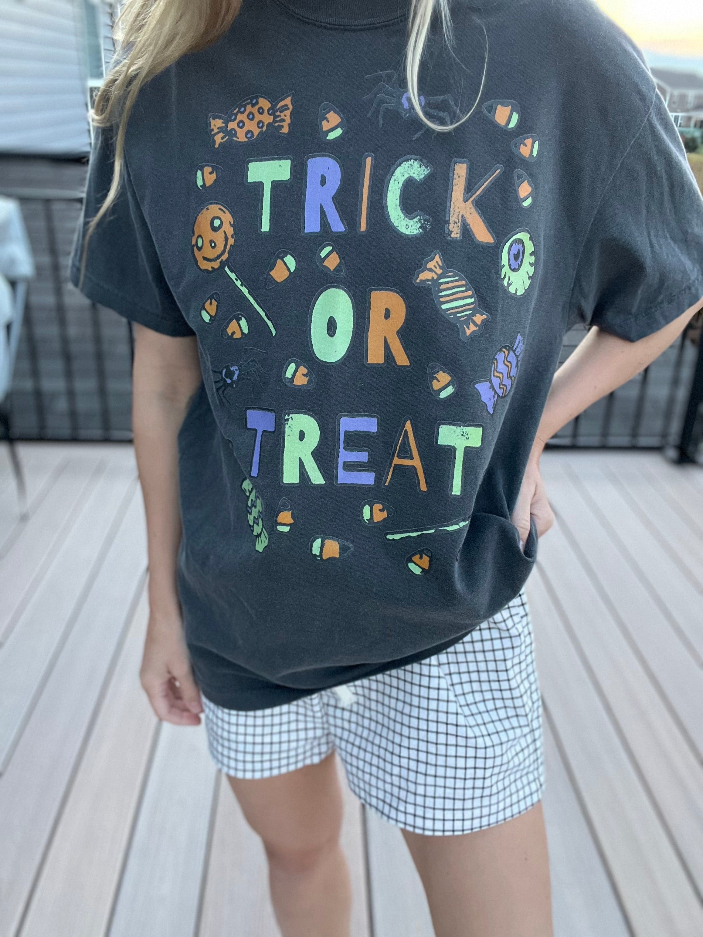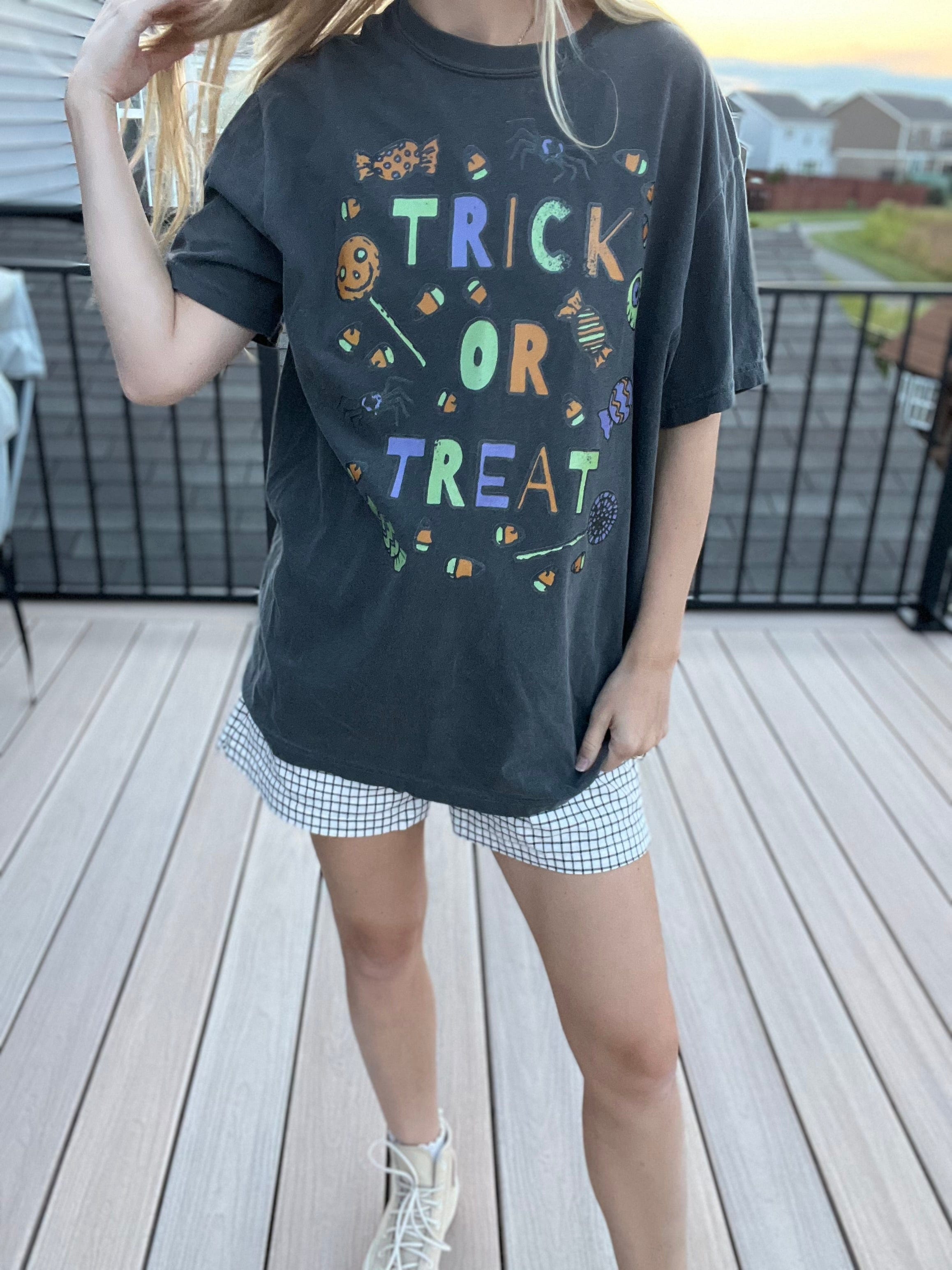 Comfort Colors trick or treat tee. Runs true to size but size up for an oversized fit.