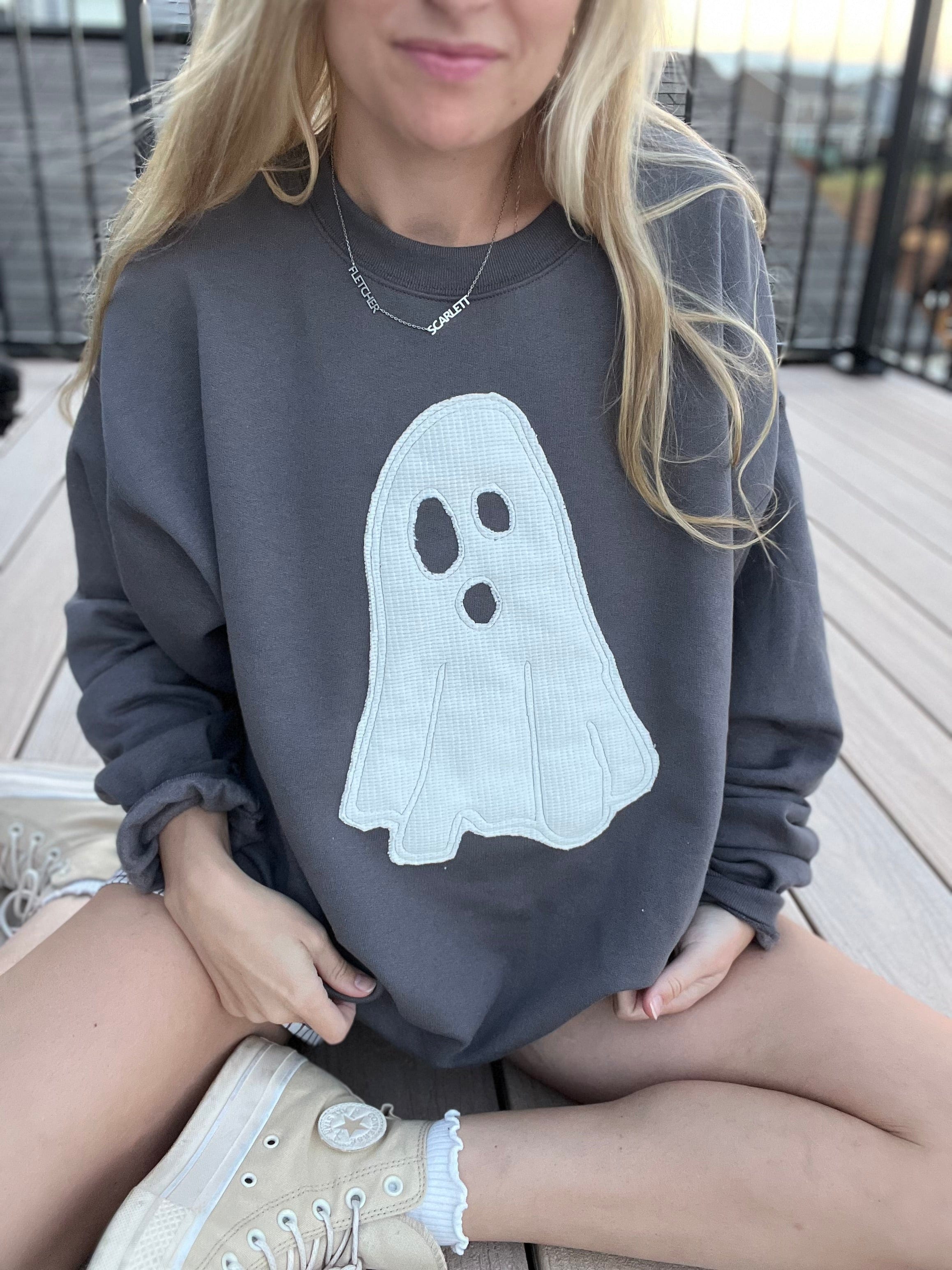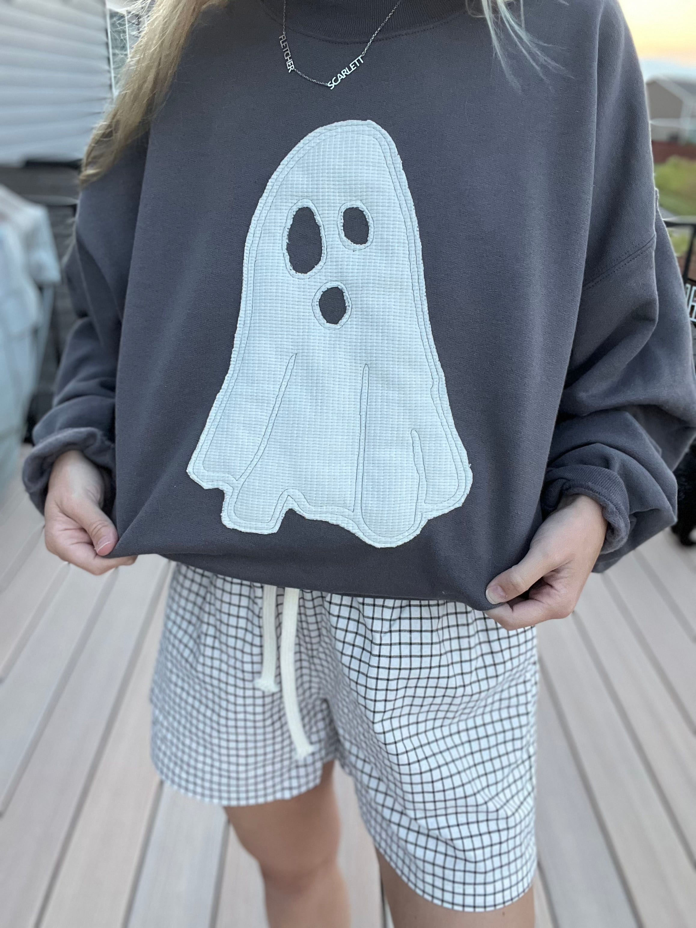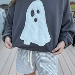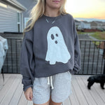 Charcoal Grey Sweatshirt with an applique ghost in a waffle knit fabric. Runs true to size but size up for an oversized fit.