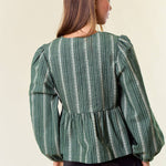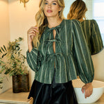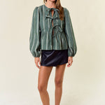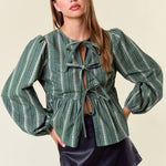 This corduroy blouse features soft tribal-striped fabric and romantic puff sleeves. It has a unique bow tie front and a flattering peplum shape. Designed for comfort and style, it’s perfect for adding a touch of elegance to your everyday look.
