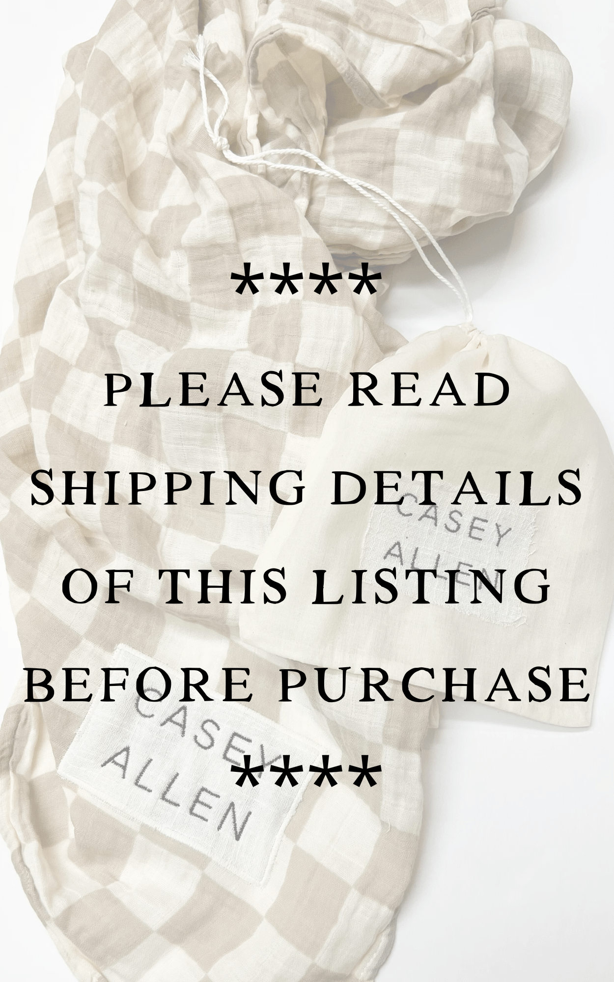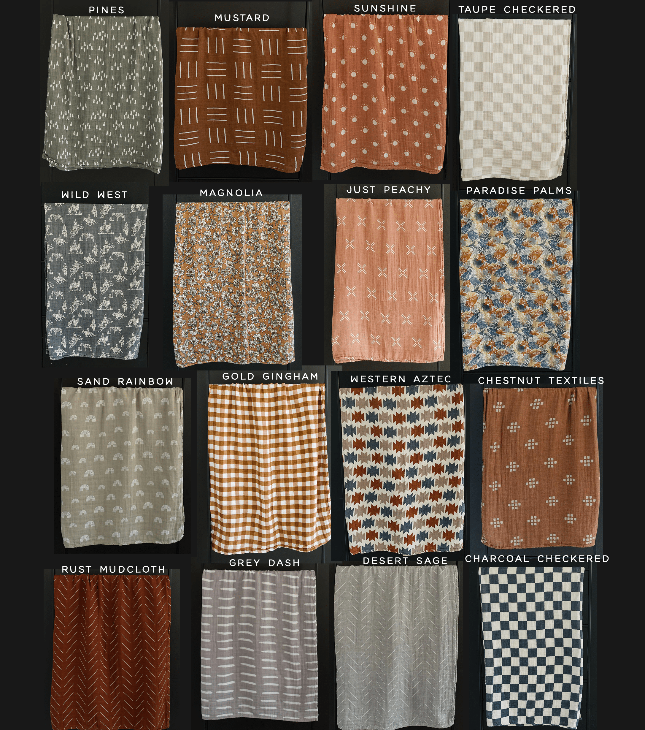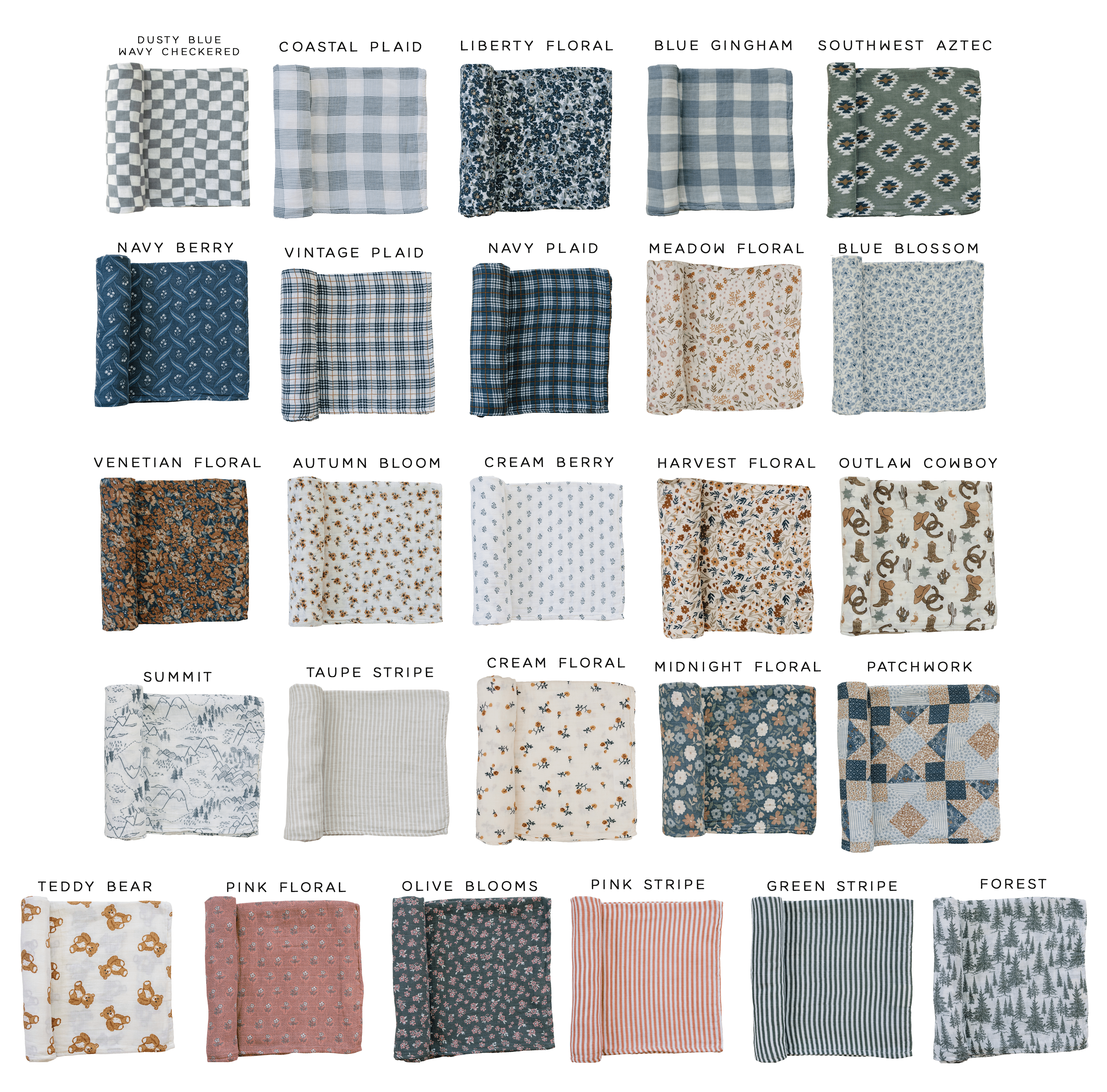 This is a custom name muslin baby swaddle with many patterns to pick from. It measures 47 in x 47 in and is 100% cotton. Comes in a drawstring bag with the custom name on it. Names are embroidered on the blanket.