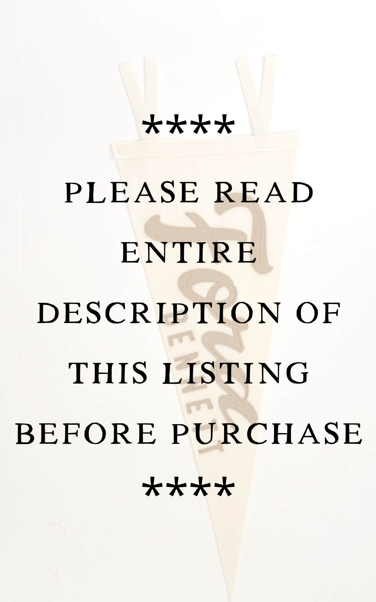 These felt pennants are completely customizable. They measure 10in x 29in (including tabs). The ties and band are sewn on with white thread and you have the option of having the letters sewn as well. Letters will have white thread as well. See below or view photos for order instructions.