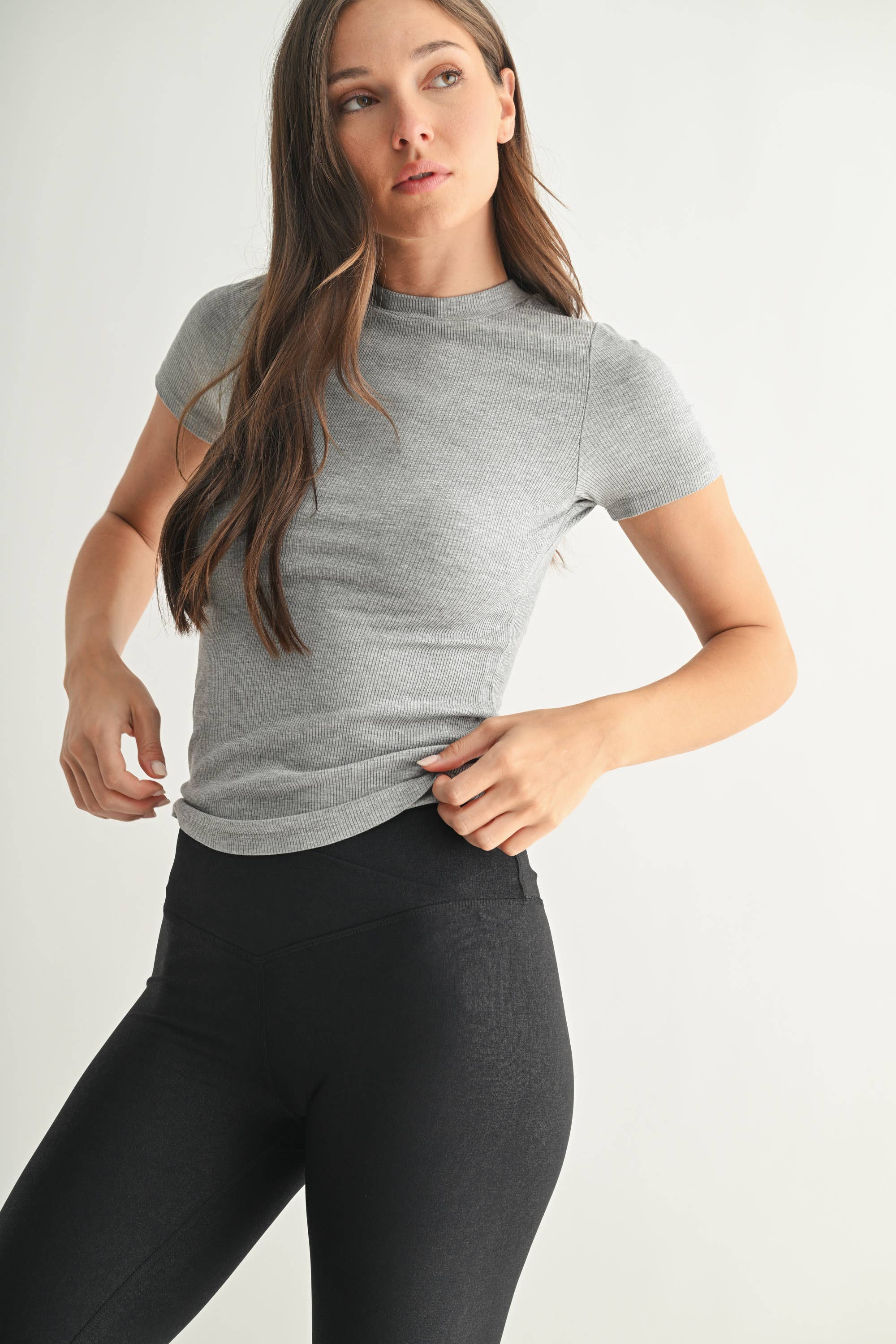 The perfect short sleeve top. Crafted from a rayon-spandex blend fabric with micro ribbing, this short sleeve top has a full coverage length, a rounded neckline, and a fitted silhouette.