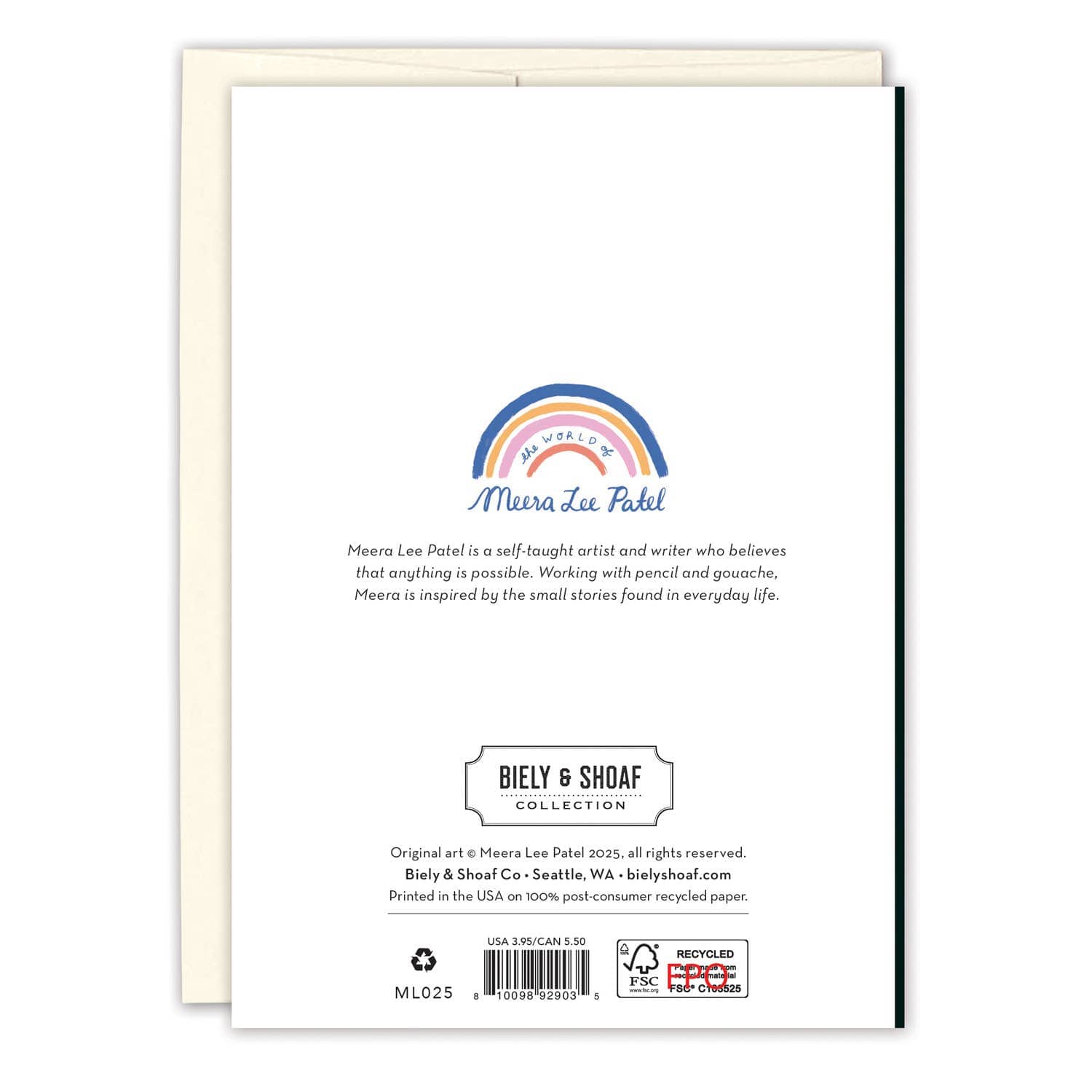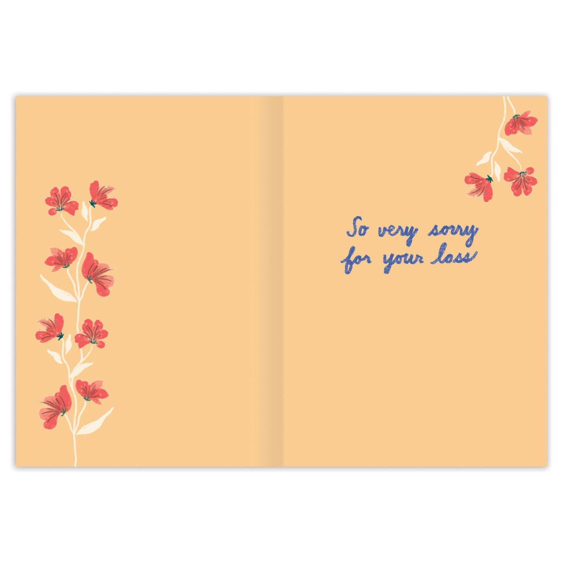 Inside verse: So very sorry for your loss • Illustrated by Meera Lee Patel • Pre-priced • By default cards come without cello packaging. Cello can be added to your order using our cello product listing. Message us for free cello on your first order! • Full color inside • Size: A6, 4.5" x 6.25" • Paired with a warm white envelope • Printed in the USA on high-quality, FSC certified 100% post-consumer recycled paper About the artist: Meera Lee Patel is a self-taught writer and artist who believes that anything is possible. She is the author of My Friend Fear: Finding Magic in the Unknown, a beautiful meditation on fear and how it can help guide us to become who we really are. She is also the author of two journals for self-exploration, Start Where You Are and Made Out of Stars. Working in pencil and gouache, Meera is inspired by the small stories found in everyday life. Front of card features whimsical floral bouquet artwork with greeting: Thinking of you