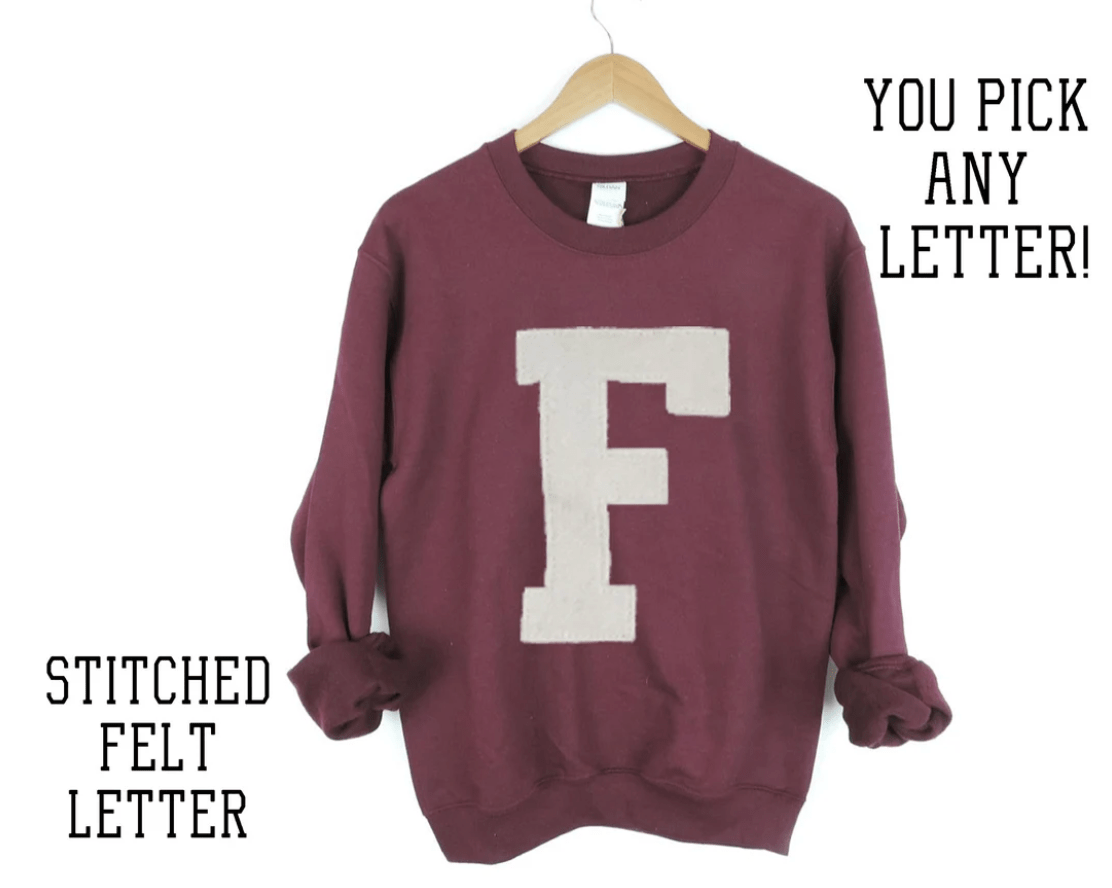 This varsity letter initial crewneck can feature any letter or number you would like. The letters are cut out of felt and stitched on with a sewing machine.