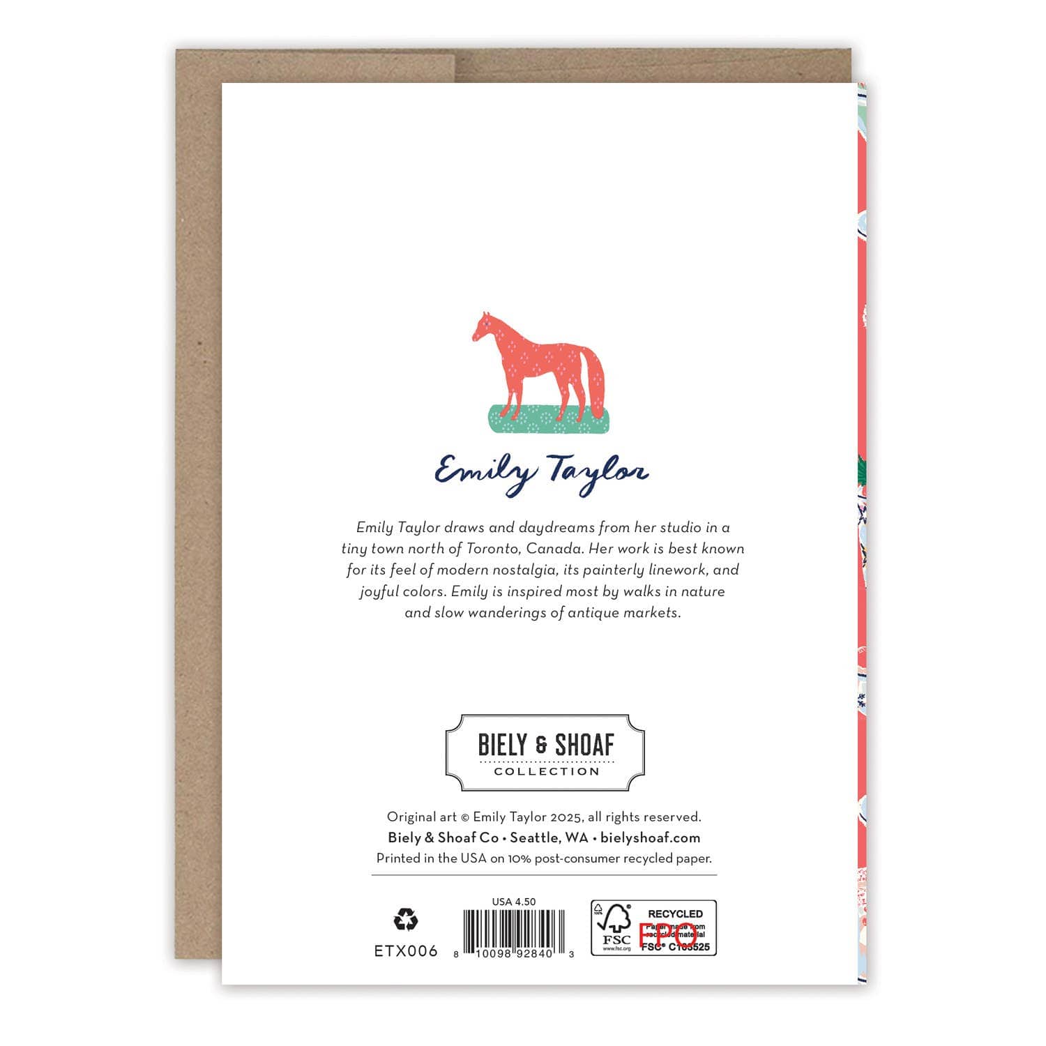 Inside verse: cheers, cin cin, salut! Here's to a wonderful holiday season • Gold foil details • Illustrated by Emily Taylor • Pre-priced • Size: A6, 4.5" x 6.25" • Paired with Brown Kraft envelope • Printed in the USA • Printed on high-quality FSC-certified 10% post-consumer waste recycled paper • By default cards come without cello packaging. Cello can be added to your order using our cello listing for an additional $0.25 each. • For FREE cello on your first order, please put "FREECELLO" in your order PO, or send us a message! About the artist: Emily Taylor draws and daydreams from her studio in a tiny town north of Toronto, Canada. Her work is best known for its feel of modern nostalgia, its painterly linework and joyful colors. Emily is inspired most by walks in nature and slow wanderings of antique markets.