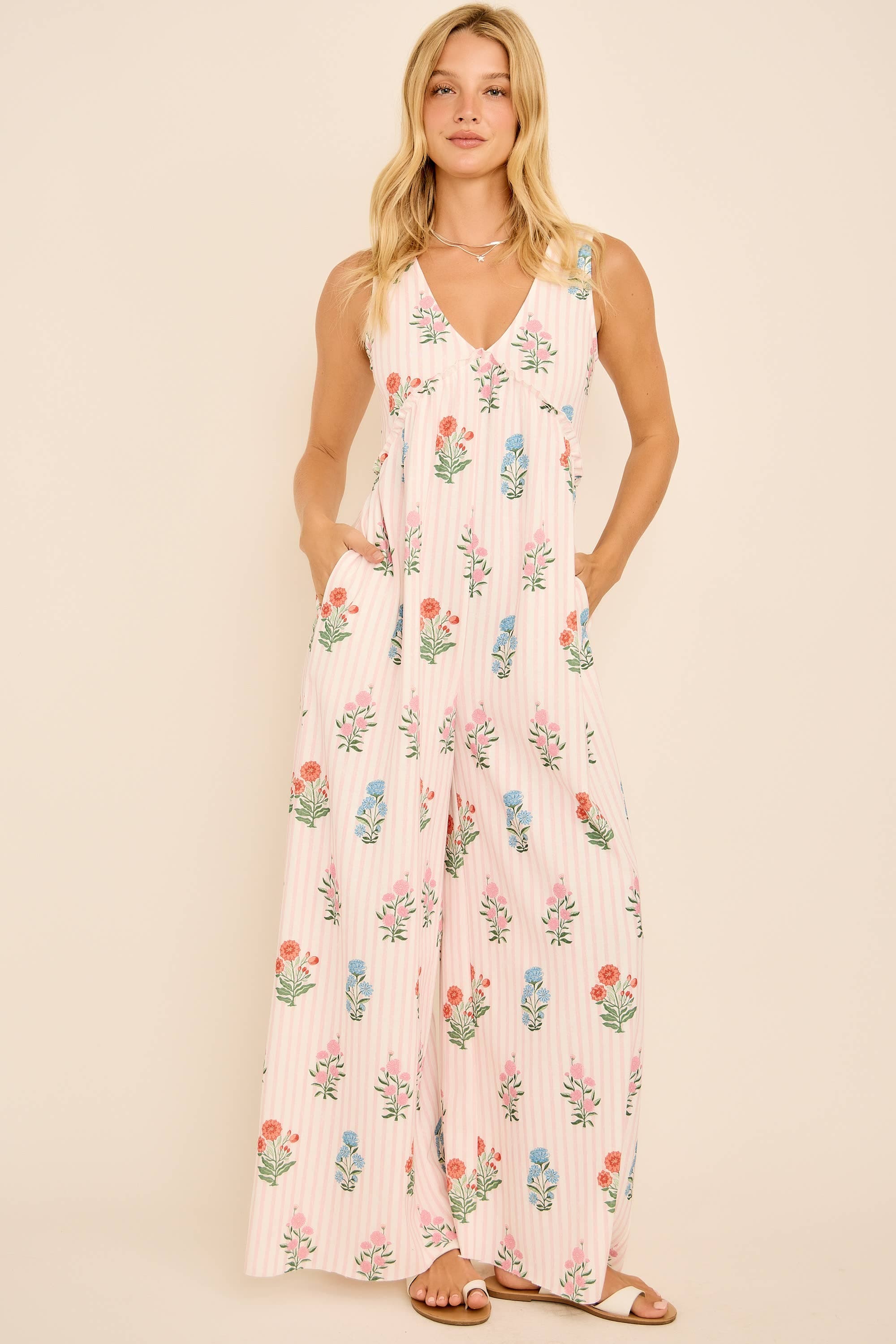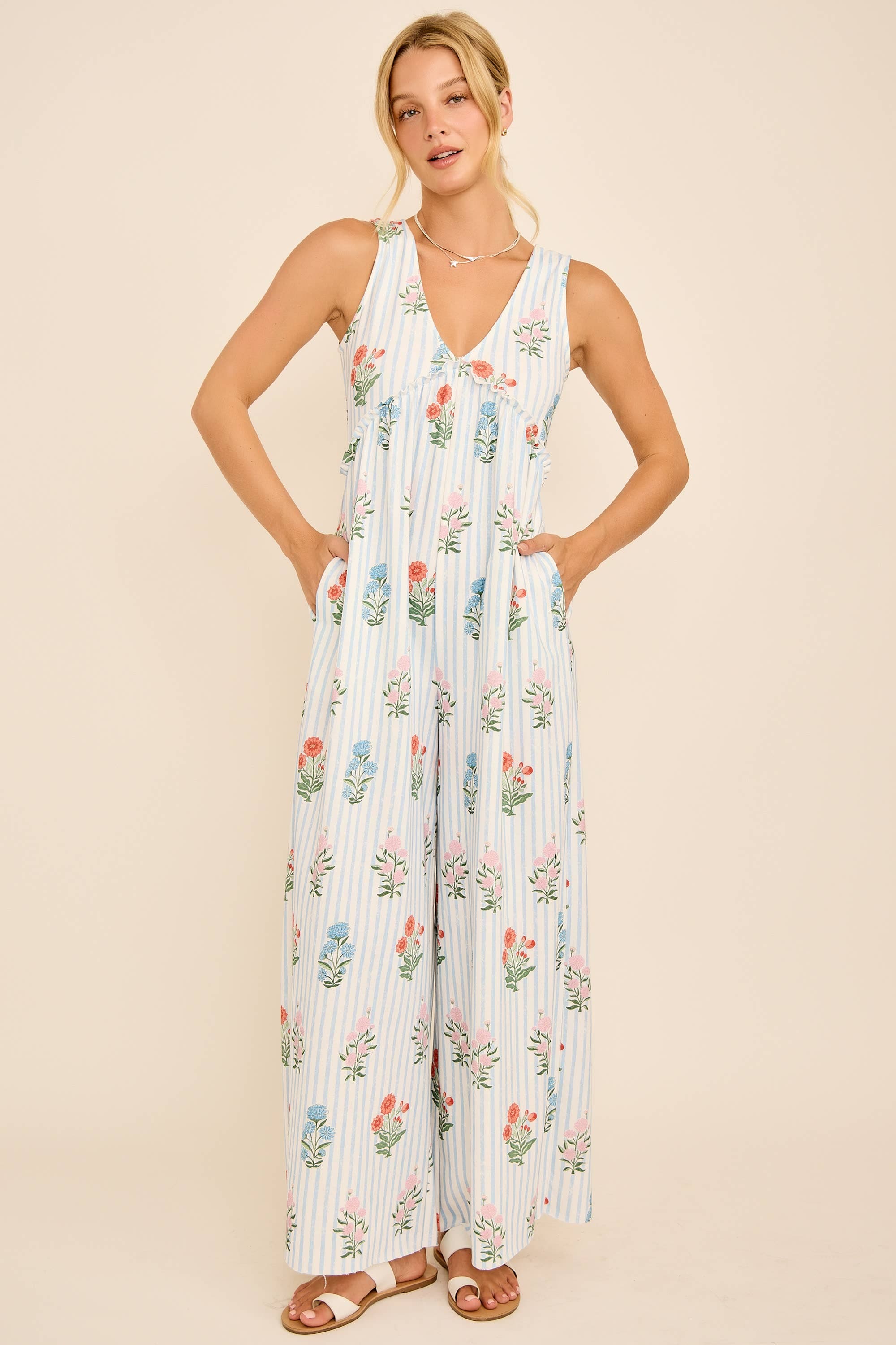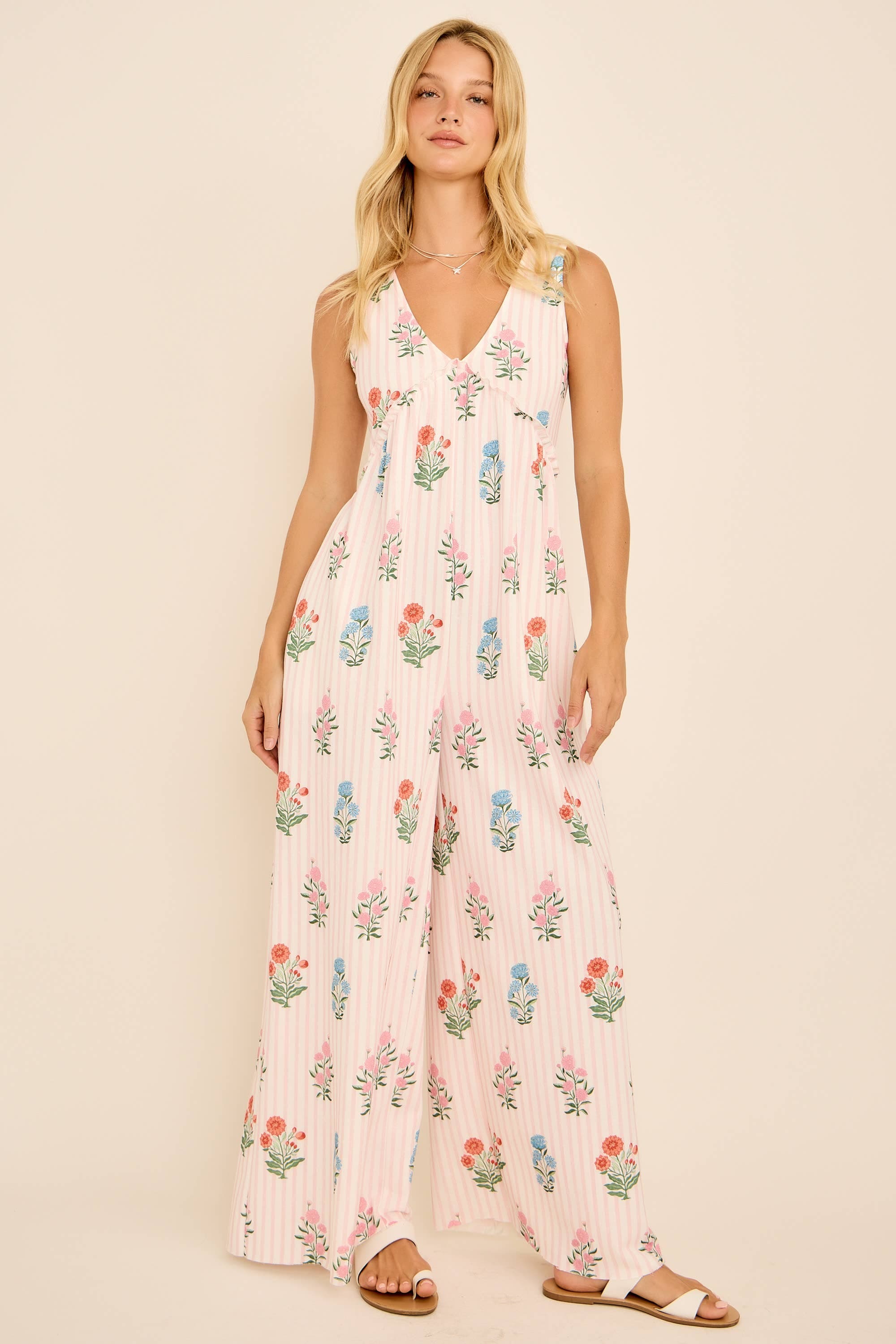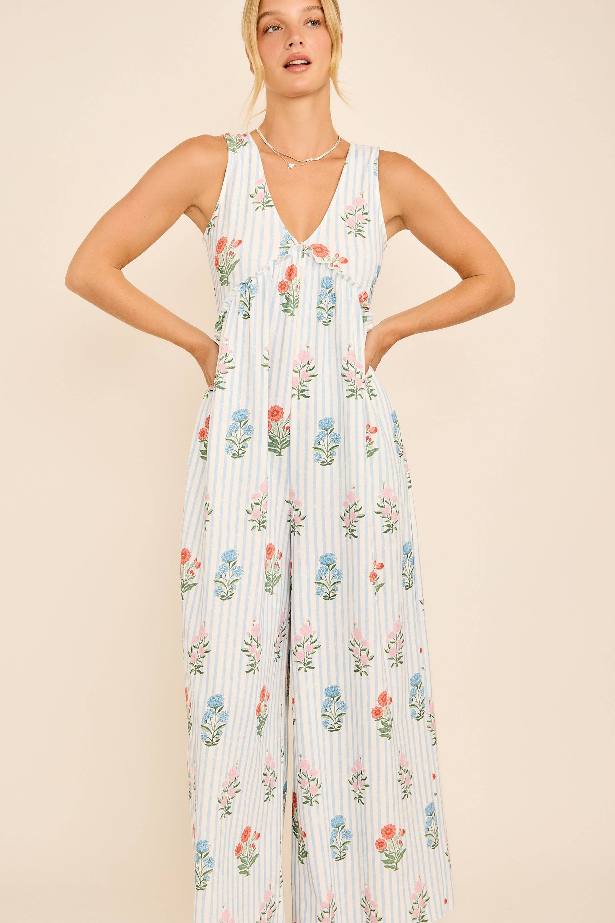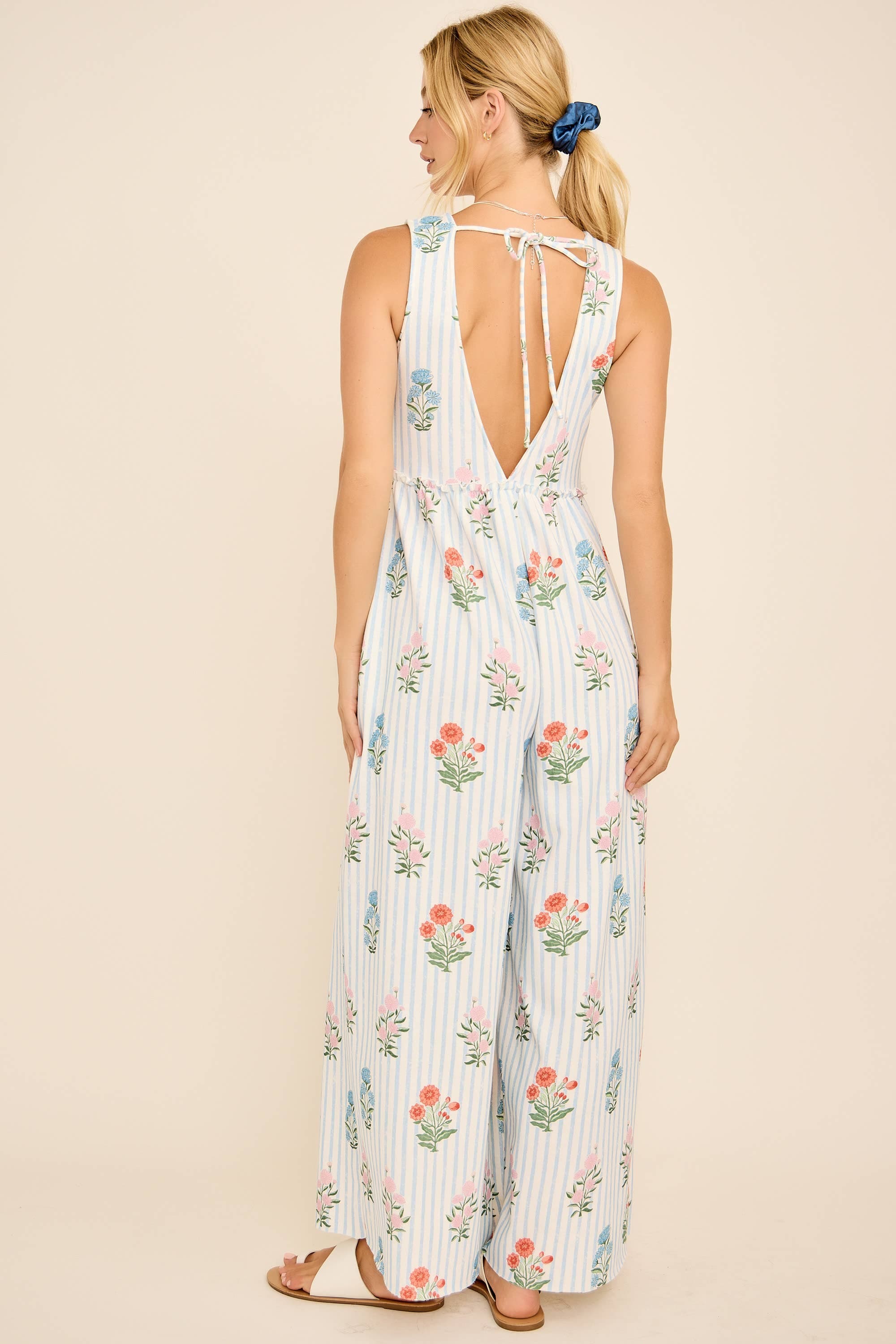 This floral stripe jumpsuit features a plunging V-neckline, wide-leg silhouette, and an open back with tie detail for a chic summer vibe. Lightweight and breezy, it’s perfect for vacations, beach outings, or casual weekends. Pair with sandals for an effortless boho-chic look. floral stripe jumpsuit, backless summer jumpsuit, wide leg jumpsuit, boho chic outfit, resort wear jumpsuit, v-neck jumpsuit, casual vacation style, beachwear jumpsuit