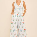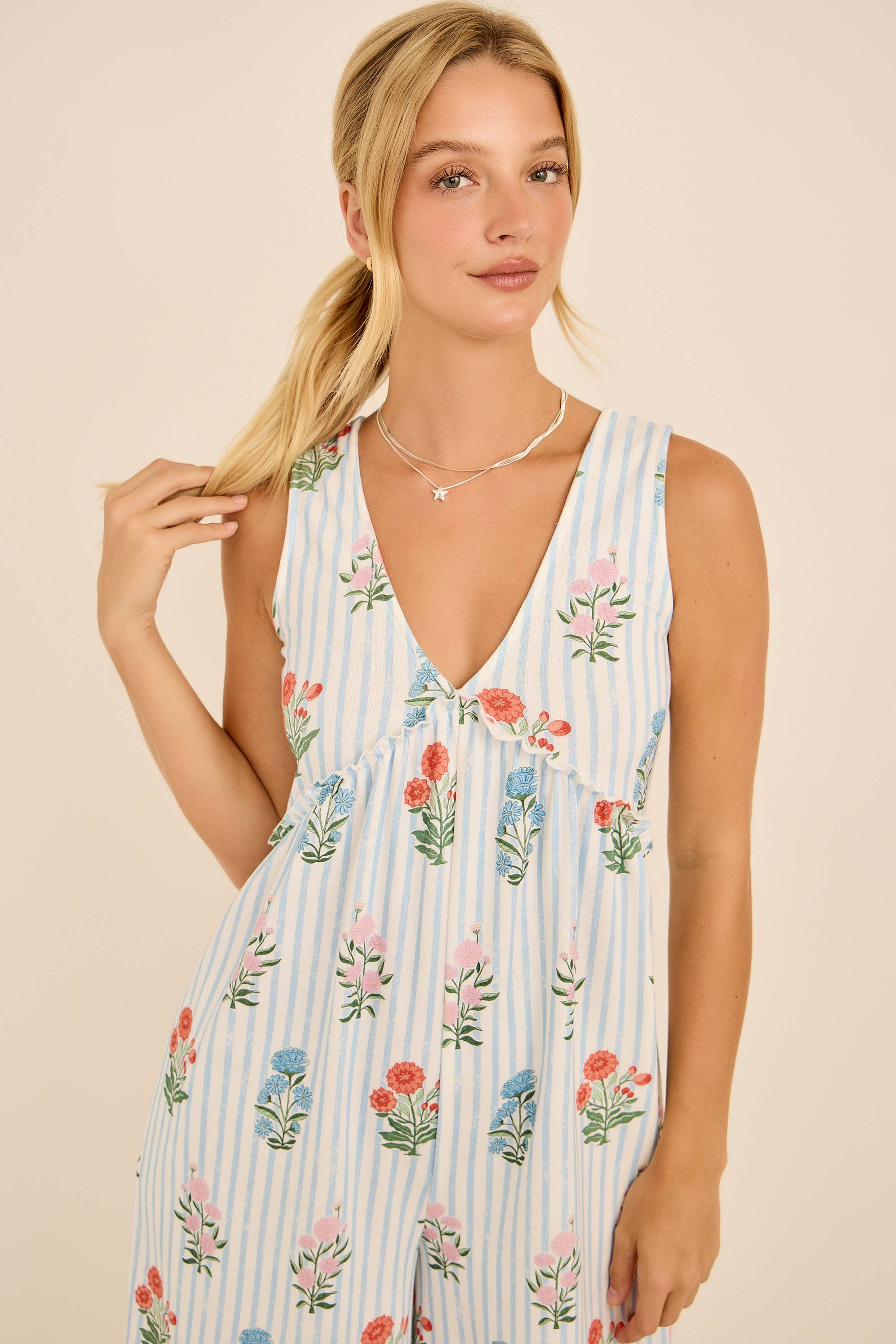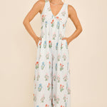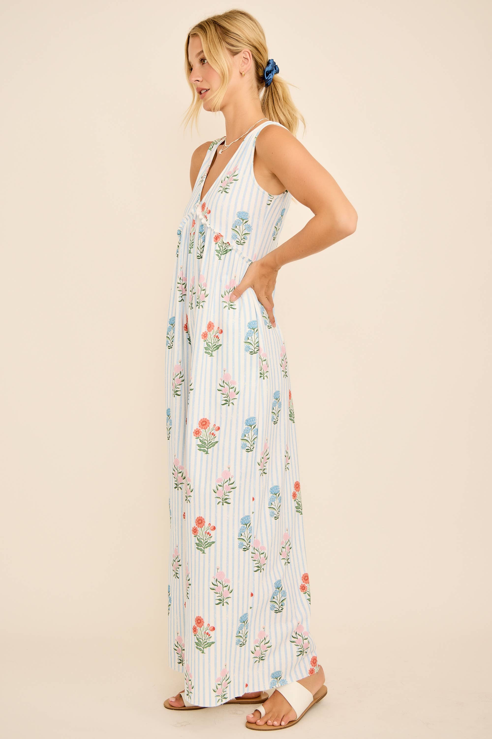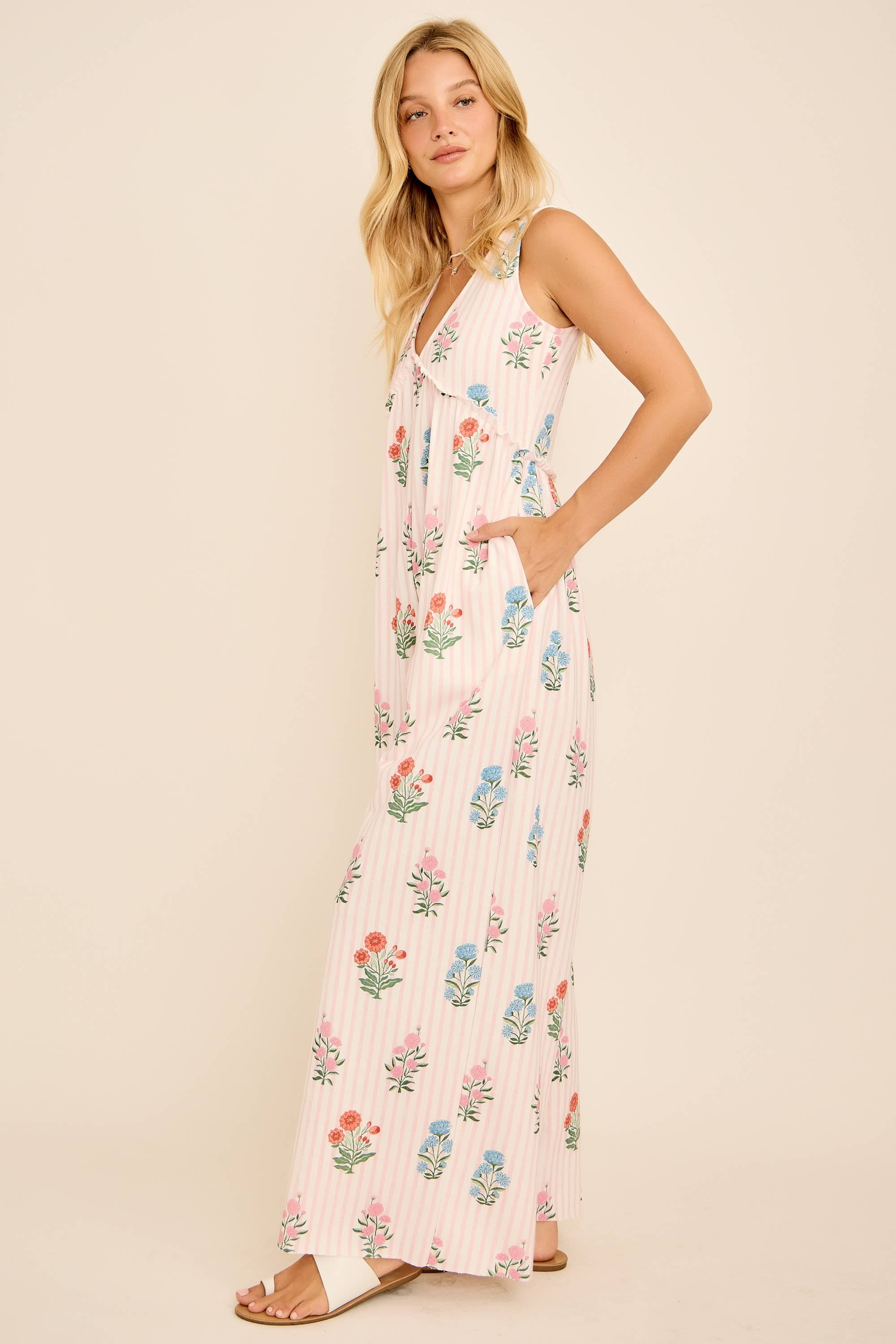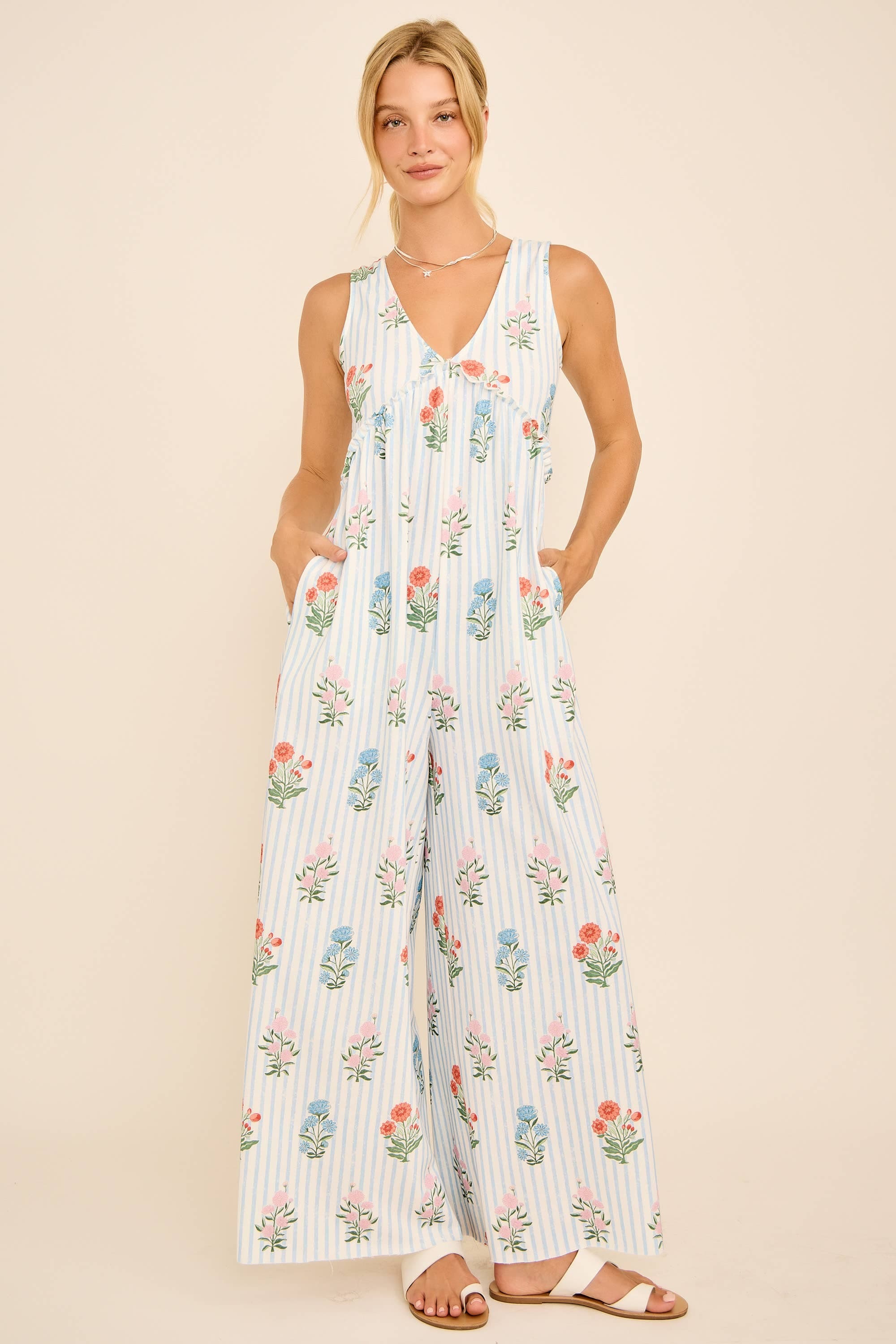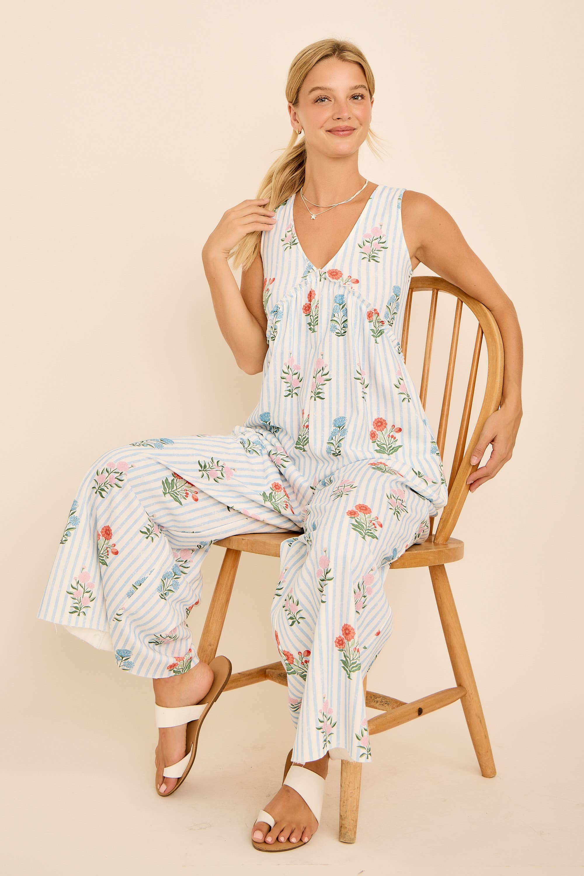 This floral stripe jumpsuit features a plunging V-neckline, wide-leg silhouette, and an open back with tie detail for a chic summer vibe. Lightweight and breezy, it’s perfect for vacations, beach outings, or casual weekends. Pair with sandals for an effortless boho-chic look. floral stripe jumpsuit, backless summer jumpsuit, wide leg jumpsuit, boho chic outfit, resort wear jumpsuit, v-neck jumpsuit, casual vacation style, beachwear jumpsuit