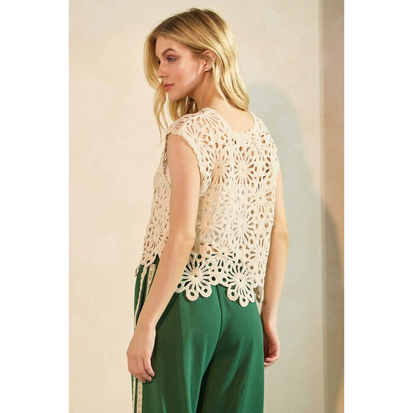 This sleeveless crop tank top features a floral crochet knit with a scalloped edge and a round neckline. Made from a soft cotton blend, it’s perfect for spring and summer festivals, beach days, or as a stylish cover-up. Comfortable and breathable, it pairs well with casual pants or shorts.