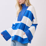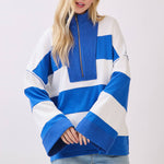 Bring team spirit into your everyday wardrobe with the Gameday Varsity Stripe Zip Pullover. This bold, oversized piece features wide black and red stripes-perfect for repping your team colors in style. The zip-up mock neck adds a sporty edge, while the roomy fit makes it easy to layer over tanks or tees. Whether you're tailgating, cheering from the stands, or just out and about, this pullover is your go-to for game day and beyond.gameday, gameday outfit, team color top, varsity pullover, oversized zip sweater, striped zip pullover, red and black top, fall gameday fashion, cozy team sweater, stadium style, tailgate outfit, college football, quarter zip sweatshirt, casual sporty pullover, relaxed fit gameday top