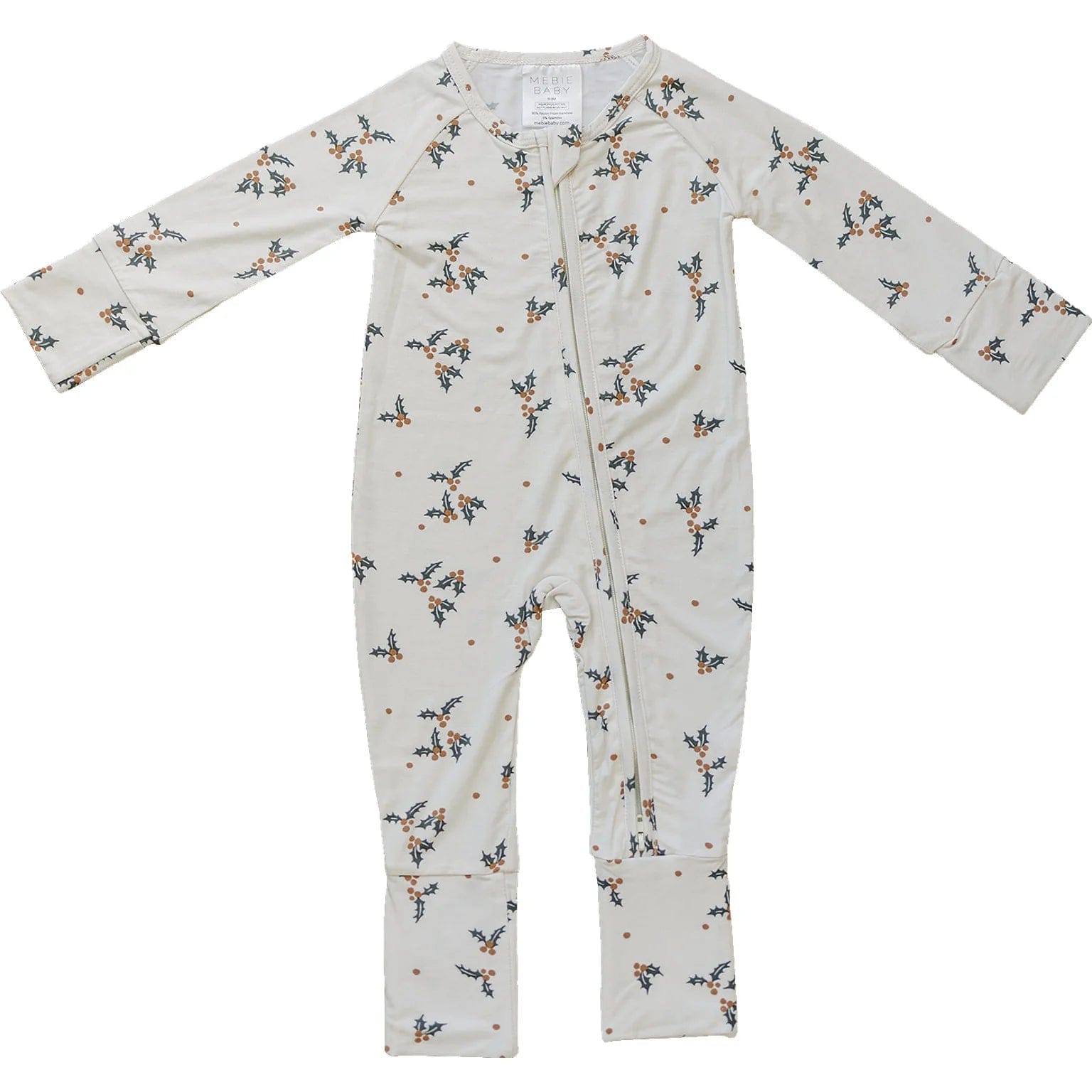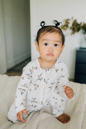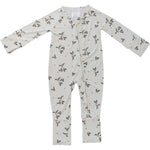 Mebie Baby printed bamboo footed baby pajamas. They are made out of a soft bamboo fabric and are done up with a zipper. This features a double zipper that zips from the top and bottom meant for easy diaper changes. The functionality of these zippers make them a baby essential. For sizes 2T to 7/8 click here