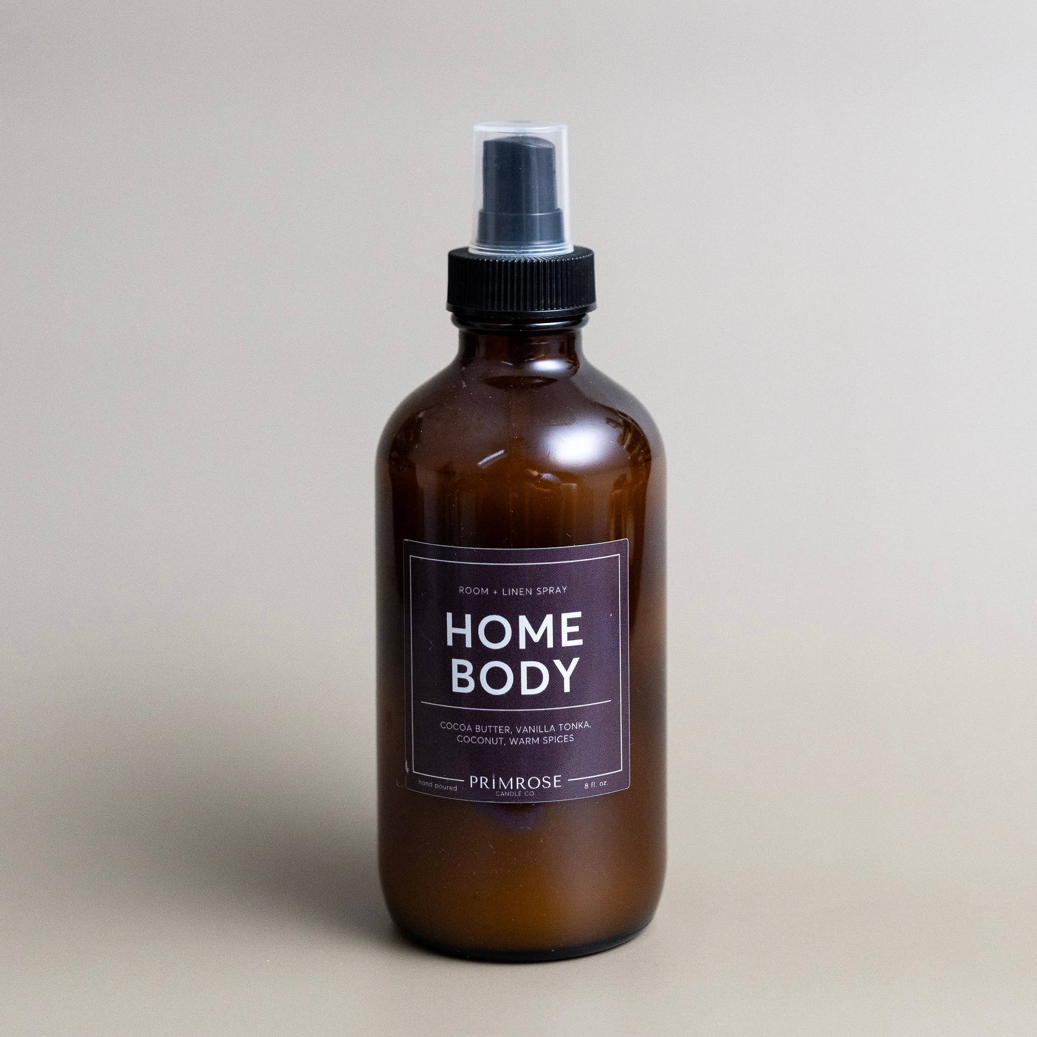 Cocoa Butter, Vanilla, Tonka, Coconut, Warm Spices Providing a cozy and comforting ambiance, Homebody is the perfect warm scent. The complexity of warm spices, rich cocoa butter, olive wood and a touch of coconut sweetness combines to create the most relaxing fragrance, perfect for those of us who relish cancelled plans and nights in. Room + Linen Spray bullet points-  * 8 oz of wax * SHAKE and SPRAY * Keep out of reach of children and pets.  * If spraying on carpet or furniture, please patch test first. * Can be used to freshen up linens, cars, rooms, and bodies * Ingredients: Water, Natural Odor Counteractants, Denatured Alcohol, Polysorbate 20, Paraben- and Phthalate-free Fragrance Oil