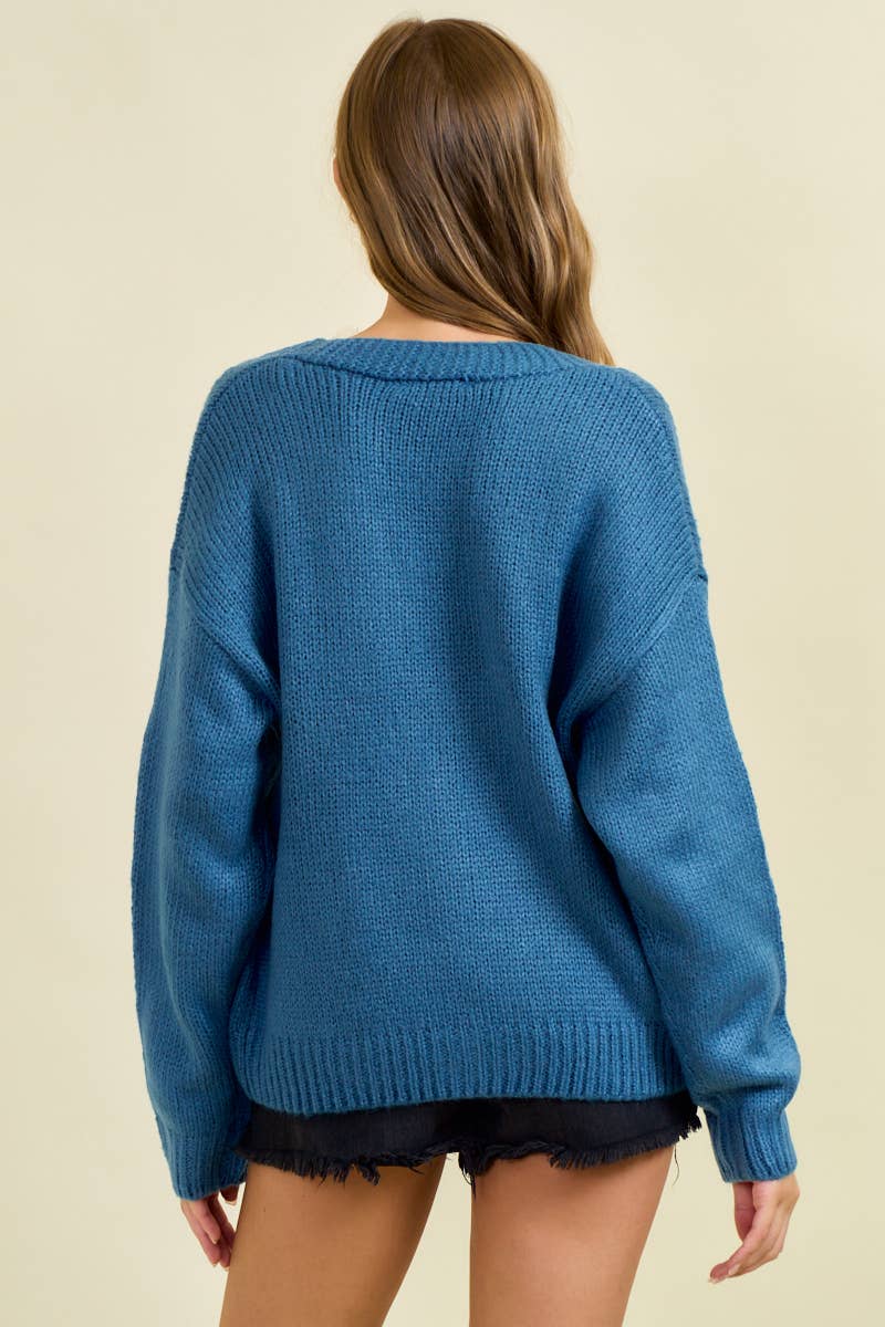 This cozy, chunky knit cardigan features oversized horseshoe patches and a button-front closure with easy-to-use buttons. Its deep V-neckline makes it ideal for layering over tanks or tees, offering both comfort and style. Made from 100% acrylic, it’s a versatile addition to your wardrobe.