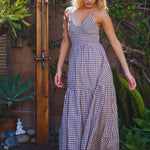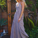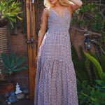 This cotton maxi dress features a check pattern, adjustable crossed shoulder straps, a deep v-neck, and a smocked waist for a comfortable, flattering fit.