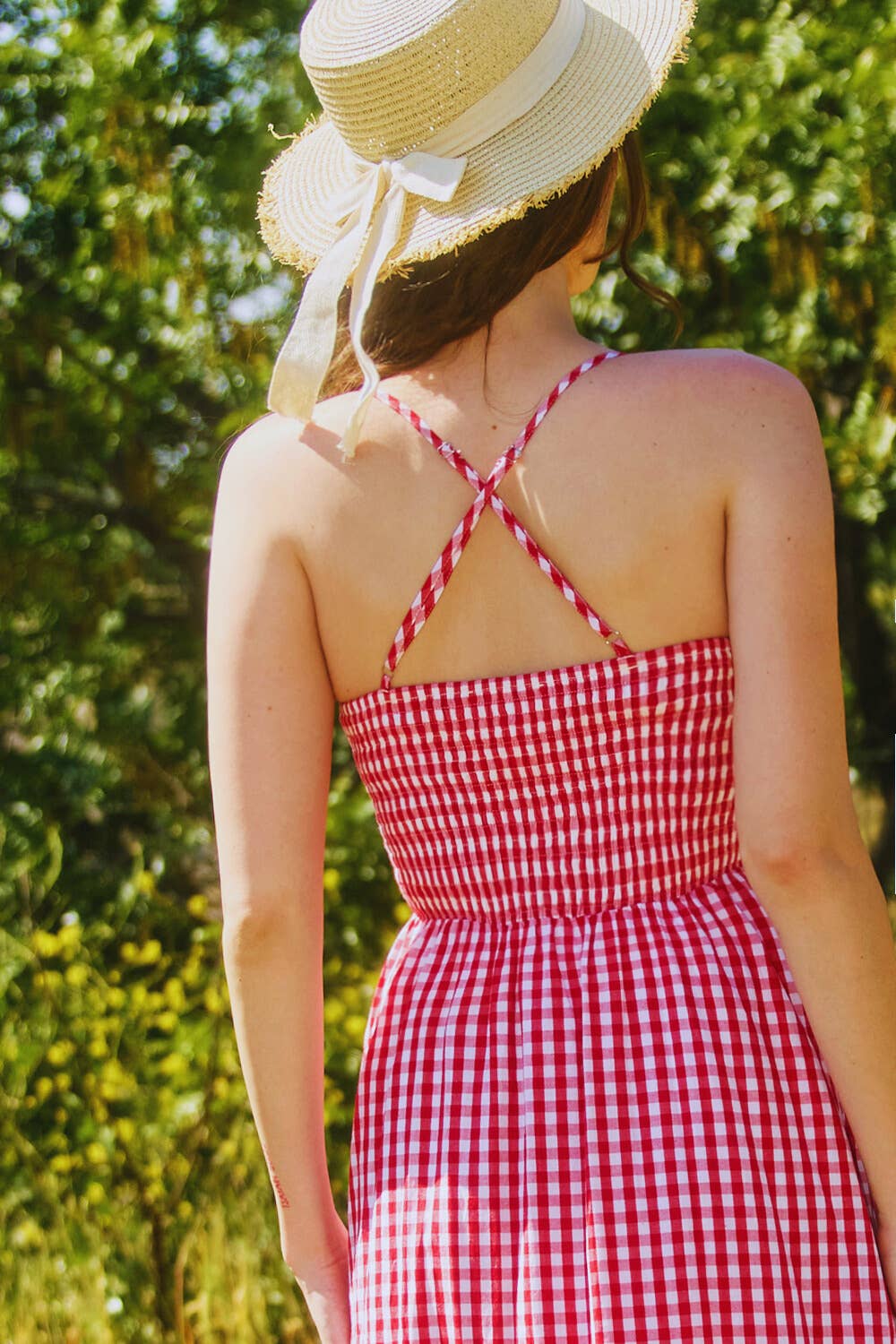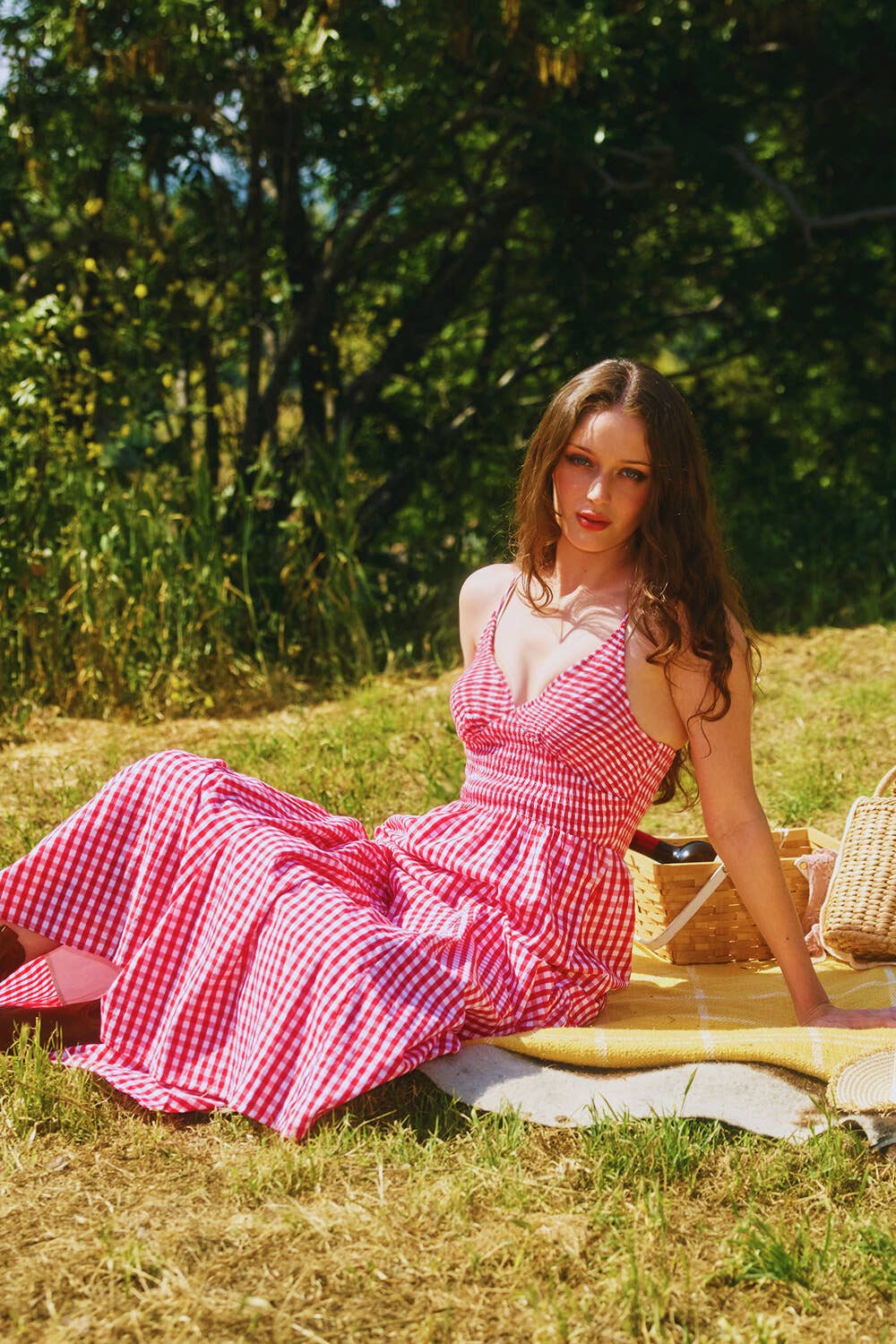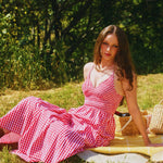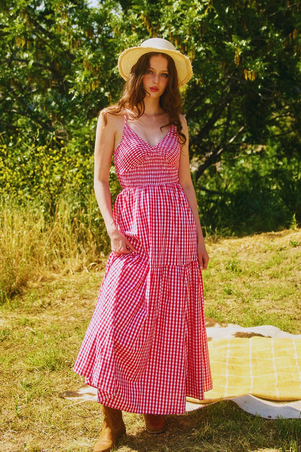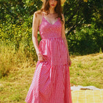 This check print maxi dress features a smocked bodice, adjustable crossed shoulder straps, and a flattering deep v-neckline. Made from comfortable cotton, it offers a lightweight and breathable fit perfect for any occasion.