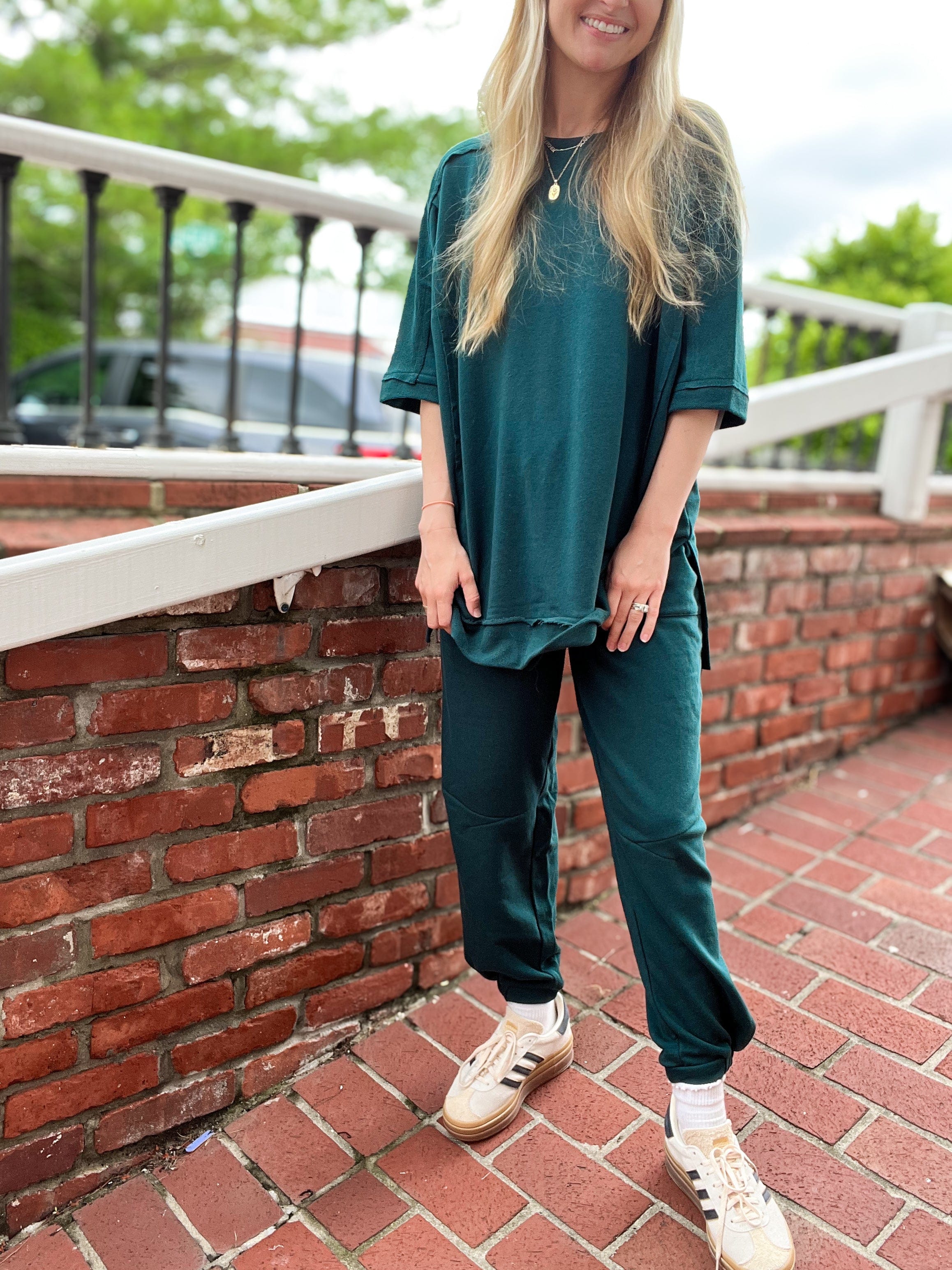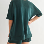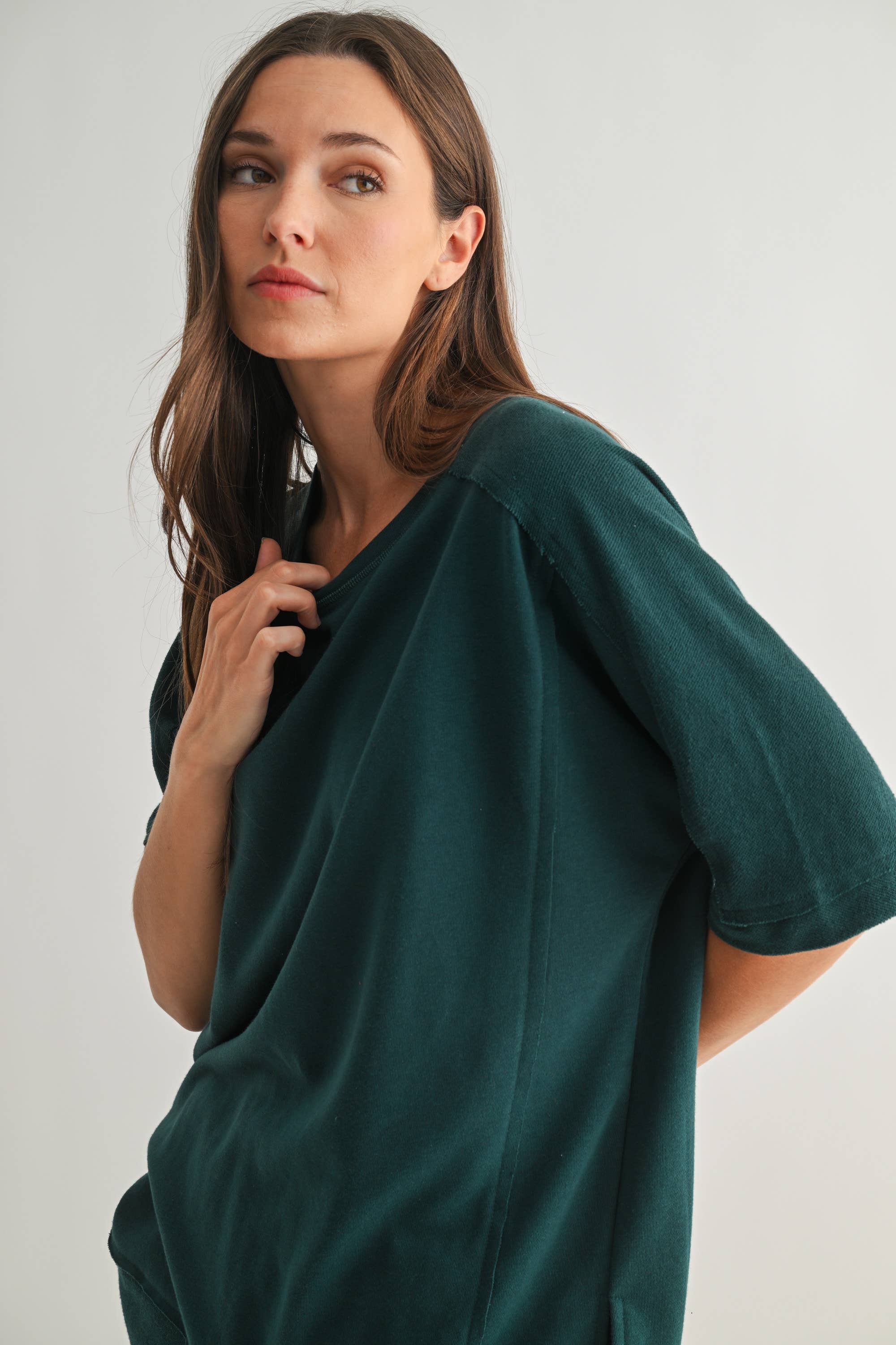 Your new go-to for laid-back days. Made from a soft, lightweight, and breathable cotton-blend French terry, this oversized top features relaxed dolman sleeves and thoughtful reversed fabric panels along the upper back, sleeve tops, and bottom hem for an artful, textured look. Raw edge seams run down the front and back for a lived-in feel, while small side slits at the hem add easy movement. Perfect for layering or lounging, this top blends comfort and style in one effortless piece.