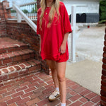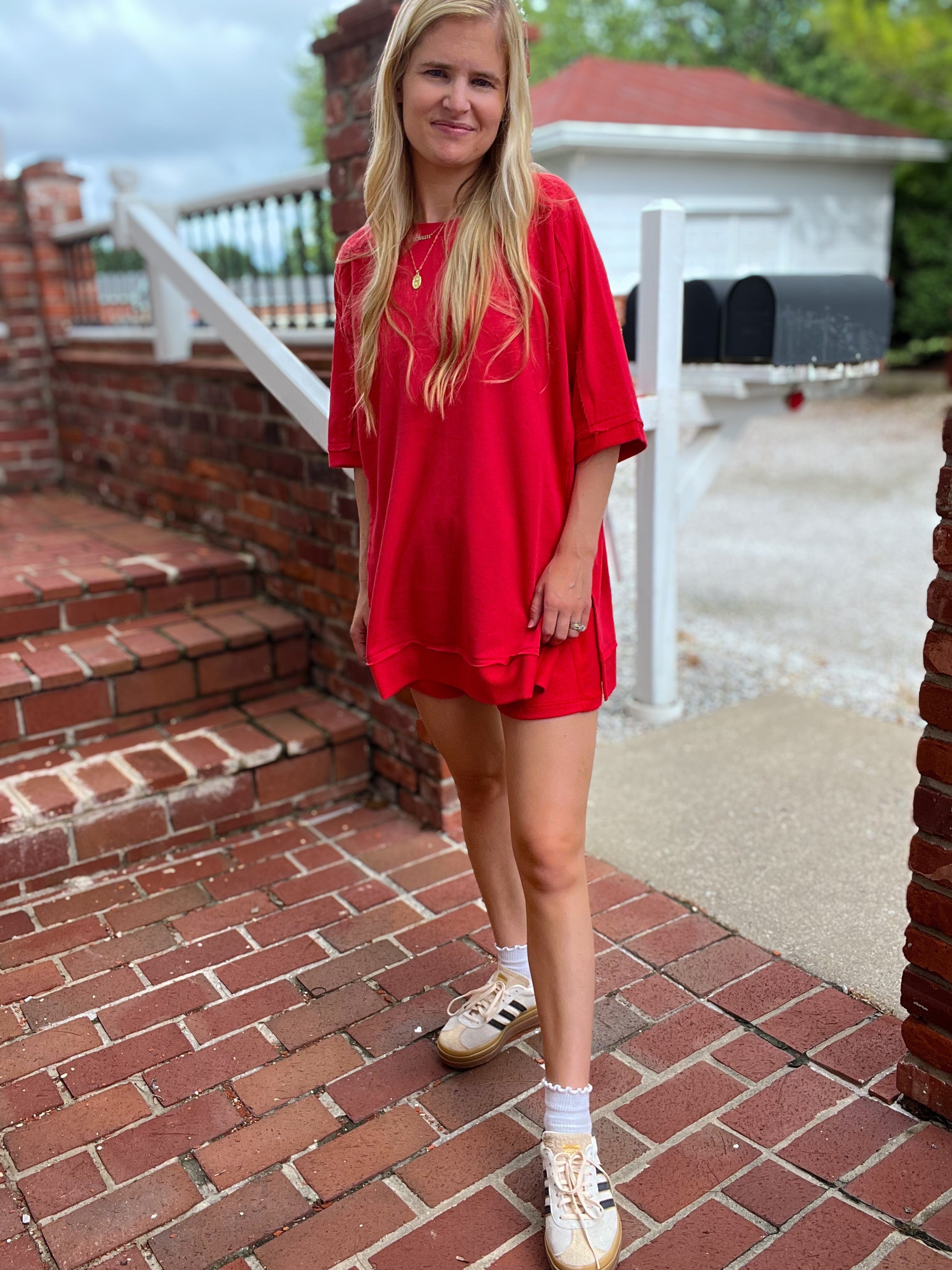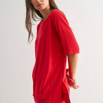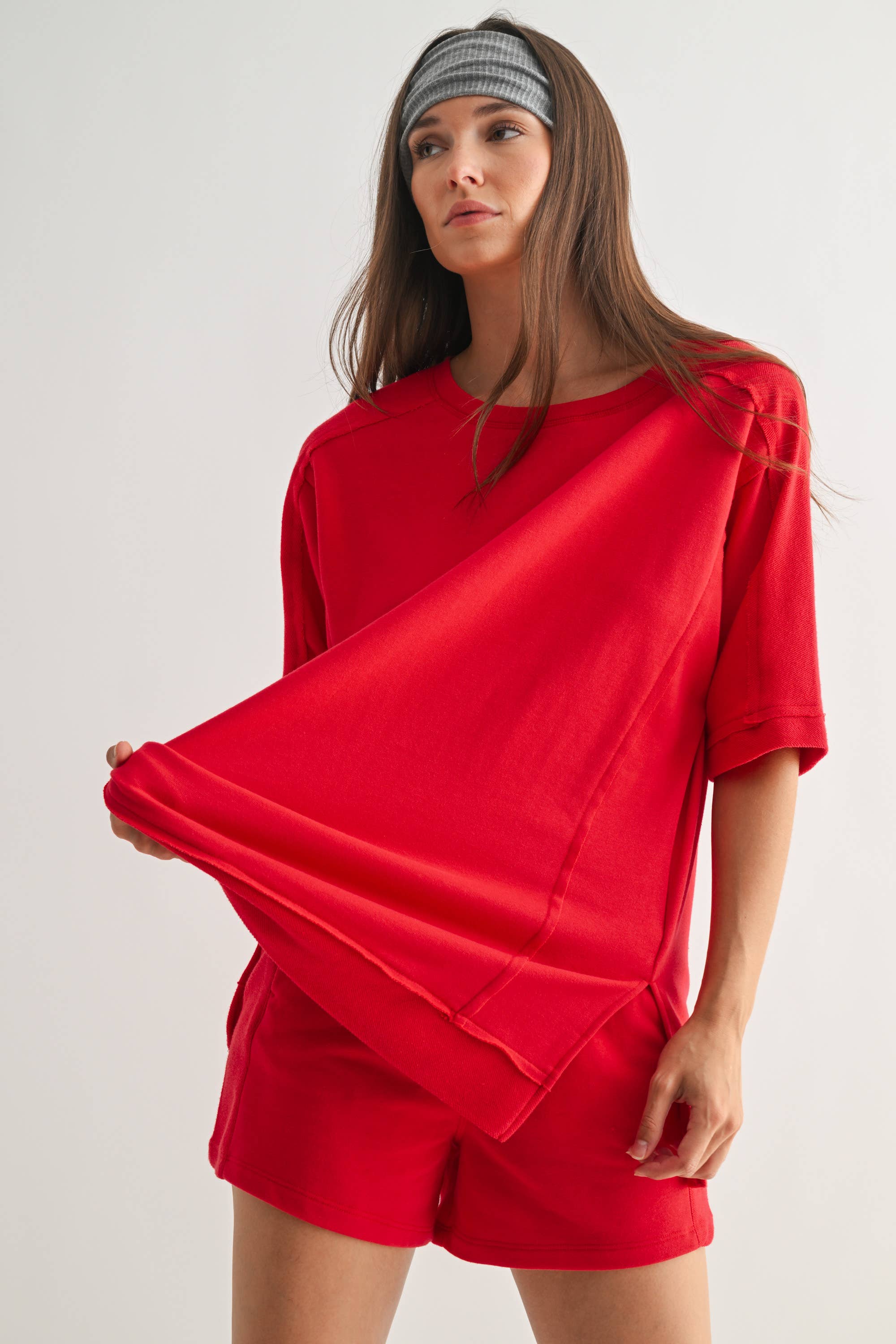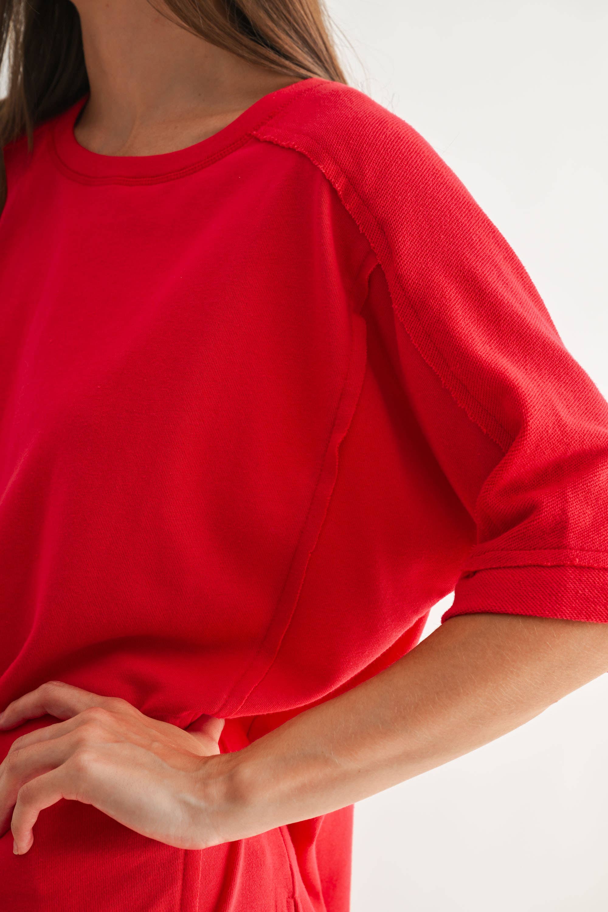 Your new go-to for laid-back days. Made from a soft, lightweight, and breathable cotton-blend French terry, this oversized top features relaxed dolman sleeves and thoughtful reversed fabric panels along the upper back, sleeve tops, and bottom hem for an artful, textured look. Raw edge seams run down the front and back for a lived-in feel, while small side slits at the hem add easy movement. Perfect for layering or lounging, this top blends comfort and style in one effortless piece.