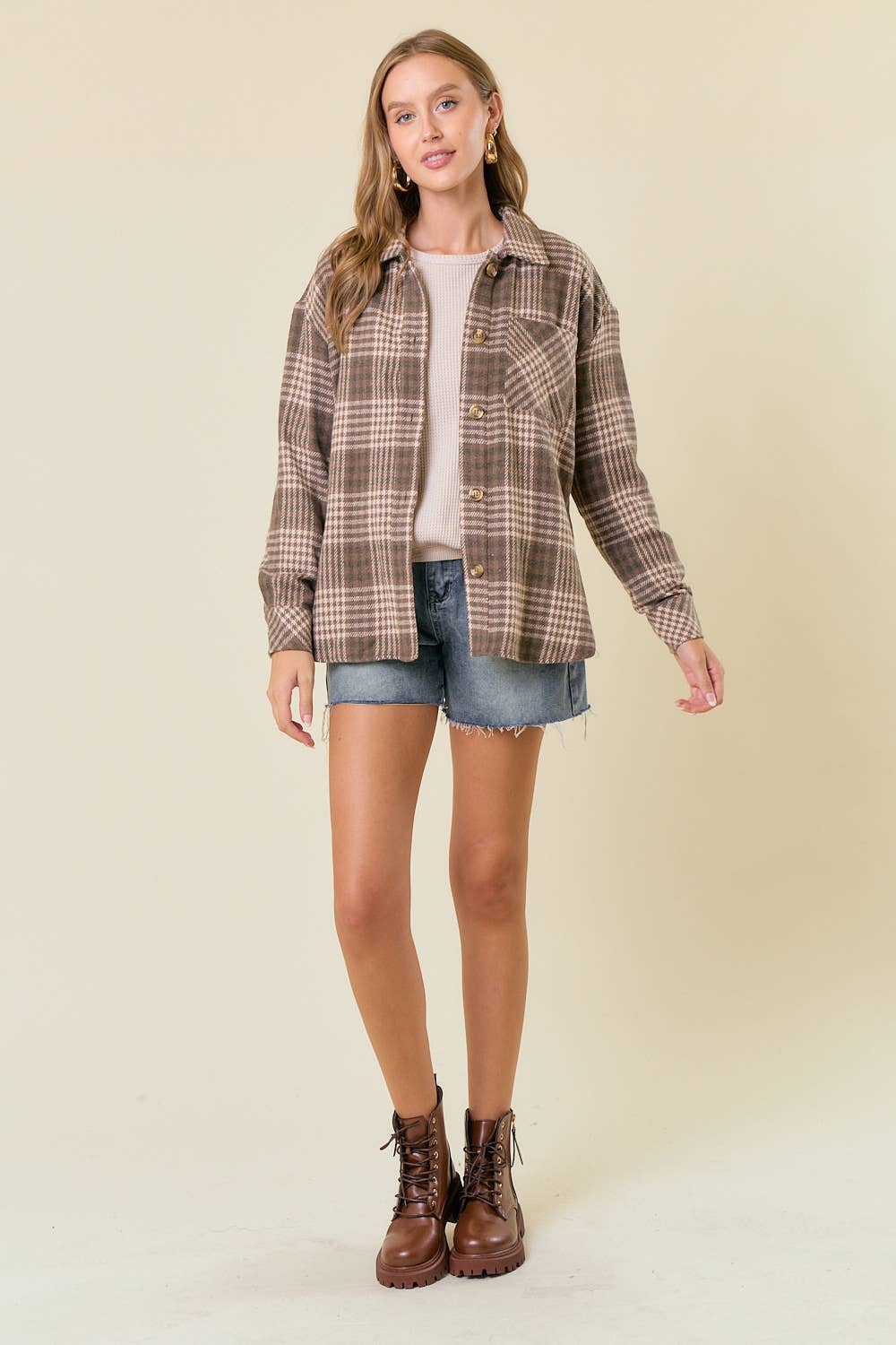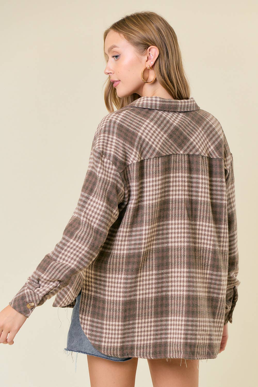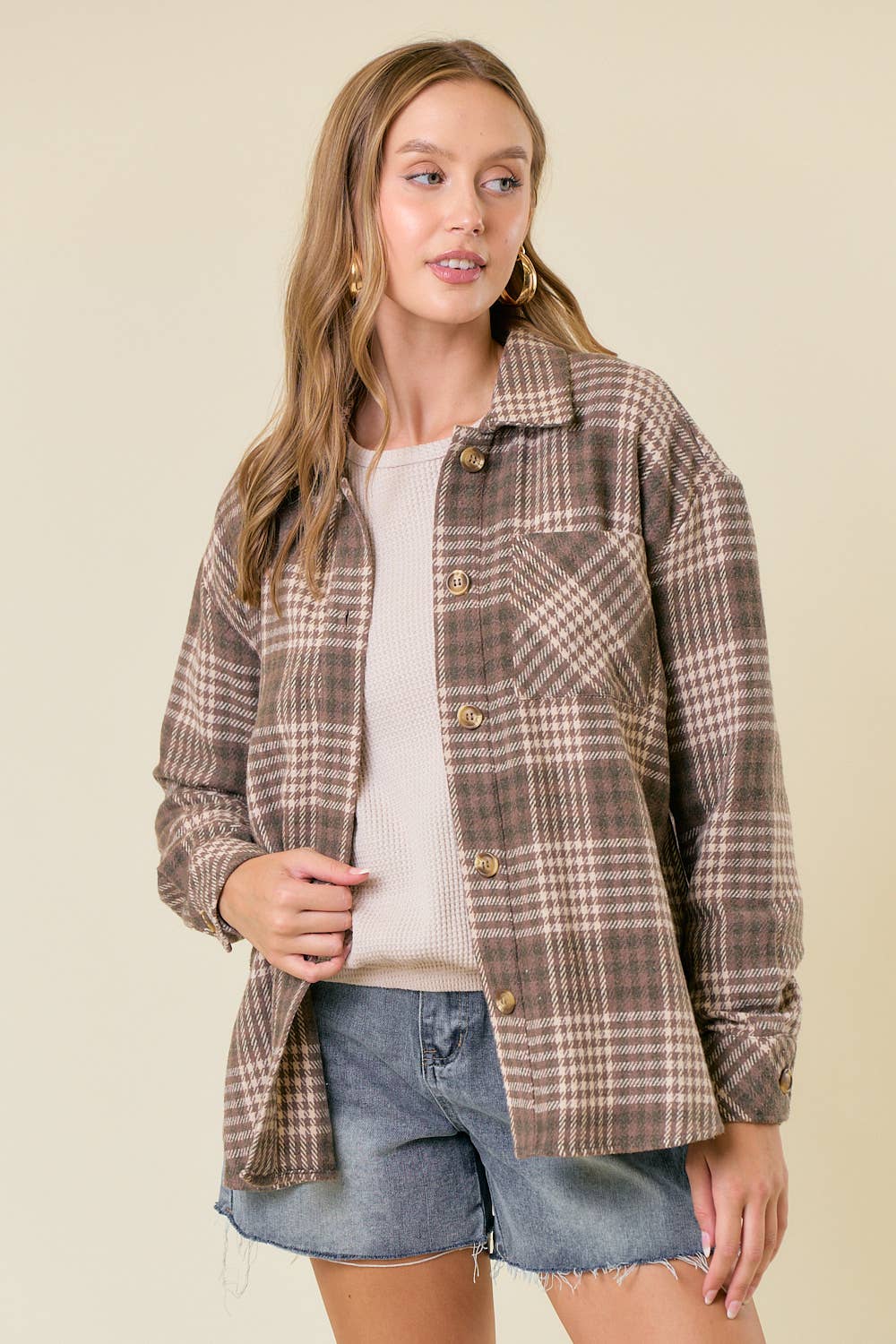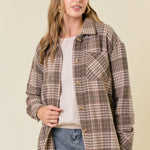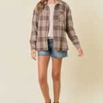 Plaid Front Button-Down Shacket W/ Patch Pocket