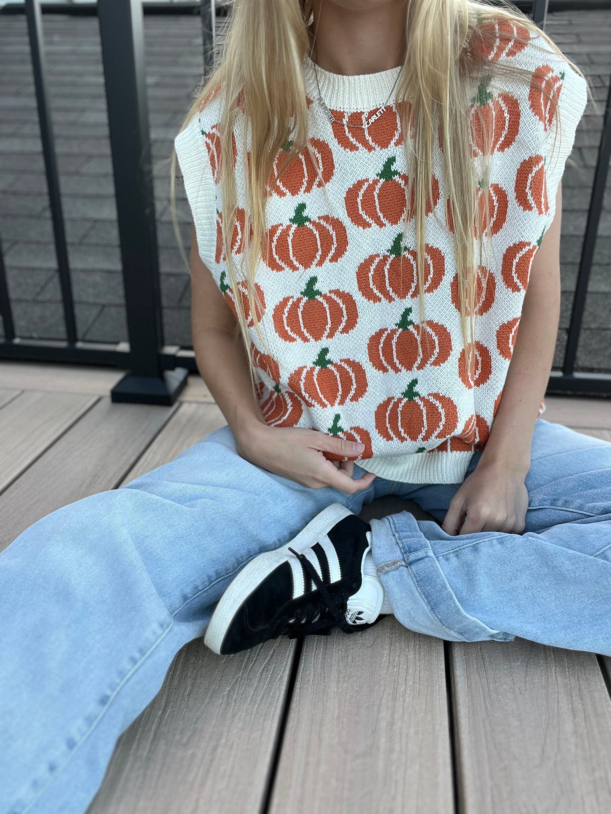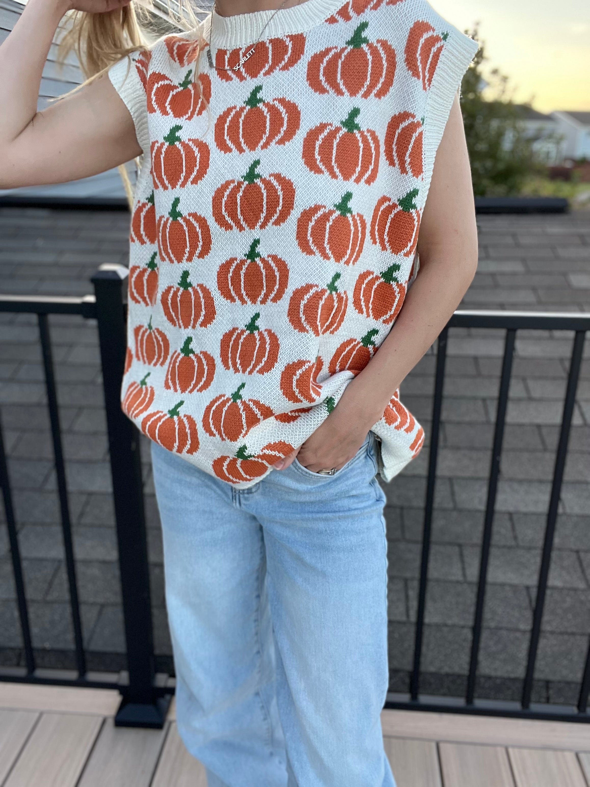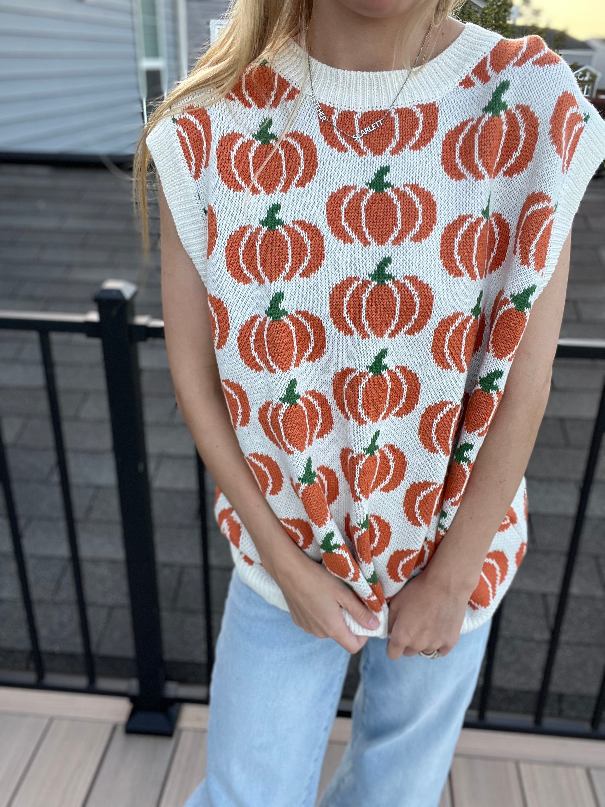Pumpkin Print Sleeveless Sweater Knit Top 100% ACRYLIC