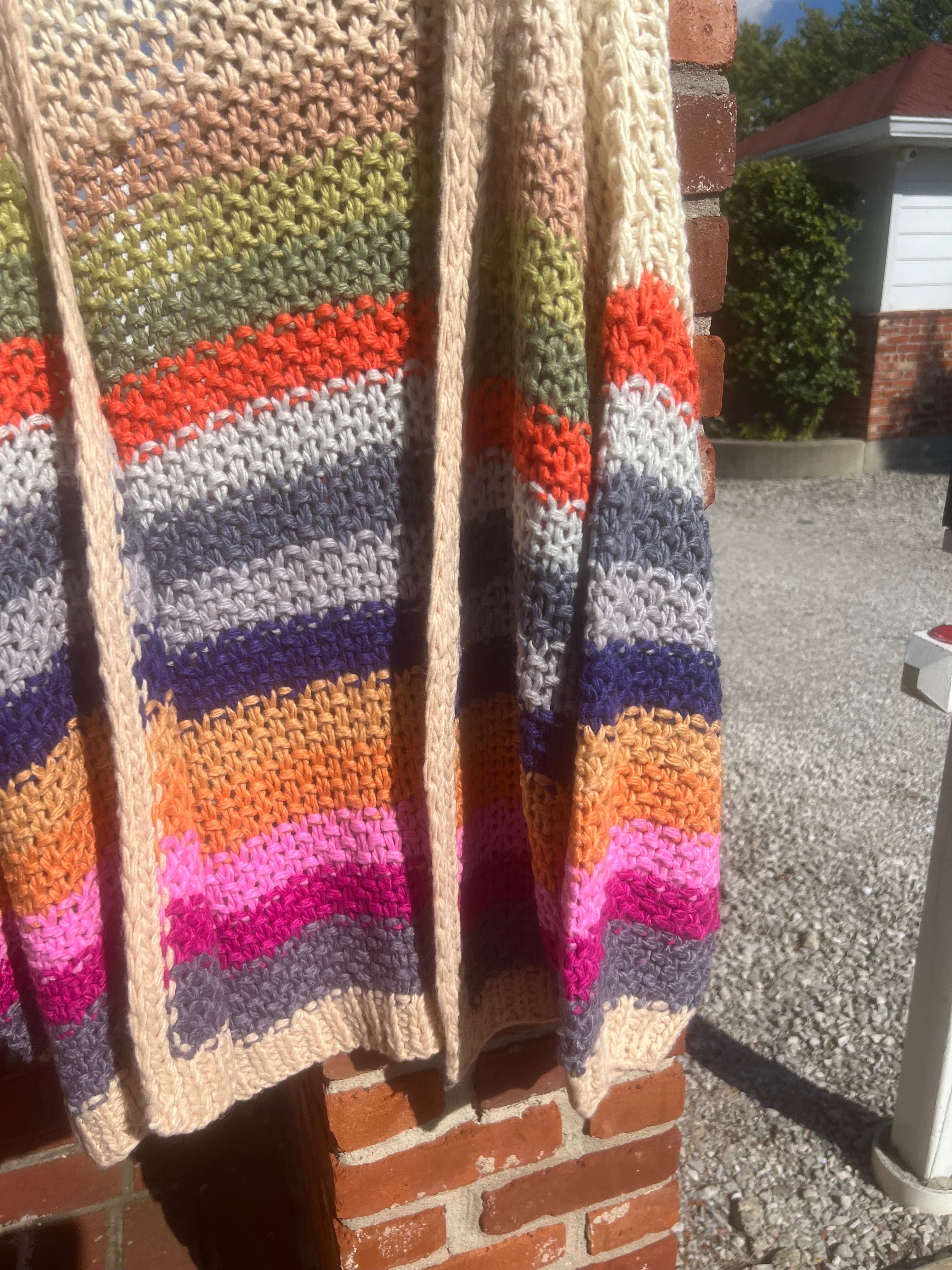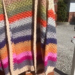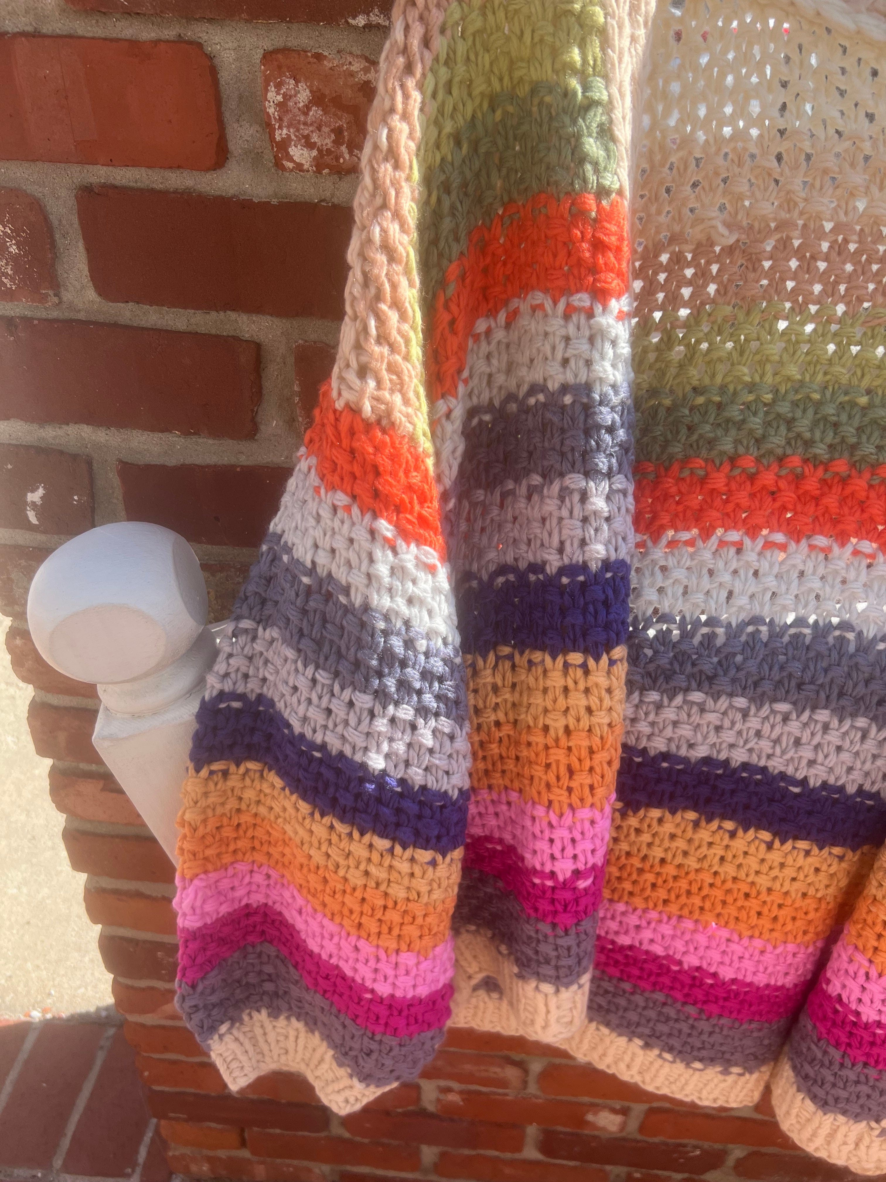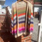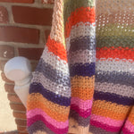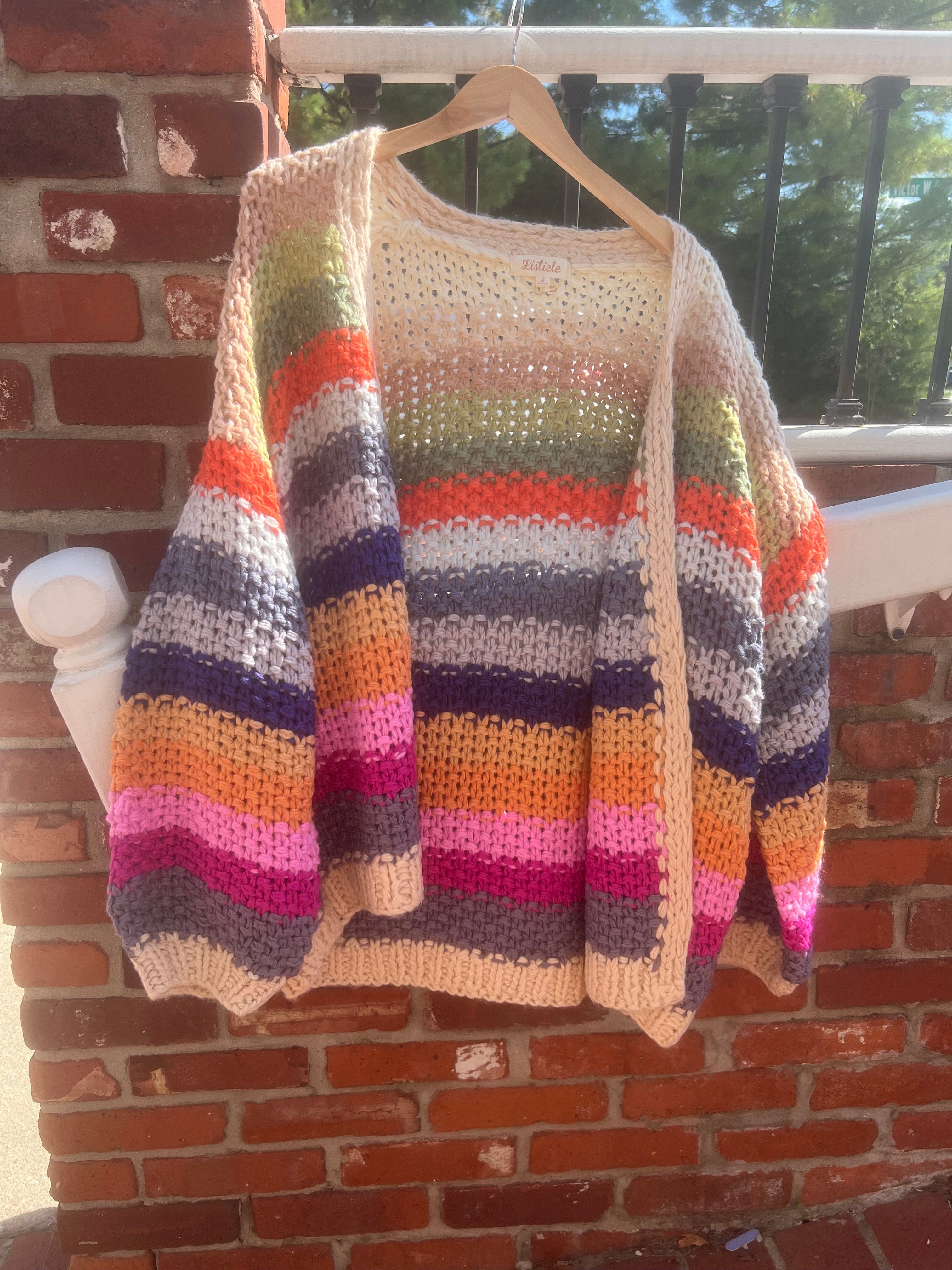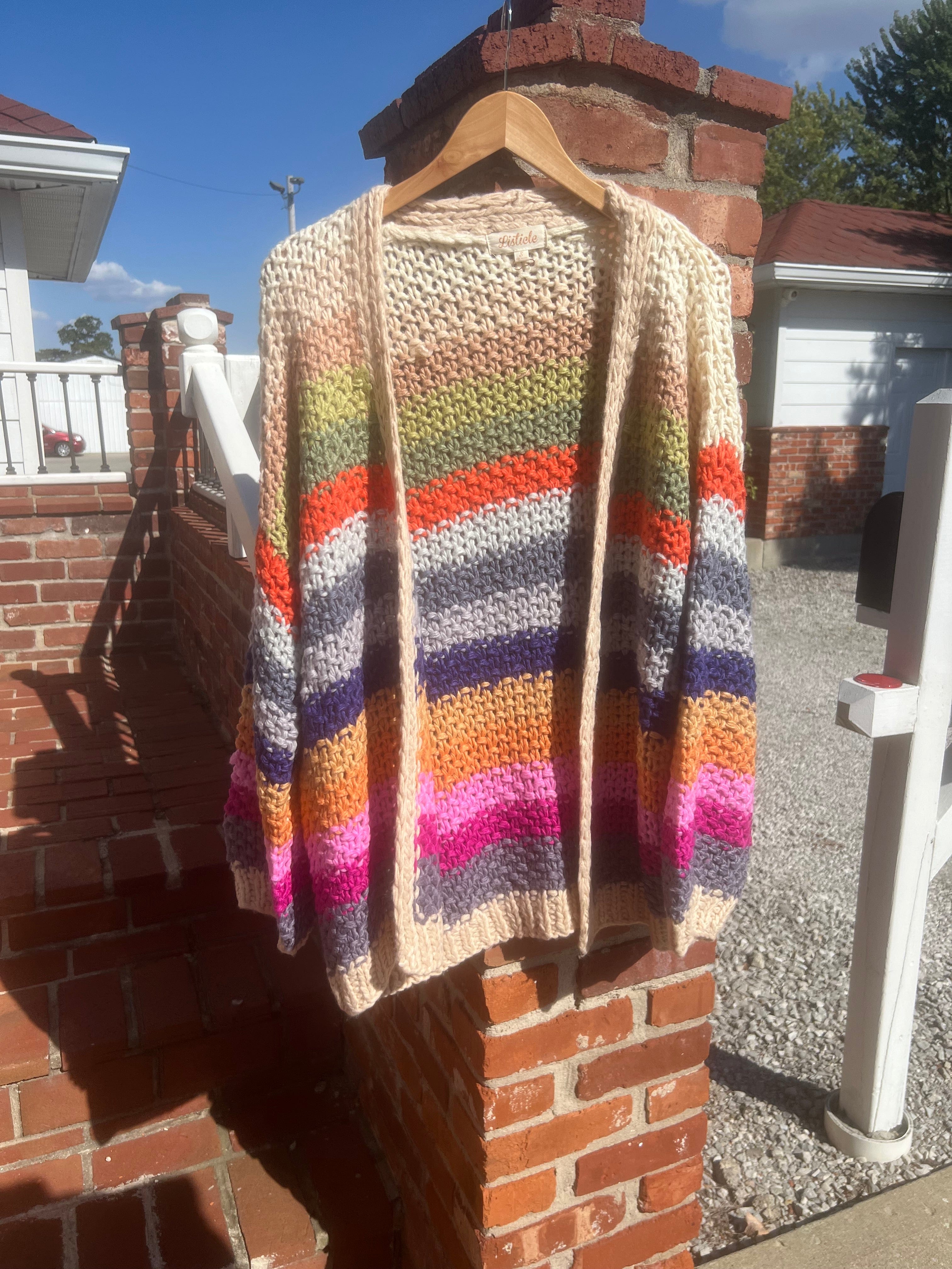 - Statement Crochet Design: Hand-crocheted with thick yarn in bold rainbow stripes for a playful, artisanal touch - Open Front Silhouette: Relaxed, draped fit with no closure for effortless layering - Chunky Knit Texture: Offers cozy warmth with a breathable, handmade feel - Long Balloon Sleeves: Adds volume and balance for a vintage-inspired look - Ribbed Edging: Detailed with ribbed cuffs and hem for structure and finish - Functional Side Pockets: Spacious side pockets seamlessly blend into the design - Model is 5' 9" 32-24-34 and wearing a size Small Perfect for adding cheerful color to chilly days, this cozy cardigan brings handmade charm and comfort to your cool-weather wardrobe.