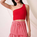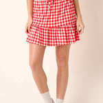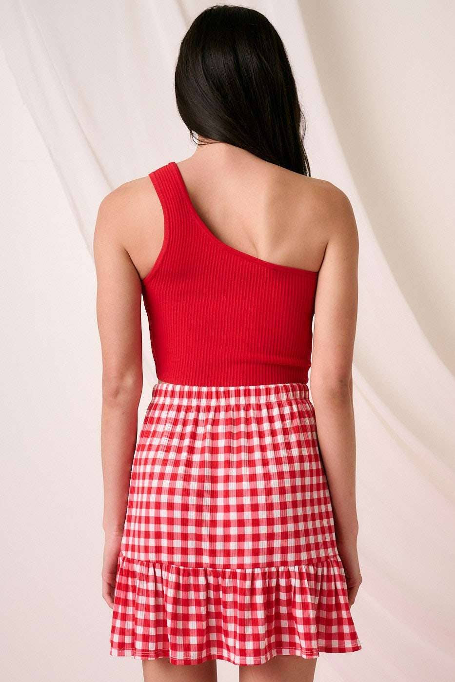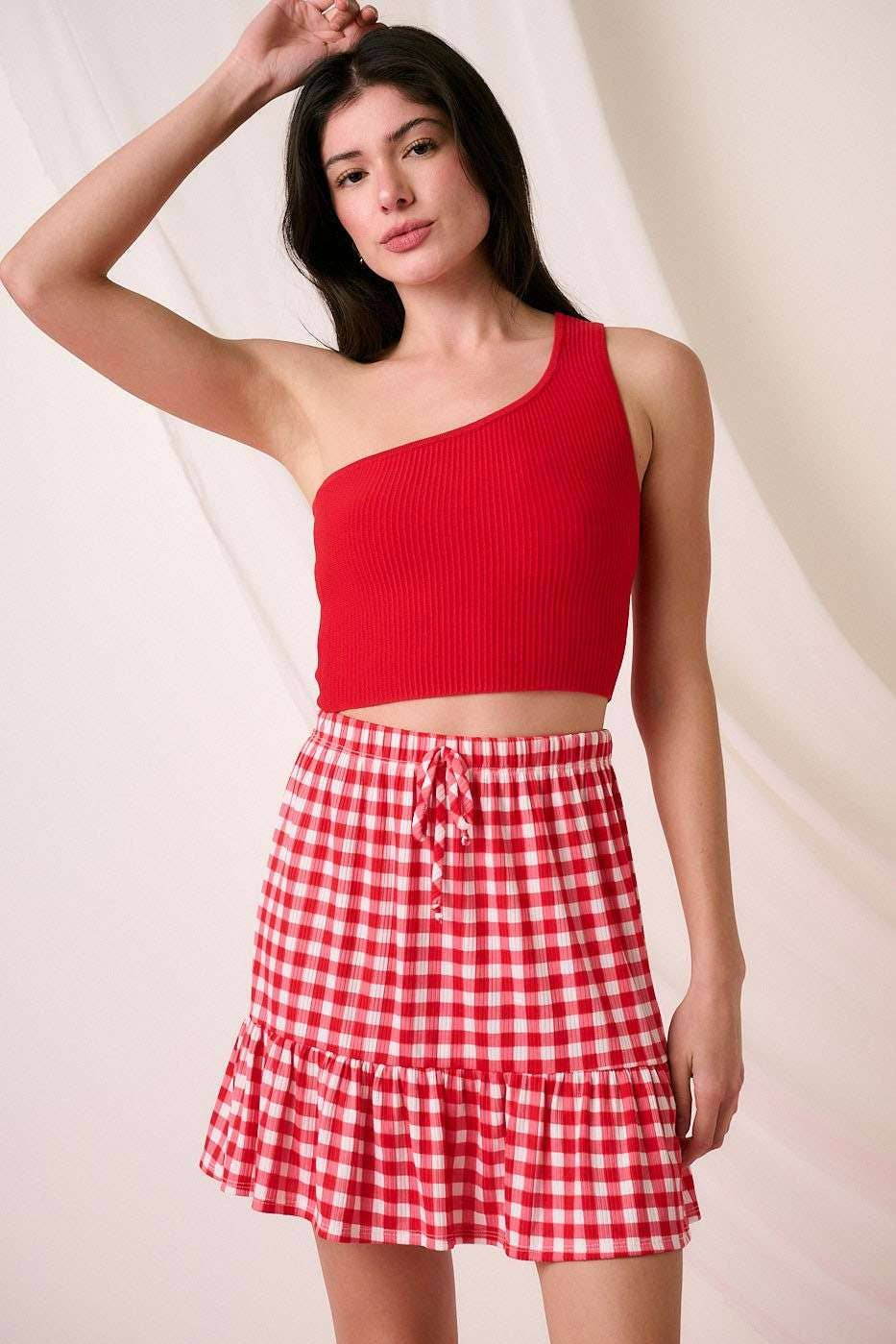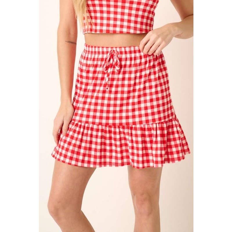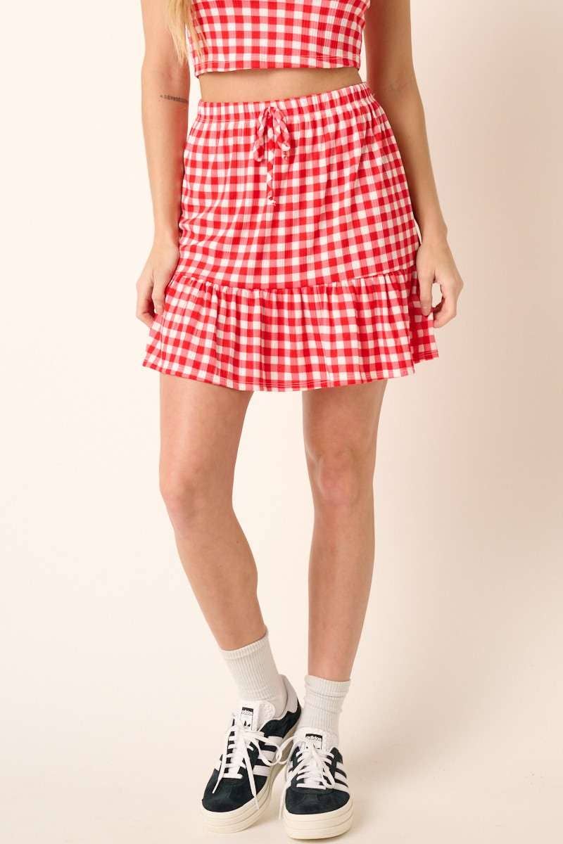 This mini skirt features a gingham print on rib knit fabric with an elastic waistband for comfort. It has a front tie detail and a ruffle hem, creating a playful look. The mini length is flattering and easy to style.