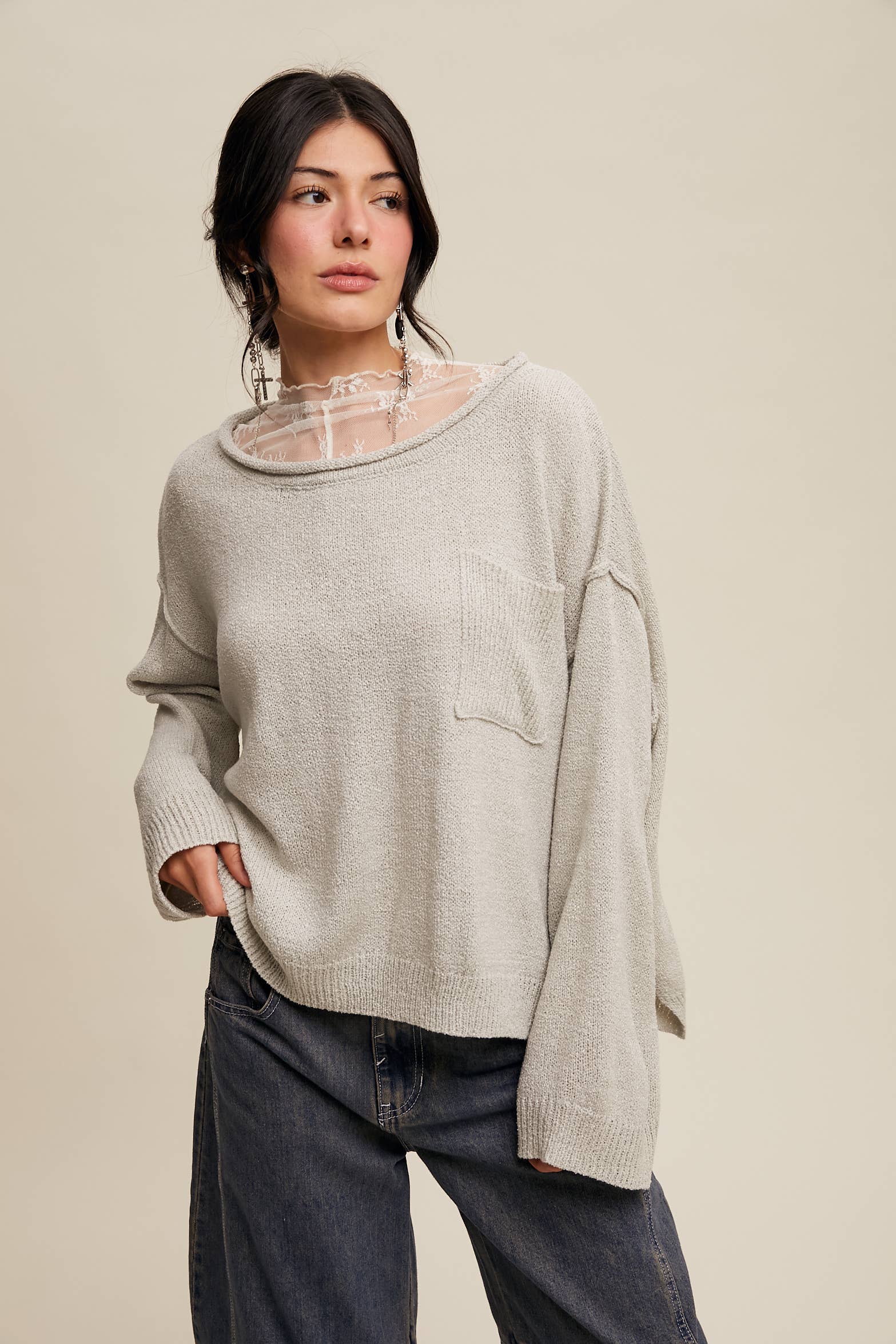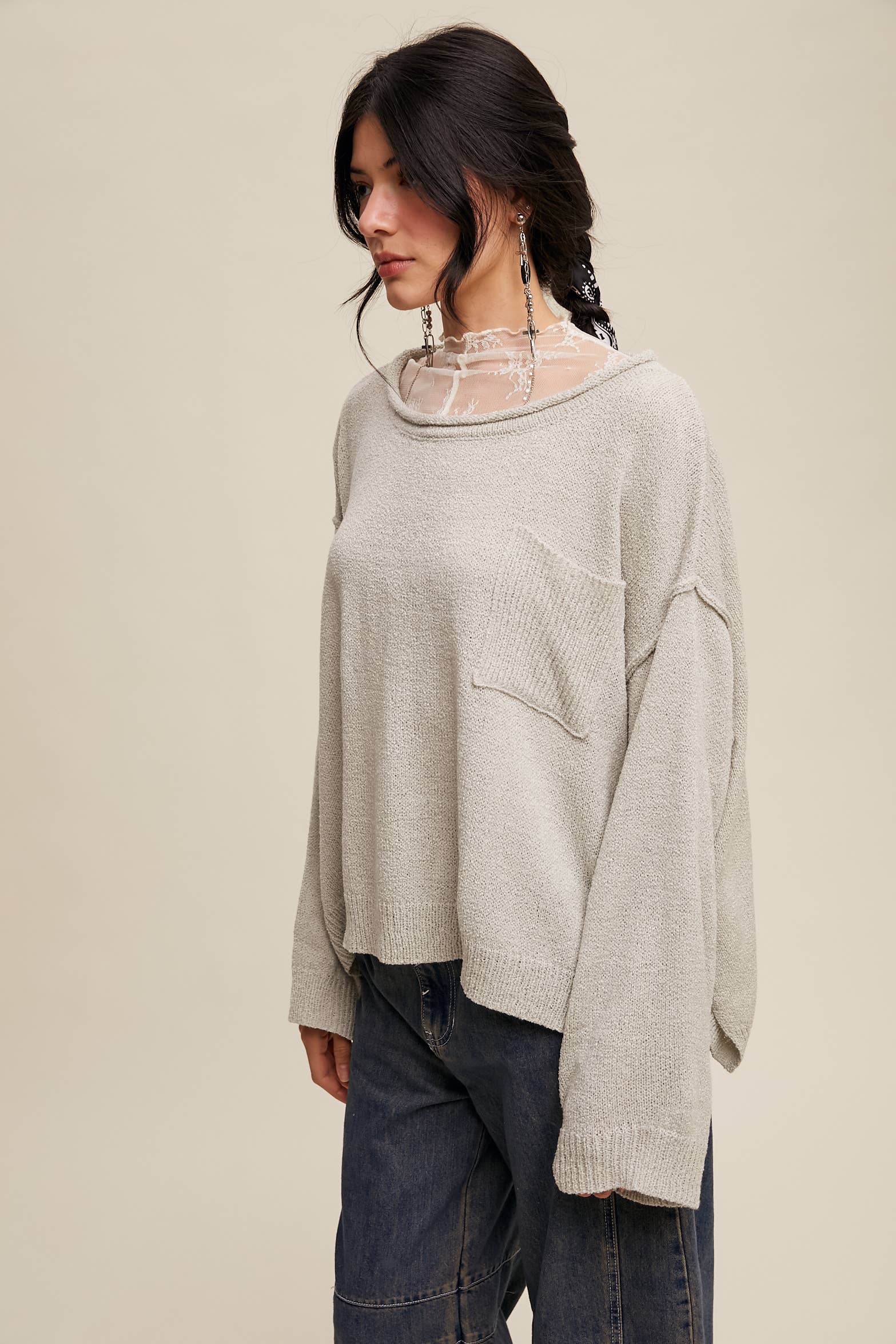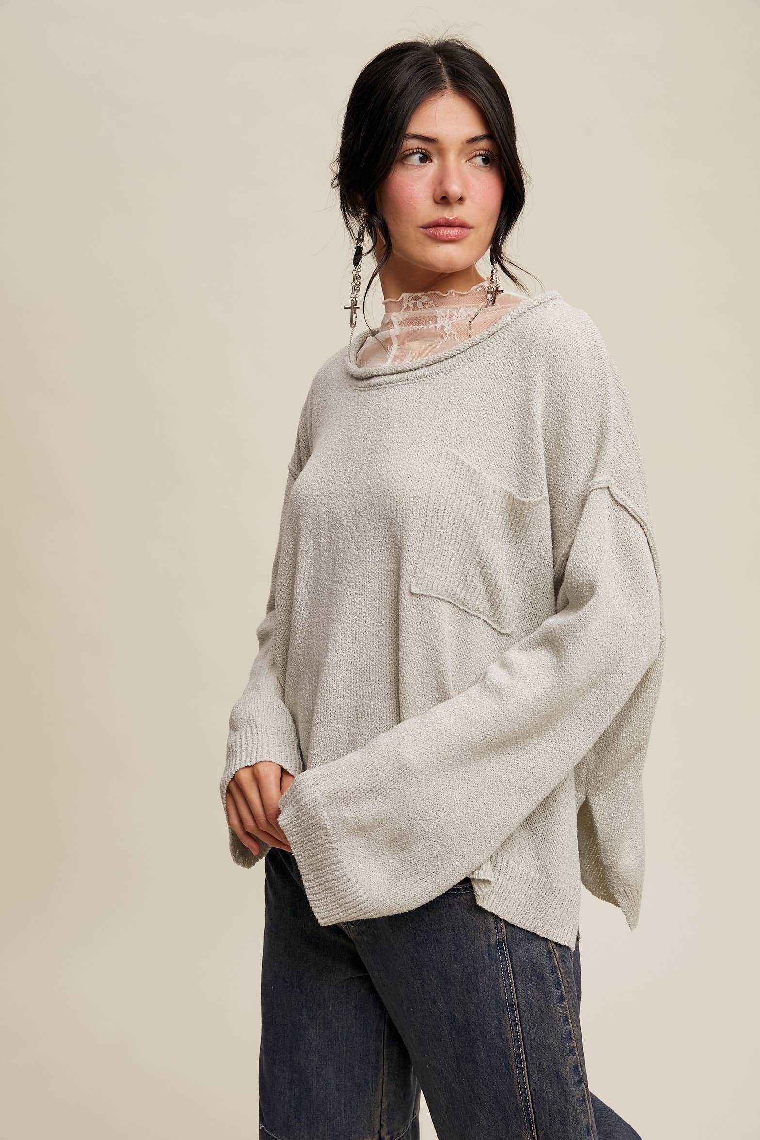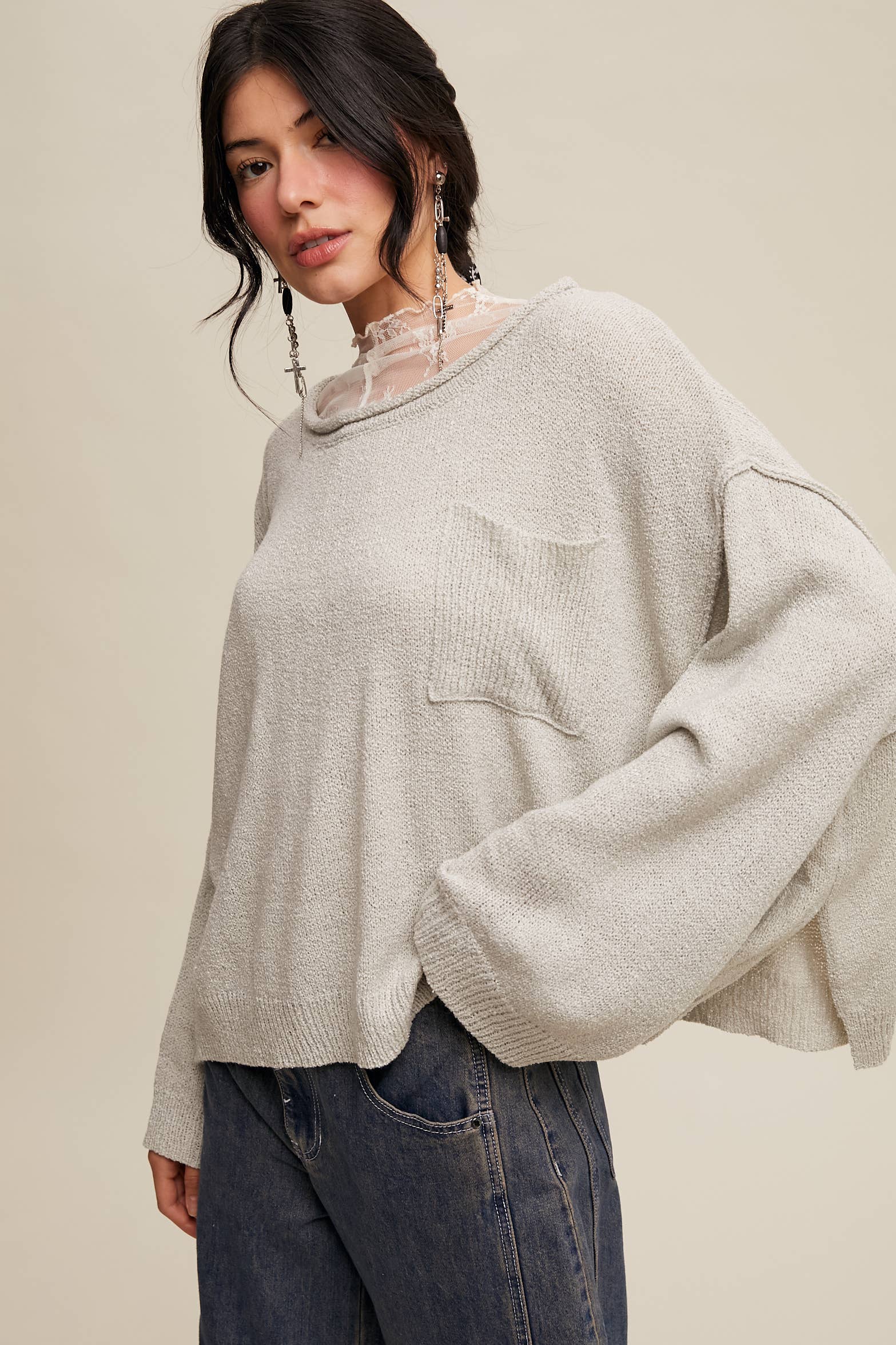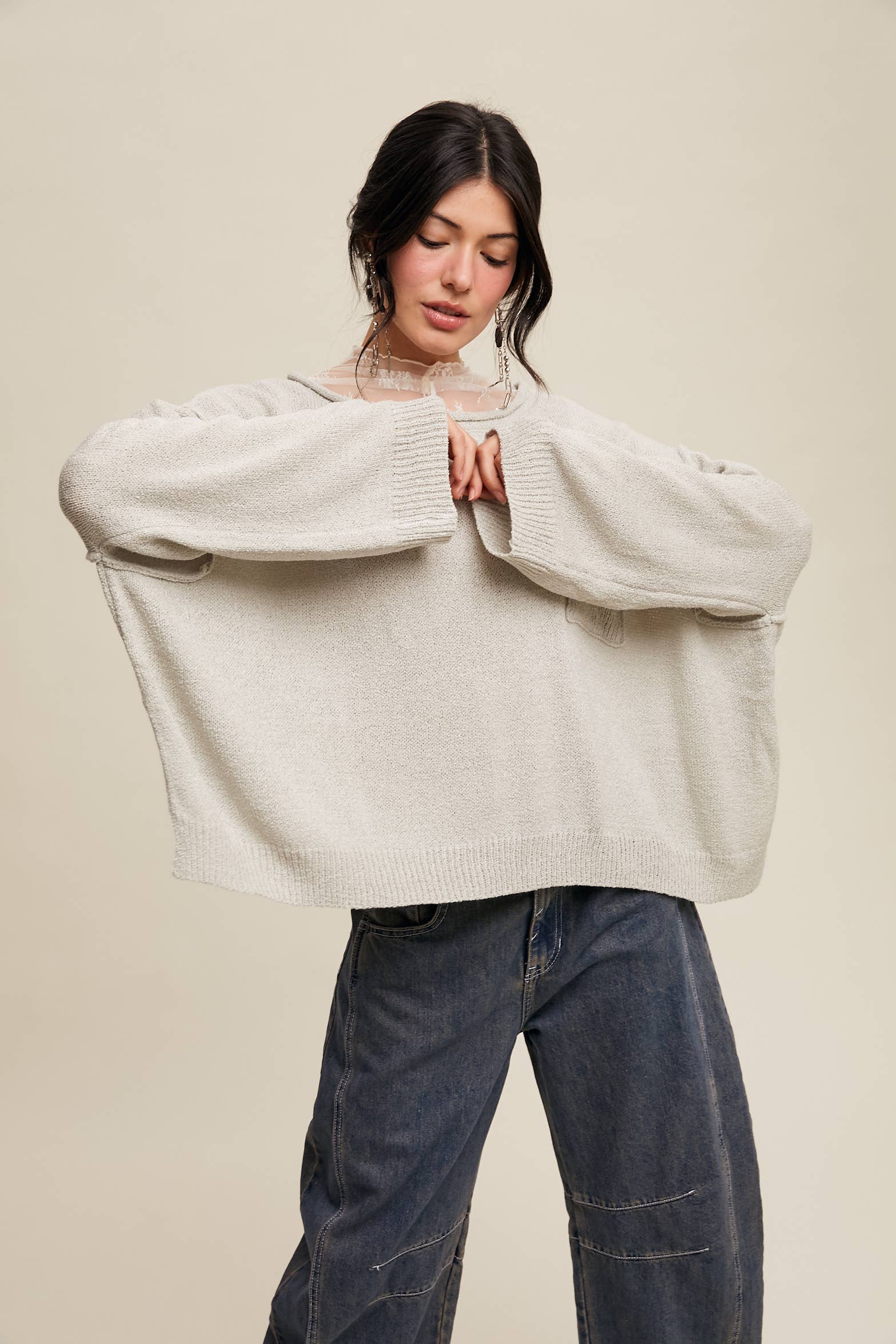 A Softly rounded neckline with raw-edge detailing for a casual, worn-in feel. It is an oversized fit, designed with a generously relaxed silhouette for an effortlessly cool, slouchy look. Subtle ribbed patch pocket adds dimension and laid-back charm. The dropped shoulder seams enhances the relaxed vibe with extended sleeves and easy movement. This cozy knit pullover delivers relaxed charm and everyday comfort with just the right hint of vintage edge.
