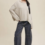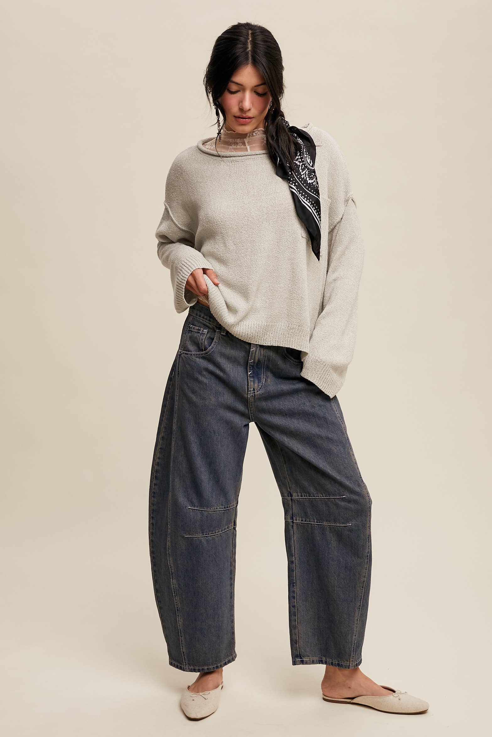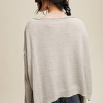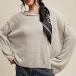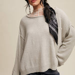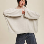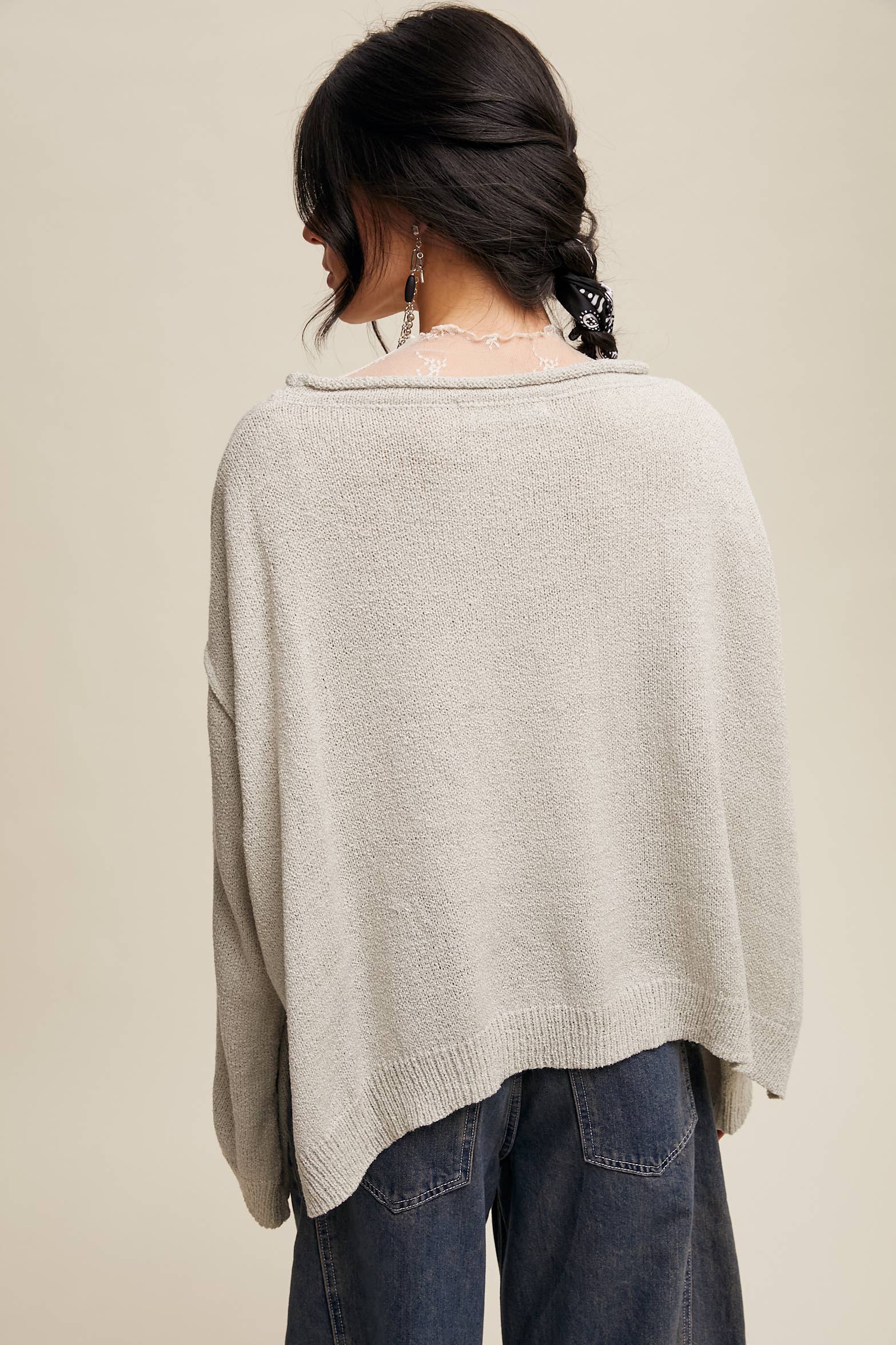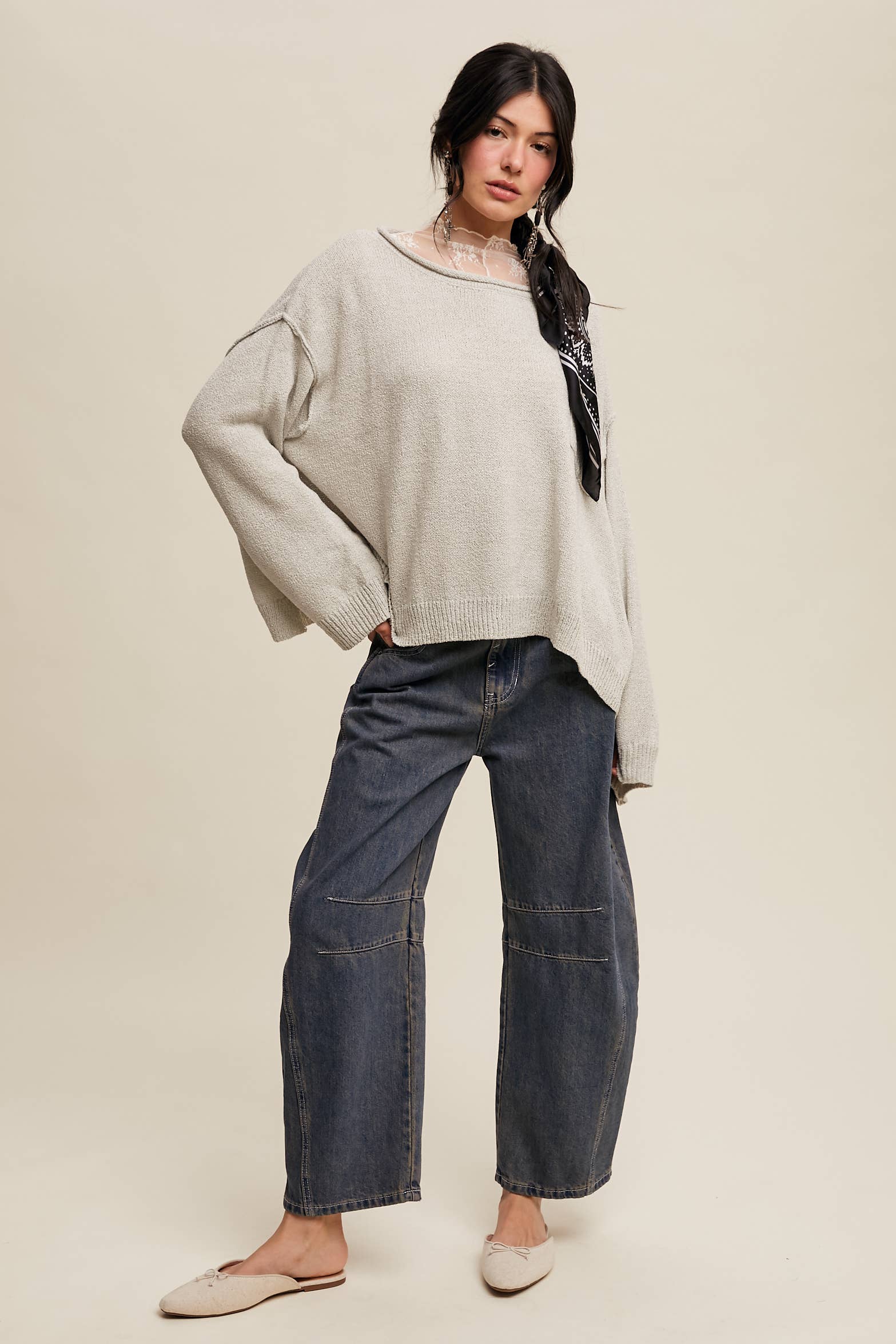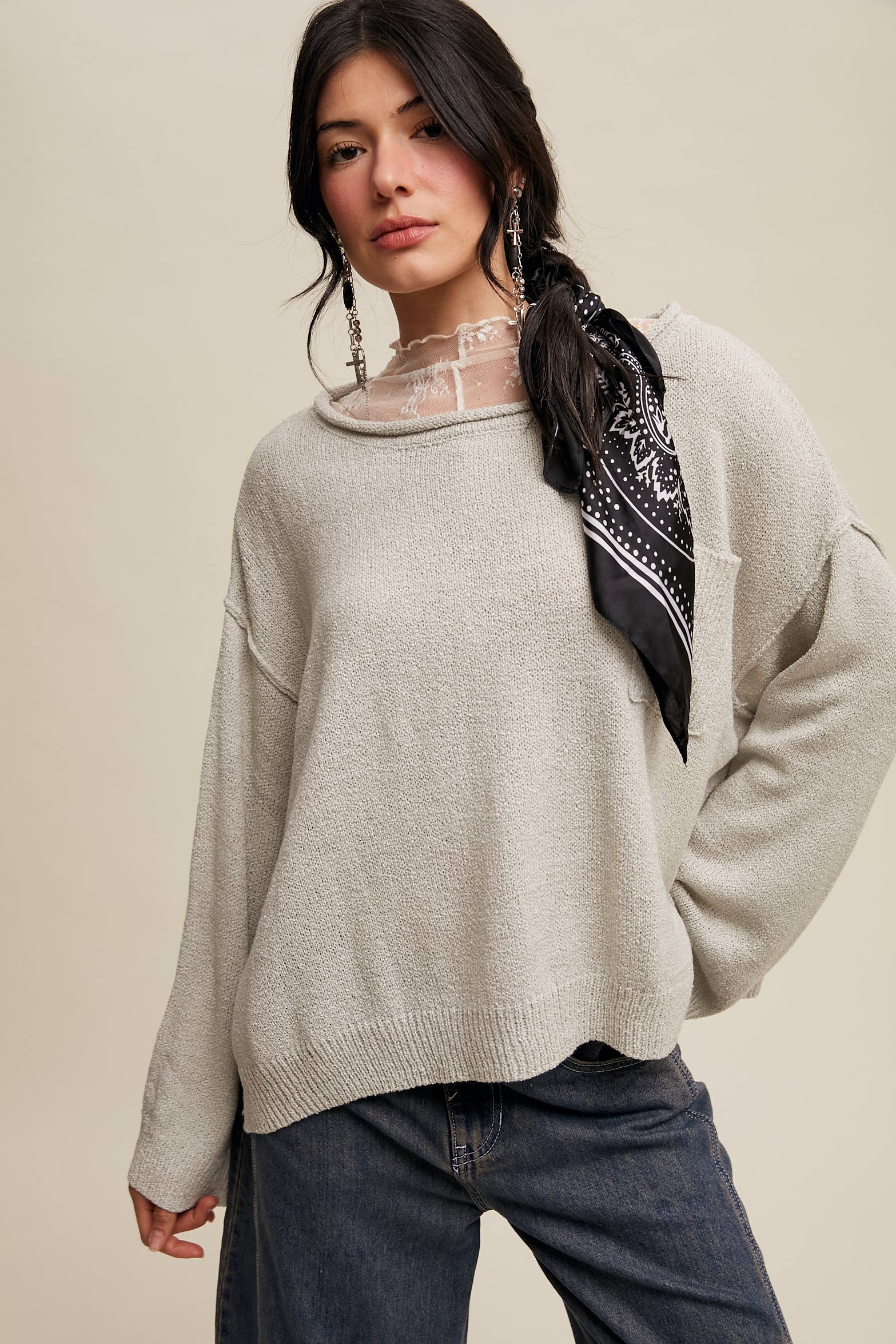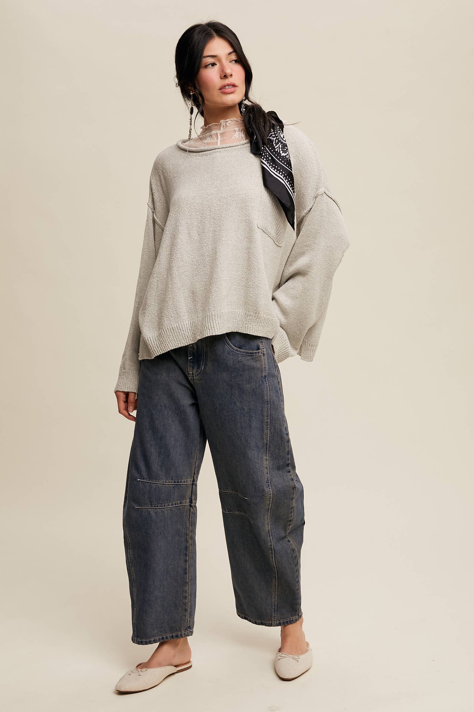 A Softly rounded neckline with raw-edge detailing for a casual, worn-in feel. It is an oversized fit, designed with a generously relaxed silhouette for an effortlessly cool, slouchy look. Subtle ribbed patch pocket adds dimension and laid-back charm. The dropped shoulder seams enhances the relaxed vibe with extended sleeves and easy movement. This cozy knit pullover delivers relaxed charm and everyday comfort with just the right hint of vintage edge.
