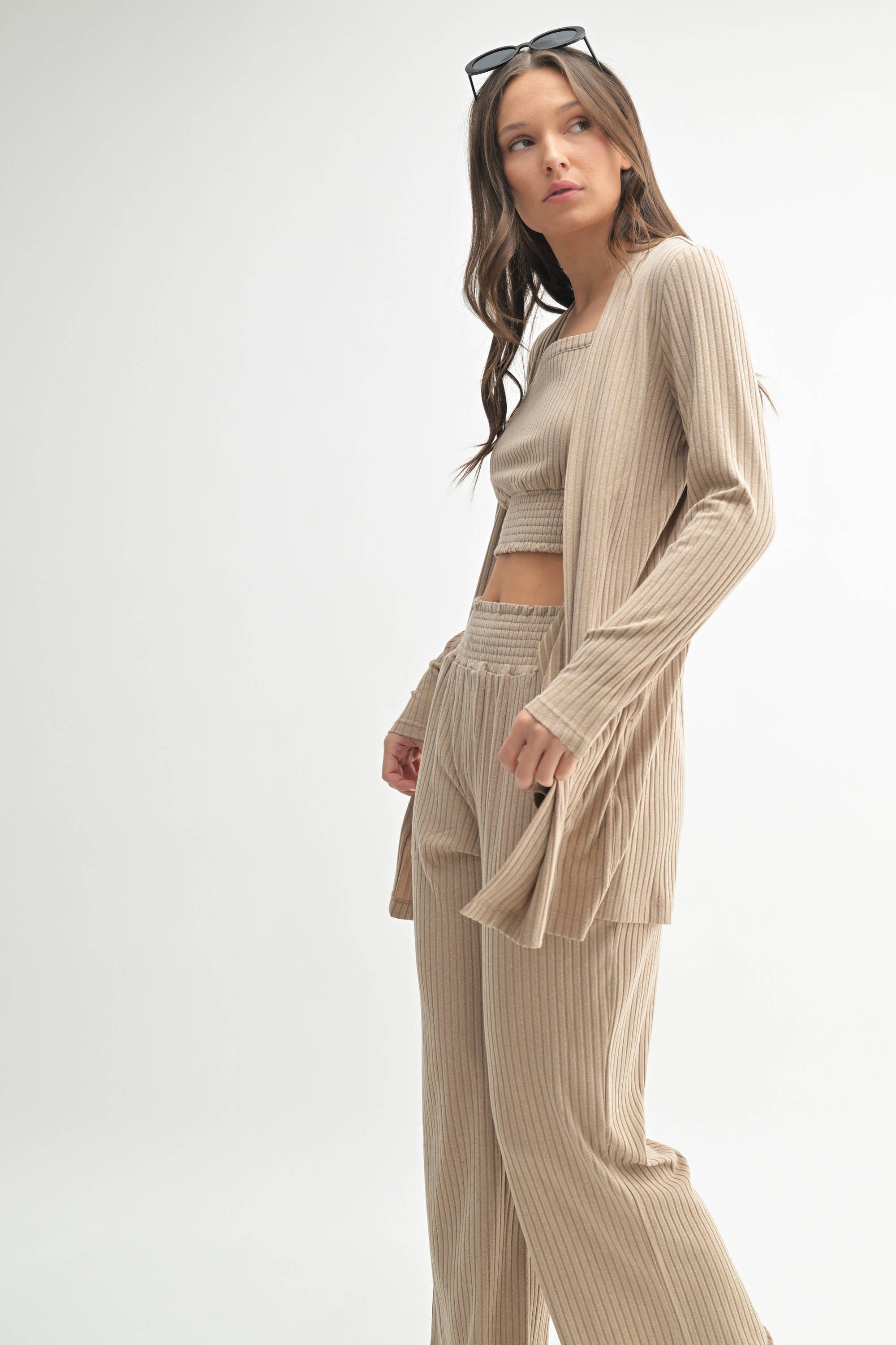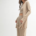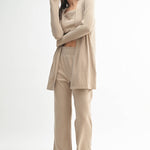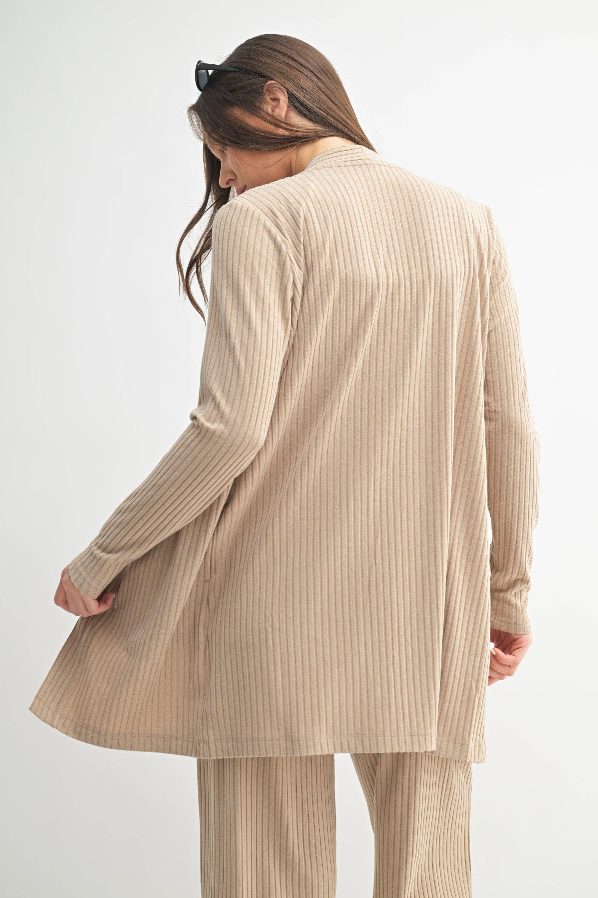 Perfect for cozy days at home or casual outings, this longline cardigan offers both comfort and sophistication. Crafted from a luxuriously soft ribbed fabric, this cardigan drapes beautifully for a flattering silhouette. Featuring convenient side inseam pockets, it combines practicality with effortless style.