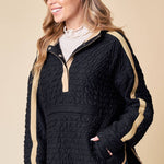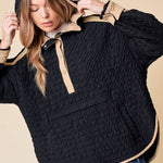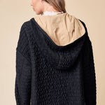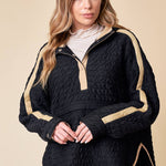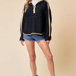 The Striped Quilted Hood Top features a soft quilted texture and a relaxed, oversized fit for all-day comfort. Its long sleeves with ribbed cuffs make it perfect for layering on cooler days. Made from a cotton and spandex blend, it offers gentle stretch while keeping you cozy and stylish.