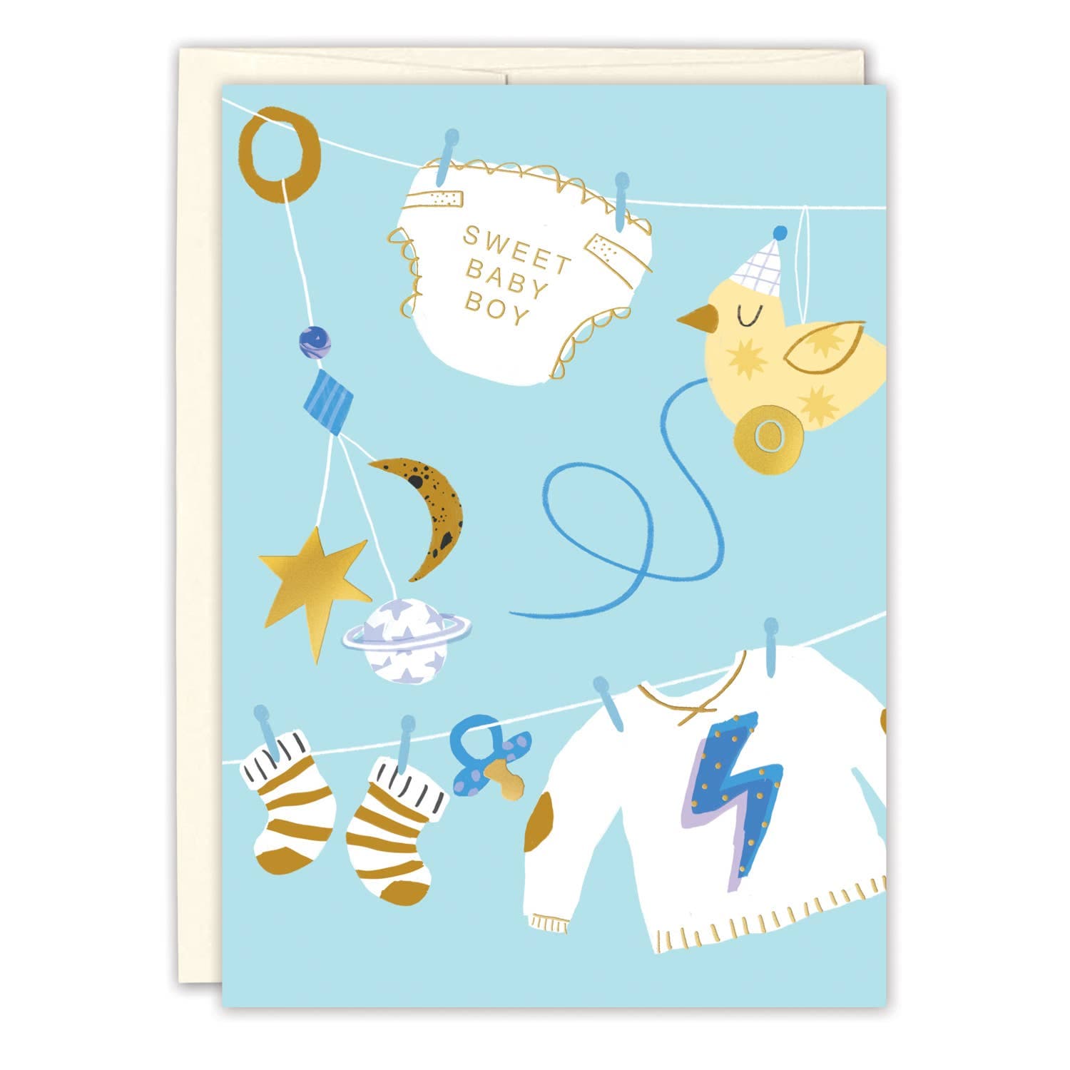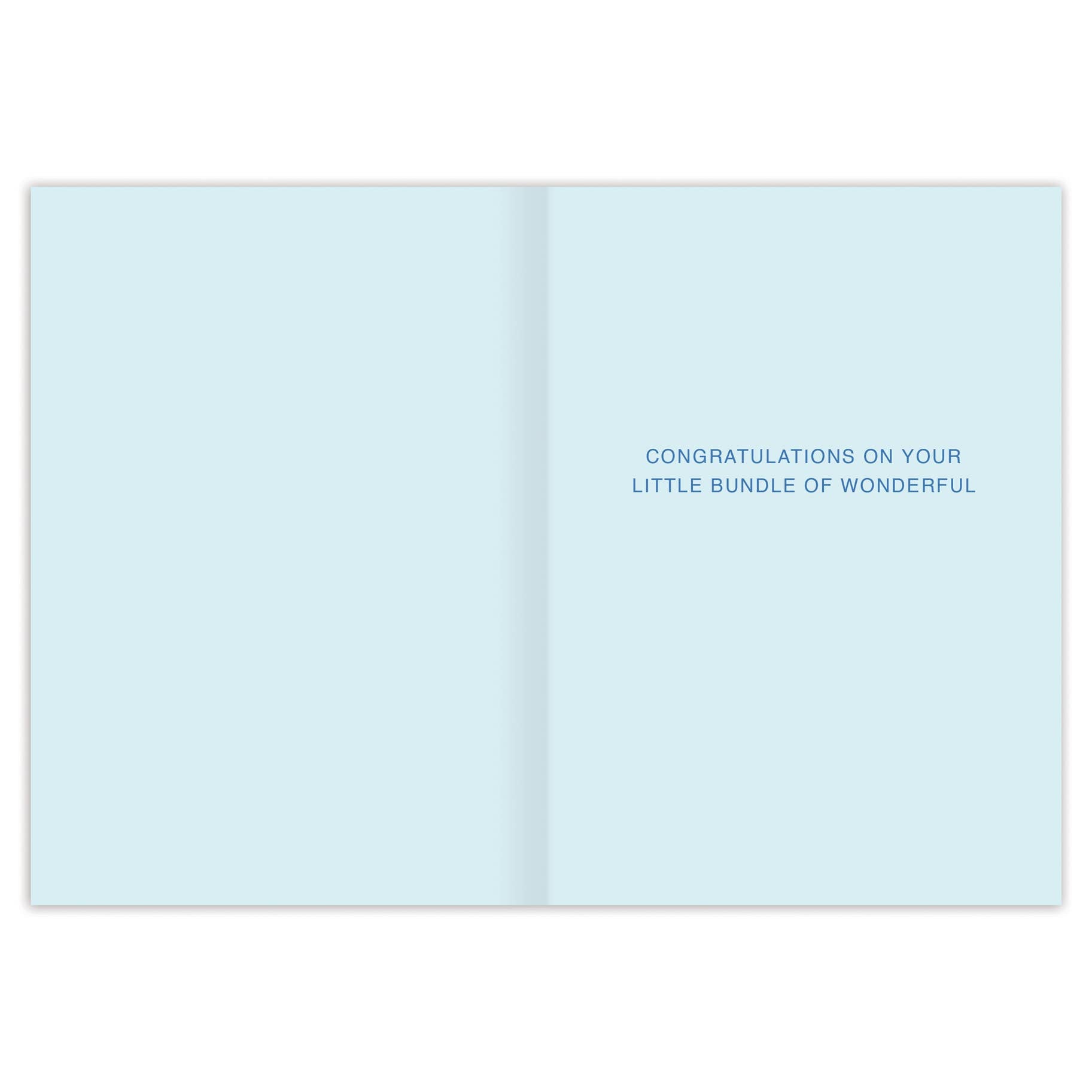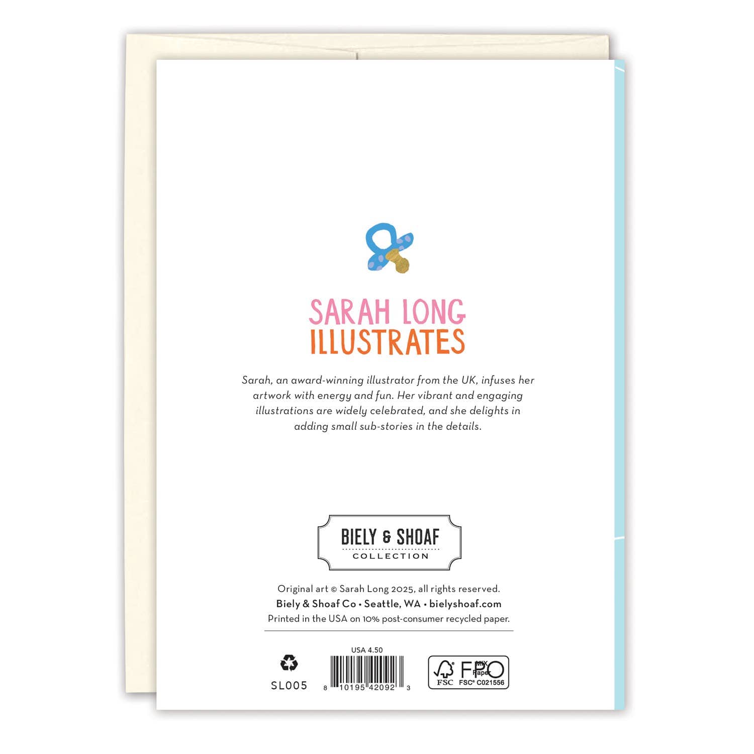 Inside verse: Congratulations on your little bundle of wonderful   • Gold foil details • Illustrated by Sarah Long • Pre-priced • Size: A6, 4.5" x 6.25" • Paired with a Warm White envelope • Printed in the USA on beautiful FSC-certified 10% post-consumer waste recycled paper. • By default cards come without cello packaging. Cello can be added to your order using our cello listing for an additional $0.25 each. • For FREE cello on your first order, please put "FREECELLO" in your order PO, or send us a message! About the artist: Sarah Long, an award-winning illustrator from the UK, infuses her artwork with energy and fun. Her vibrant and engaging illustrations are widely celebrated, and she delights in adding small sub-stories in the details.