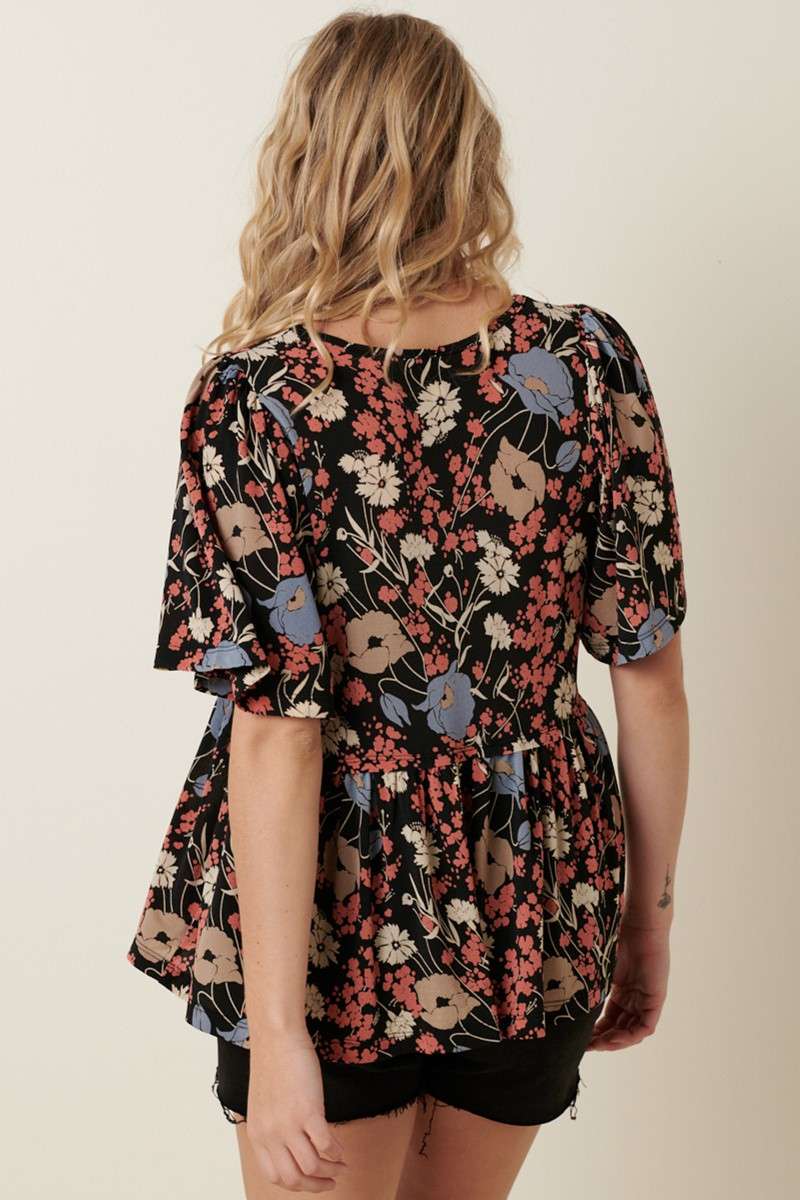 FLOWER PRINT V-NECK BABY DOLL KNIT BLOUSE