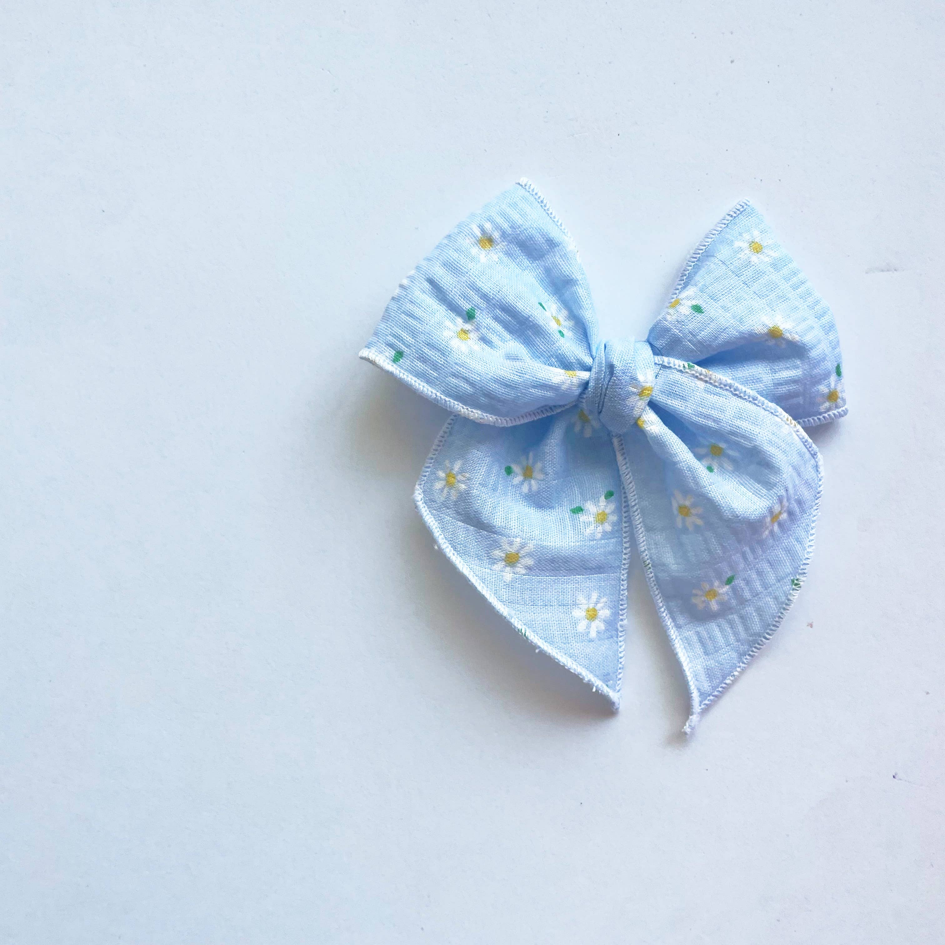 The Vintage Blue Daisy Bow is hand-cut and sewn. Pattern placement will vary which makes each bow unique. Colors may vary from what you see on your screen.